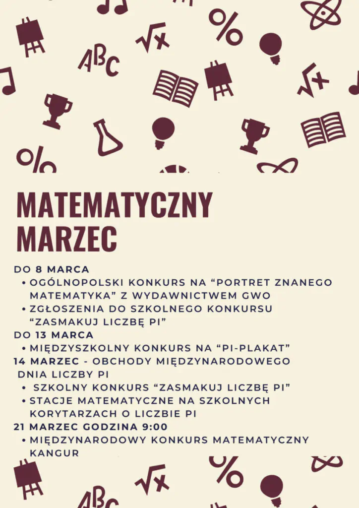 Z uwagi na wiele wydarzeń matematycznych w marcu, udostępniamy informacje z datami wydarzeń, konkursów i terminów zgłaszania i oddawania prac konkursowych.