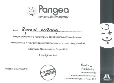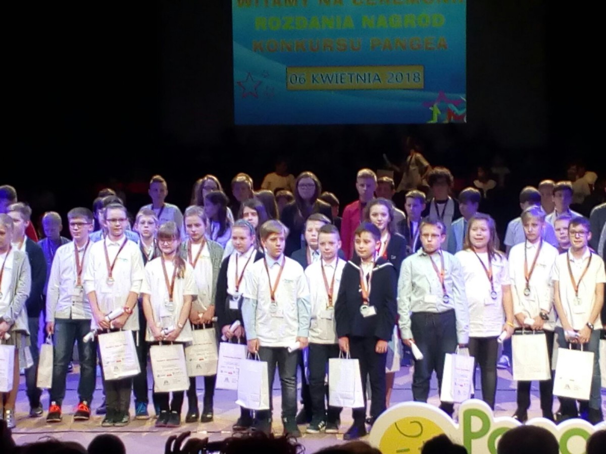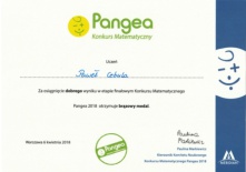 Podczas finału Międzynarodowego Konkursu Matematycznego Pangea, uczeń kl.V Paweł Cebula znalazł się w gronie finalistów. Jest to niebywałe osiągnięcie, gdyż zajął 17 miejsce na 101036 uczniów z 3490 szkół. Paweł został uhonorowany brązowym medalem oraz otrzymał możliwość kontynuowania nauki w Międzynarodowej Szkole Meridian w Warszawie. Szczególne podziękowania należą się panu Ryszardowi Kołodziejowi,nauczycielowi matematyki w naszej szkole, który dostrzegł matematyczny potencjał Pawła.