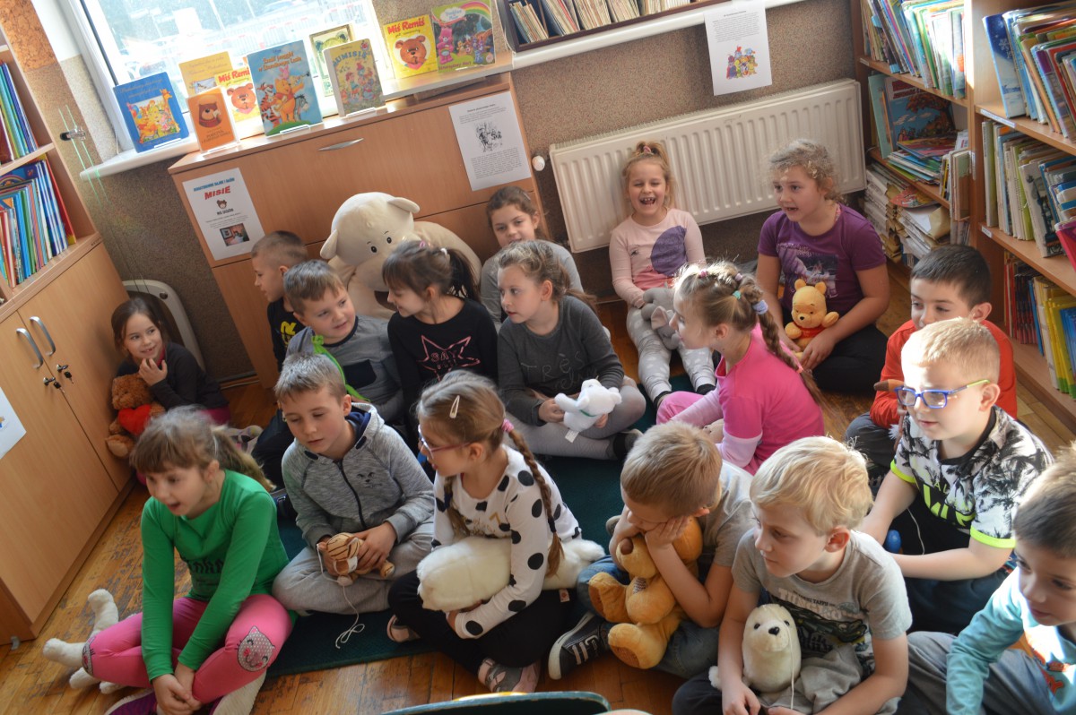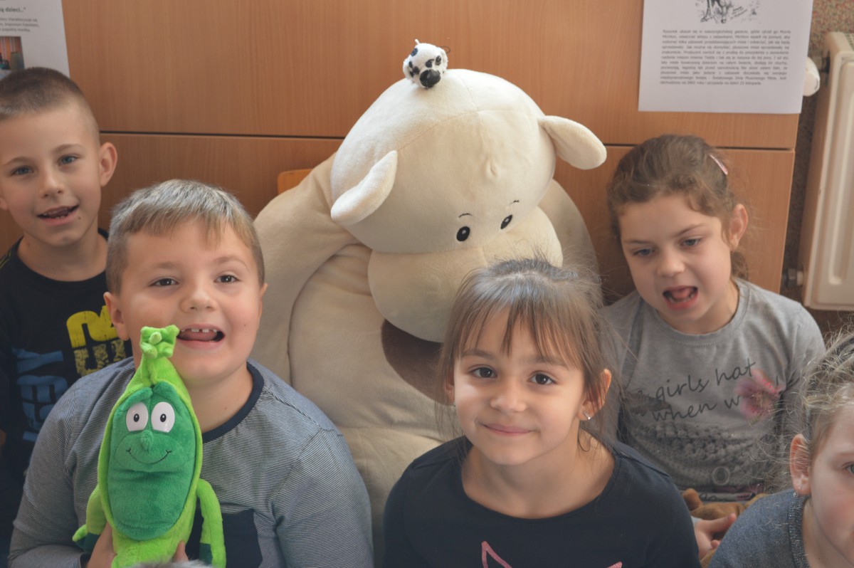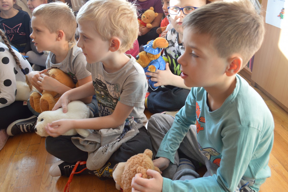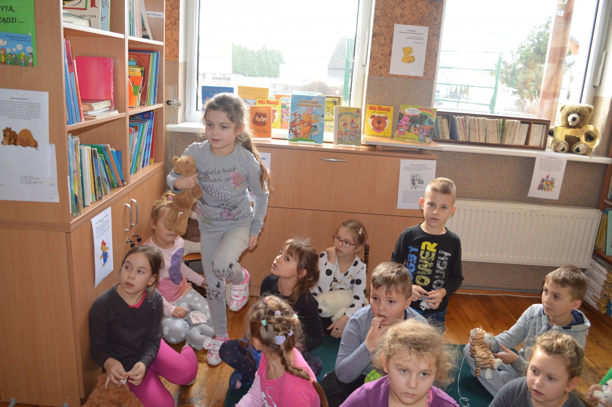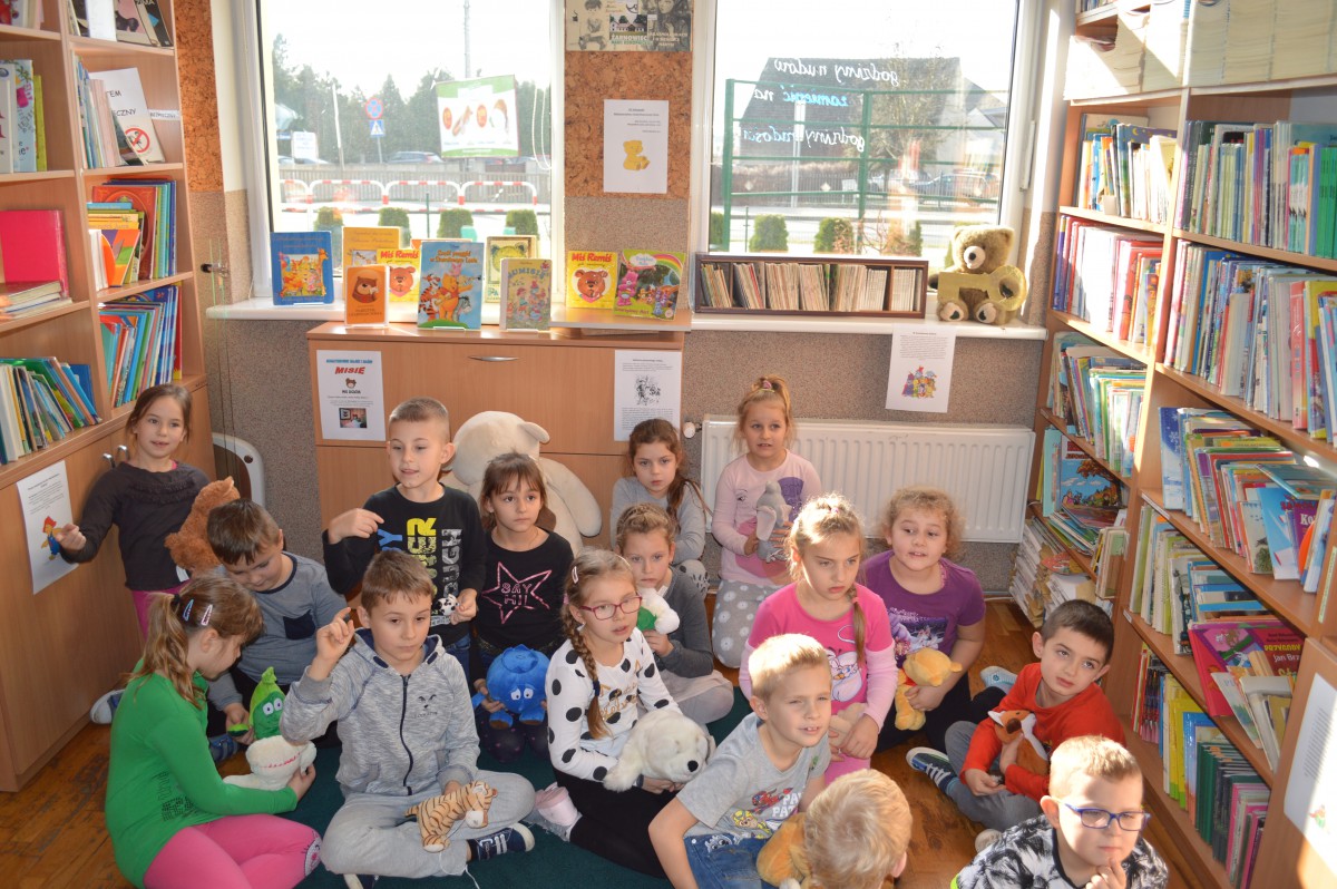 Obchody Międzynarodowego Dnia Pluszowego Misia stały się okazją, aby uczniowie klasy I szkoły podstawowej wspólnie odwiedzili szkolną bibliotekę. Przywitał ich tak niemały pluszak, który obchodził swoje święto. Pierwszaki również przynieśli swoje, ulubione misie. Z ogromnym zaciekawieniem wysłuchali historii pluszowego misia. Wyszukiwali informacji o misiowych bohaterach bajek zamieszczonych w różnych miejscach biblioteki. Niektóre misie, jak Kubuś Puchatek były doskonale znane, o innych z chęcią wysłuchali, np. o Colargolu czy Misiu Uszatku.