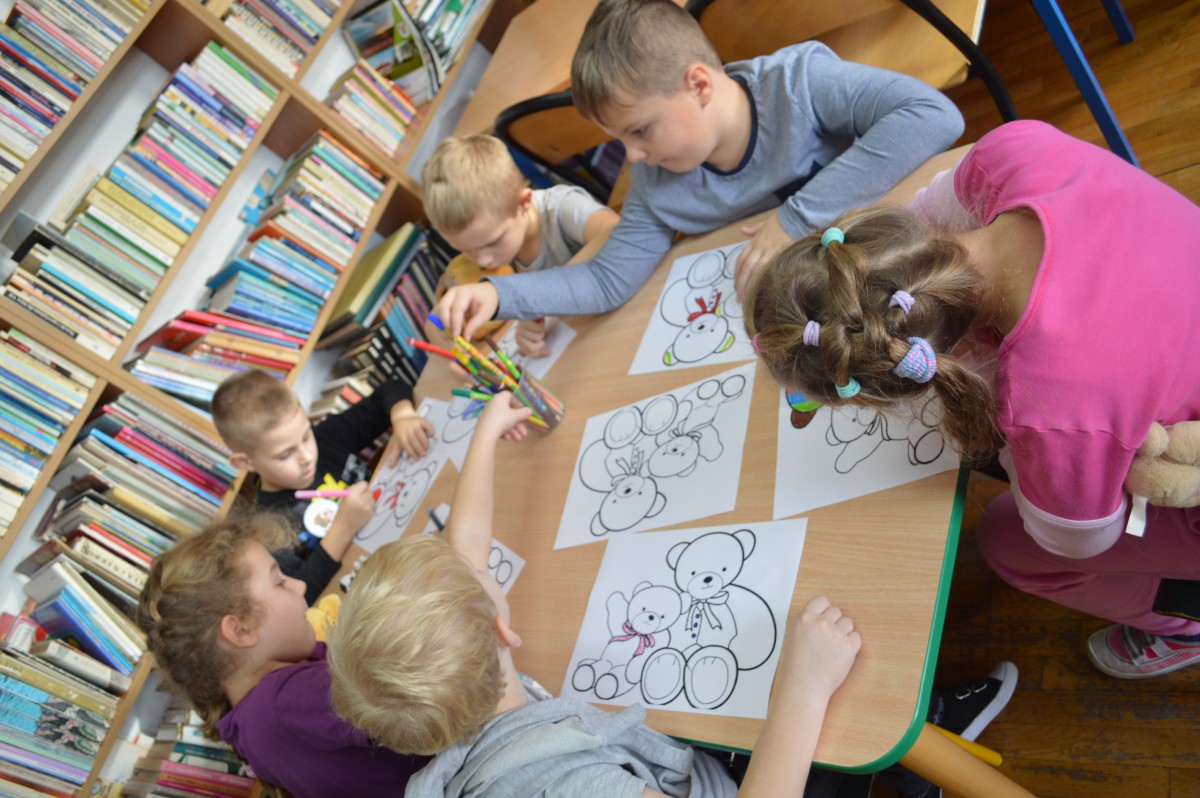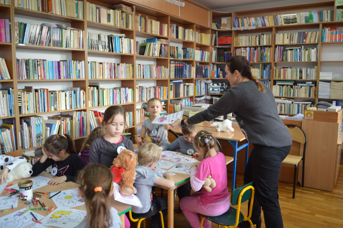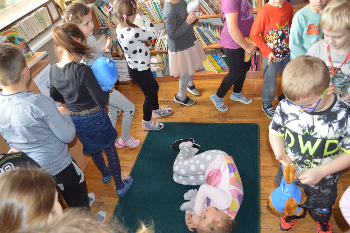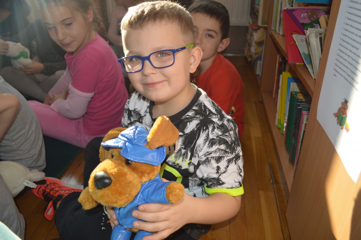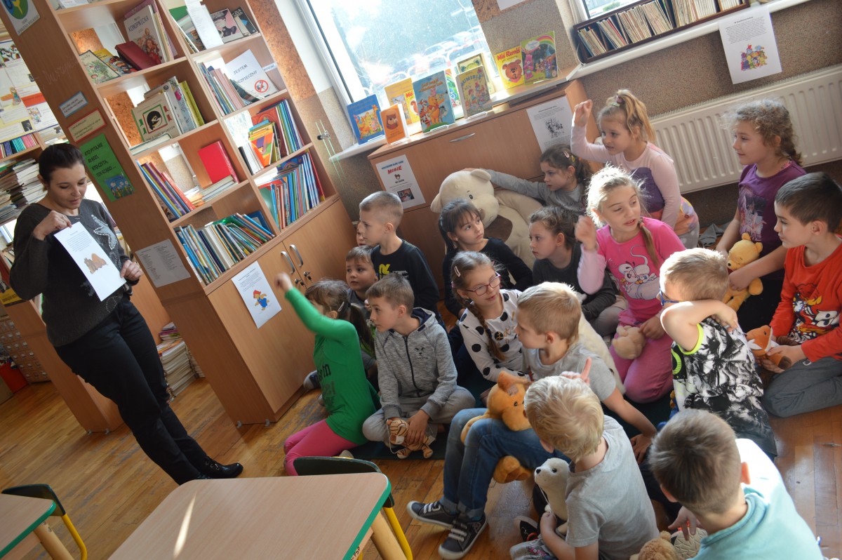 Obchody Międzynarodowego Dnia Pluszowego Misia stały się okazją, aby uczniowie klasy I szkoły podstawowej wspólnie odwiedzili szkolną bibliotekę. Przywitał ich tak niemały pluszak, który obchodził swoje święto. Pierwszaki również przynieśli swoje, ulubione misie. Z ogromnym zaciekawieniem wysłuchali historii pluszowego misia. Wyszukiwali informacji o misiowych bohaterach bajek zamieszczonych w różnych miejscach biblioteki. Niektóre misie, jak Kubuś Puchatek były doskonale znane, o innych z chęcią wysłuchali, np. o Colargolu czy Misiu Uszatku.
