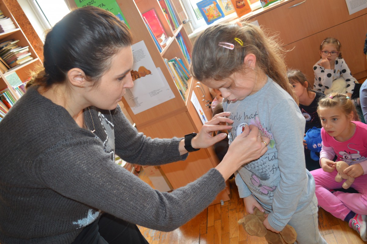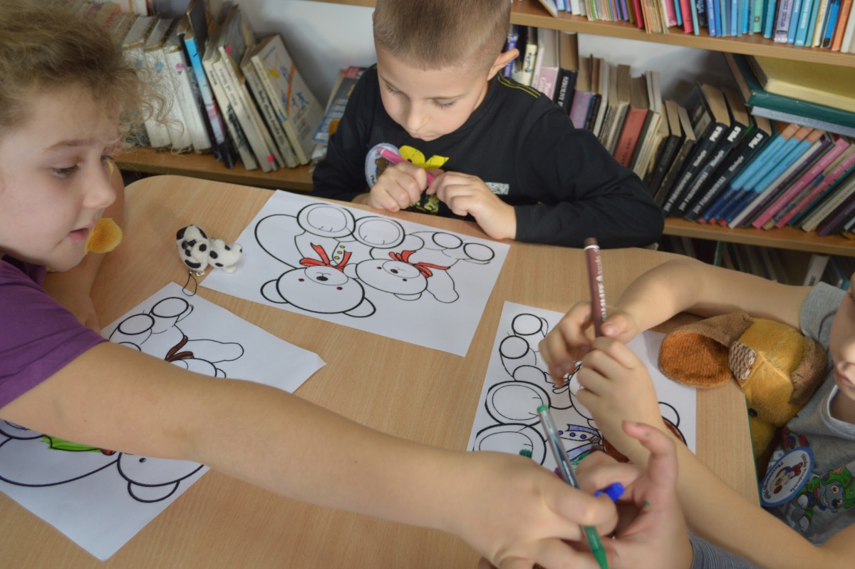 Było bardzo wesoło, kiedy śpiewali piosenkę „Jadą, jadą misie” oraz gdy bawili się w dobrze znaną, misiową zabawę „Stary niedźwiedź mocno śpi.” Na zakończenie spotkania z chęcią pokolorowali misie, a za aktywny udział w spotkaniu otrzymali dyplom przyjaciela pluszowego misia.