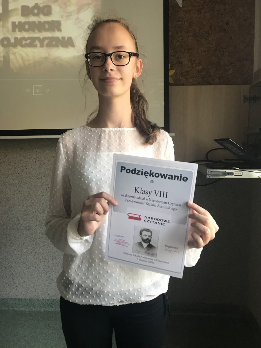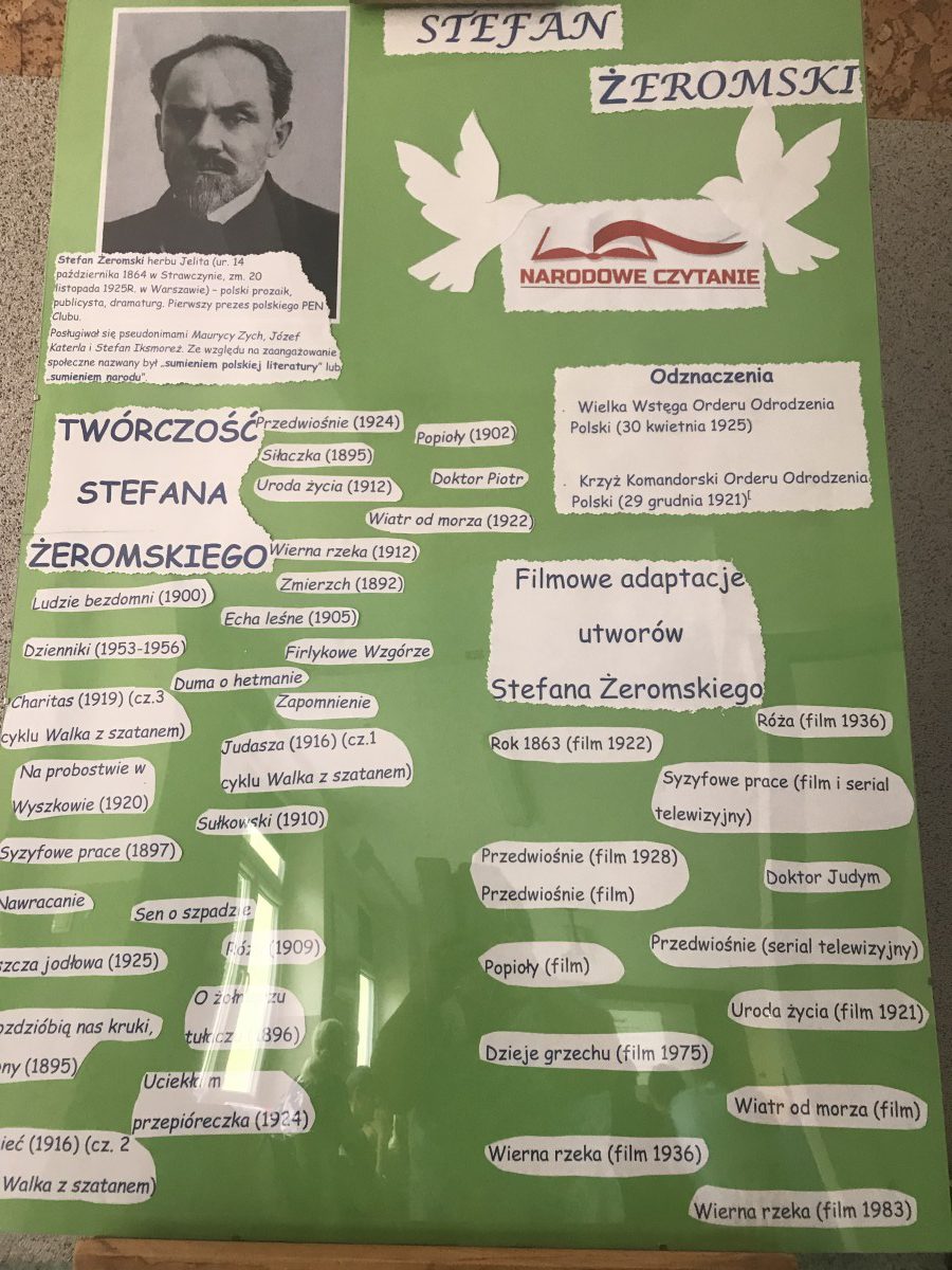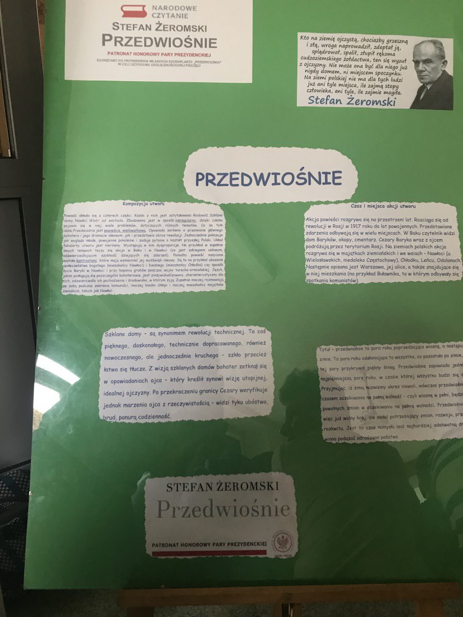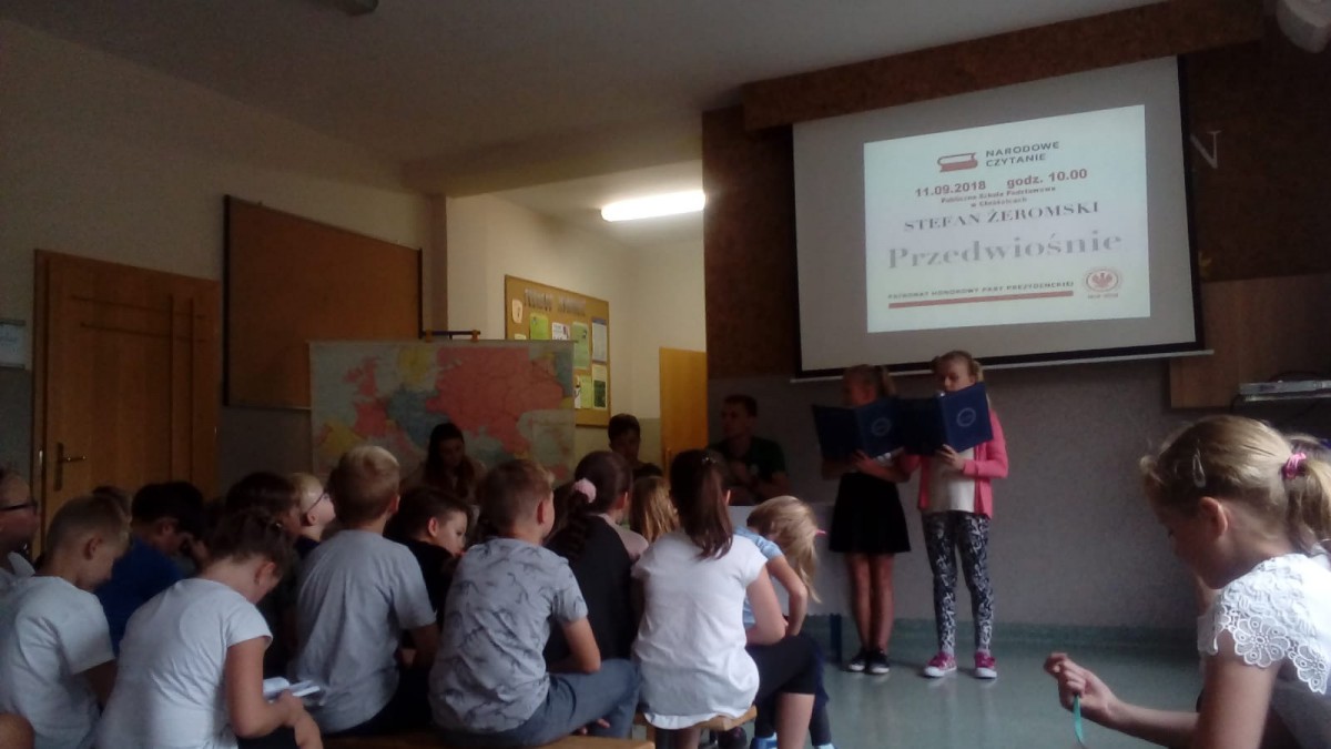 Fragmenty utworu Żeromskiego zostały odczytane przez nauczycieli naszej szkoły. Nauczyciele wychowania fizycznego odczytali fragment o „szklanych domach”, a uczennice z klasy Va oraz klasy VIII pięknie recytowały wybrane utwory z Antologii Niepodległości: „Moja piosnka (II)” Cypriana Kamila Norwida oraz „Pieśń o domu” Marii Konopnickiej.