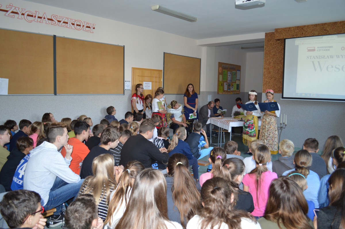 To wydarzenie zostało przybliżone poprzez odczytanie fragmentów utworu przez uczniów oraz nauczycieli naszej szkoły. Czytanie zostało wzbogacone elementami inscenizacji teatralnej, m.in. poprzez wykorzystanie ludowych strojów. Największą uwagę uczniów klas młodszych skupiła postać Chochoła, który w akcie trzecim wypowiada znamienne słowa: „Miałeś, chamie, złoty róg”. Pieśń Chochoła kończąca „Wesele” została również wysłuchana w wykonaniu Czesława Niemena, będąca fragmentem filmu „Wesele” w reż. Andrzeja Wajdy.