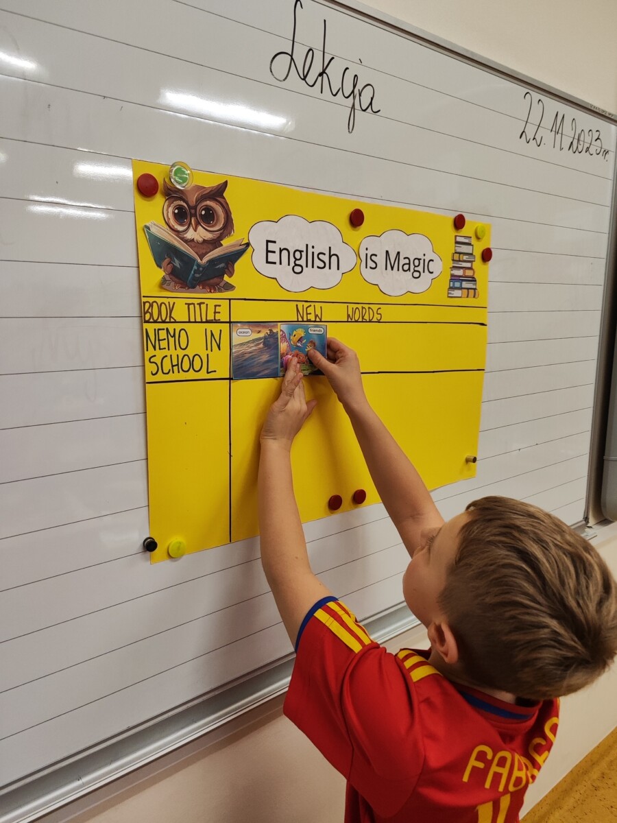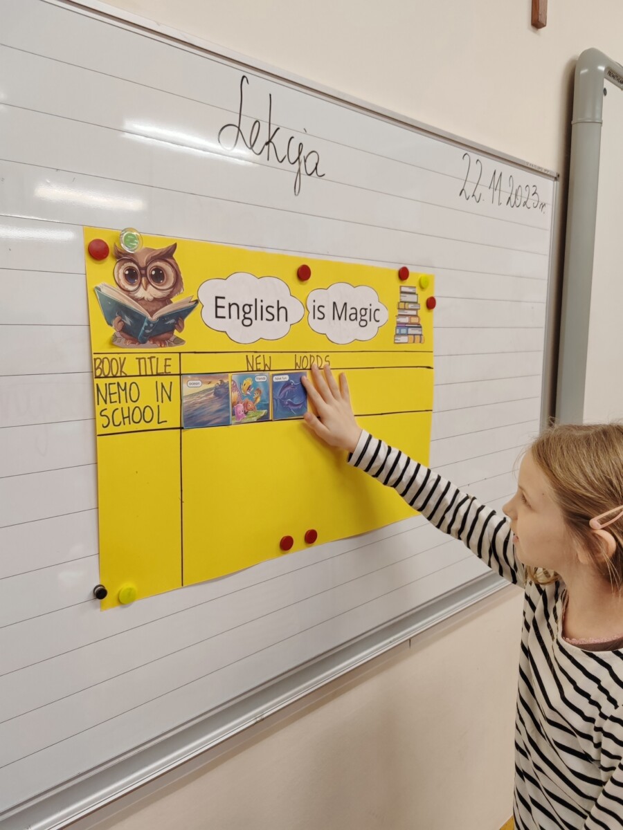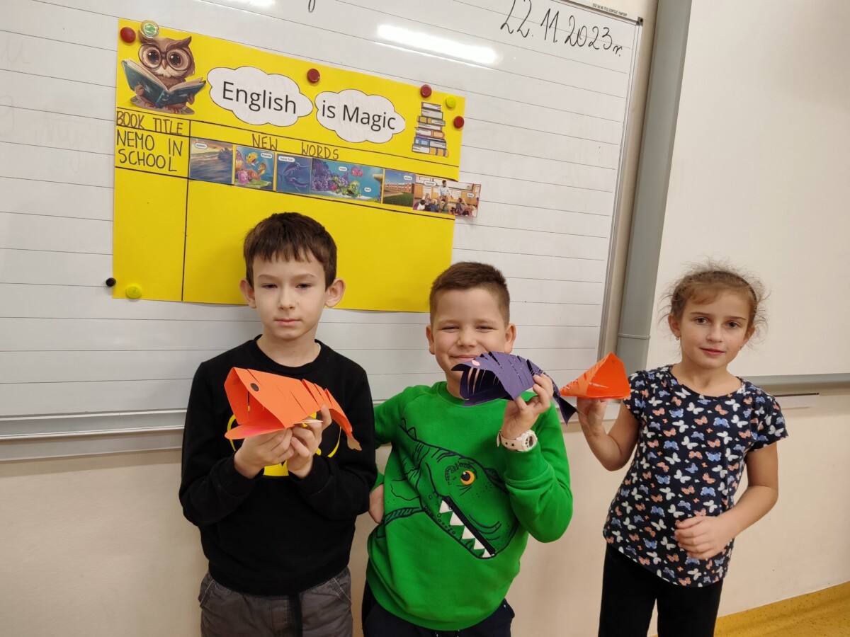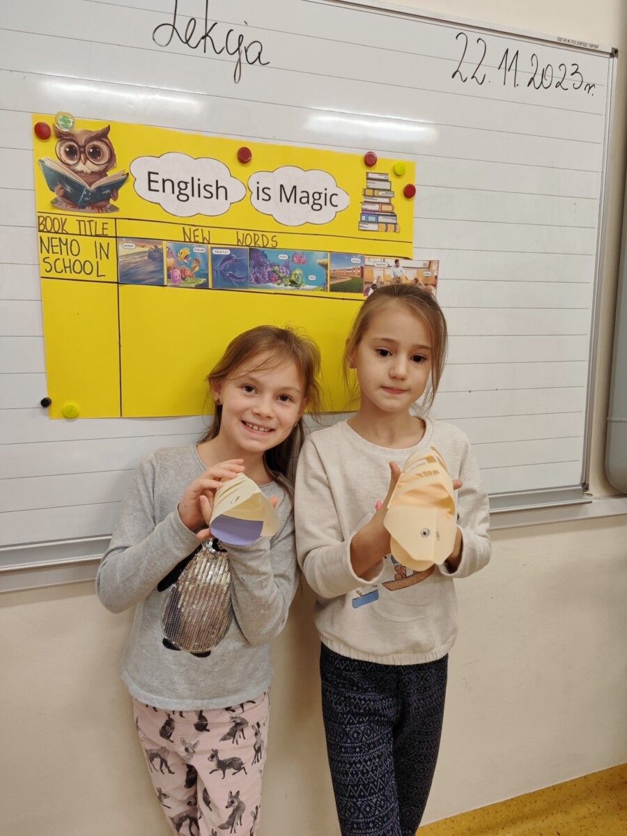 Klasa druga w ramach realizacji innowacji pedagogicznej „English is Magic” przeniosła się do pierwszej serii magicznego świata bajek i opowiadań Disneya. Uczniowie wysłuchali historyjki „Nemo in School” czytanej przez nauczyciela a następnie każdy z nich miał okazję przeczytać fragment książki. W ramach podsumowania pierwszej przeczytanej lektury uczniowie uzupełnili plakat, na którym zostały umieszczone wybrane przez nich nowe słówka. Uczniowie zaangażowali się również w projekt plastyczny, w którym każdy z nich wykonał rybę przypominającą Nemo z lektury.