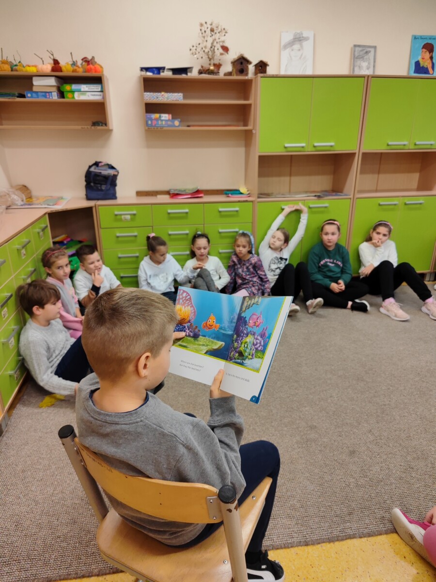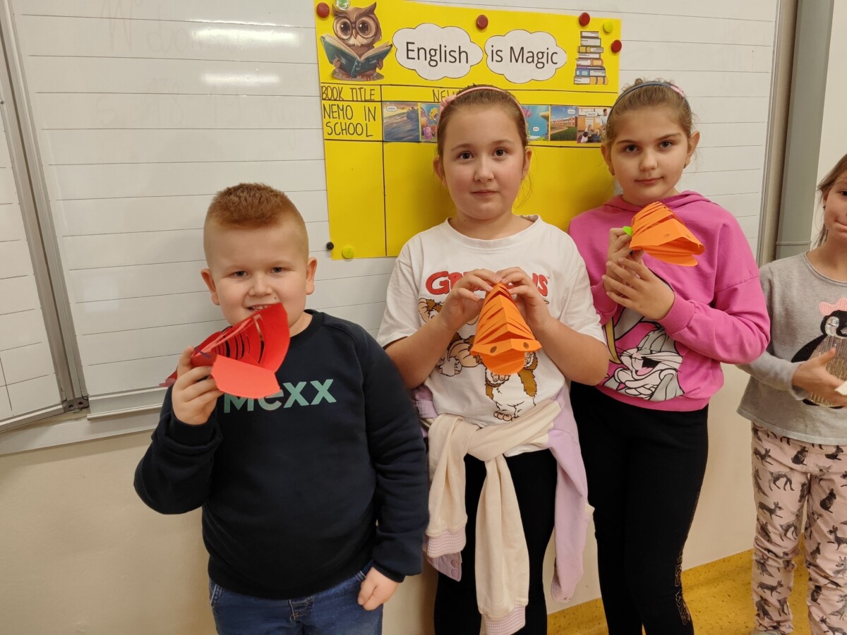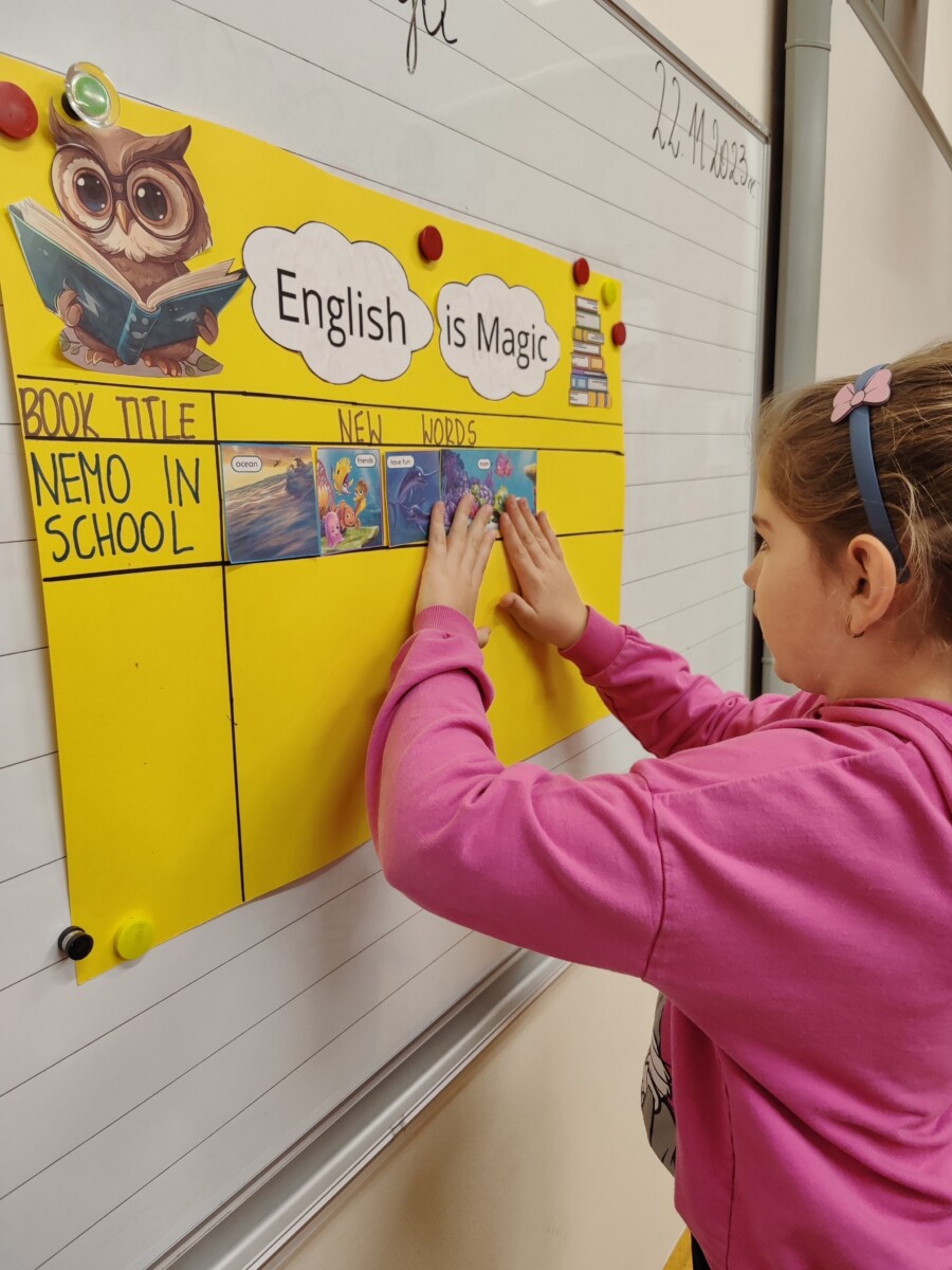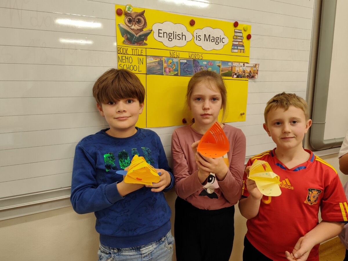 Klasa druga w ramach realizacji innowacji pedagogicznej „English is Magic” przeniosła się do pierwszej serii magicznego świata bajek i opowiadań Disneya. Uczniowie wysłuchali historyjki „Nemo in School” czytanej przez nauczyciela a następnie każdy z nich miał okazję przeczytać fragment książki. W ramach podsumowania pierwszej przeczytanej lektury uczniowie uzupełnili plakat, na którym zostały umieszczone wybrane przez nich nowe słówka. Uczniowie zaangażowali się również w projekt plastyczny, w którym każdy z nich wykonał rybę przypominającą Nemo z lektury.