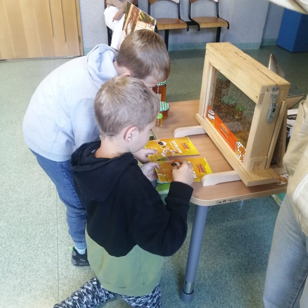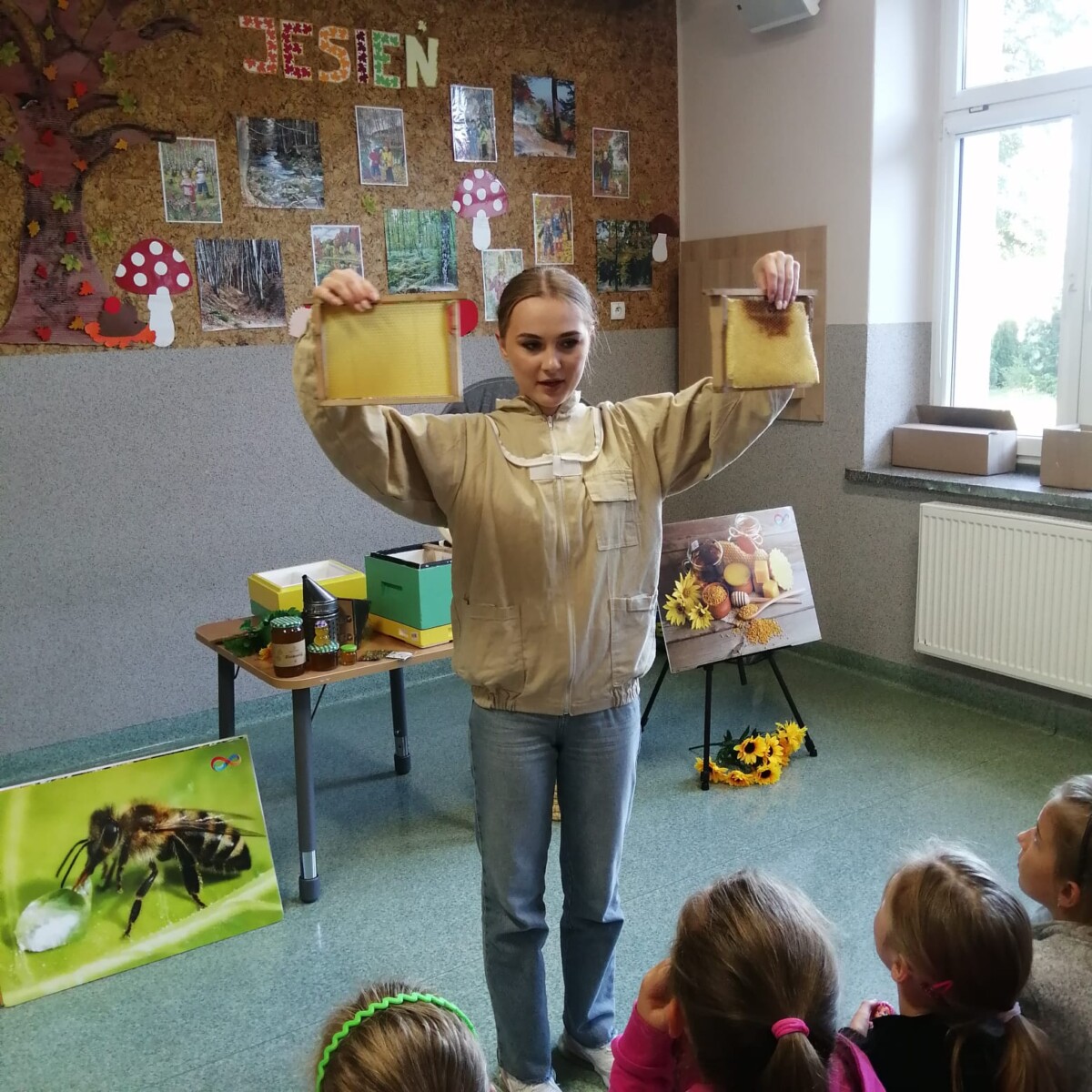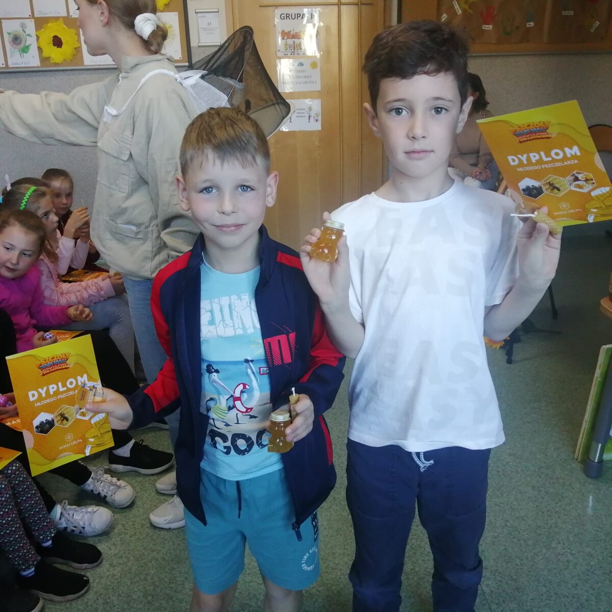 pszczół, czyli robotnice. Zbierają nektar, odkładają w plastry. Gdy jest już dojrzały, wybiera go pszczelarz i jest z tego pyszny miód. Bardzo podobały mi się te warsztaty. Na koniec każdy dostał mały słoik miodu i dyplom.