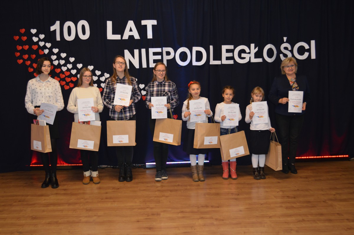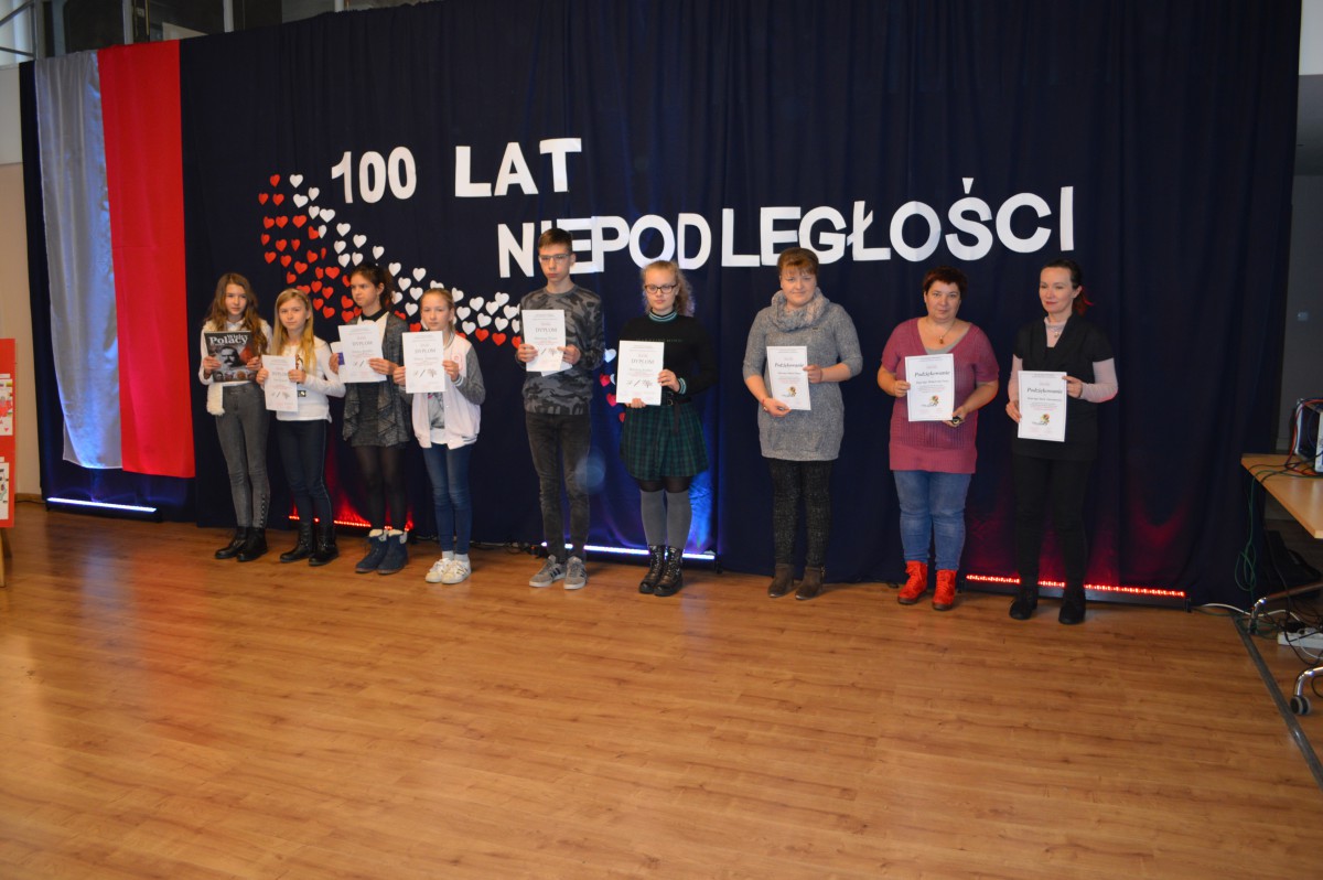 Równocześnie w murach szkoły odbył się Międzygminny Konkurs Historyczny „Sto lat dla Polski”. Miał on formę gry edukacyjnej, podczas której uczestnicy analizowali teksty źródłowe, pracowali z mapą, źródłami ikonograficznymi i materiałami audiowizualnymi. Komisja konkursowa w składzie Panie: Małgorzata Frącz, Donata Bieniek przyznała nagrody rzeczowe następującym drużynom: Aron Kobienia i Oliwier Gajda oraz Martyna Sochor i Mateusz Wosz.