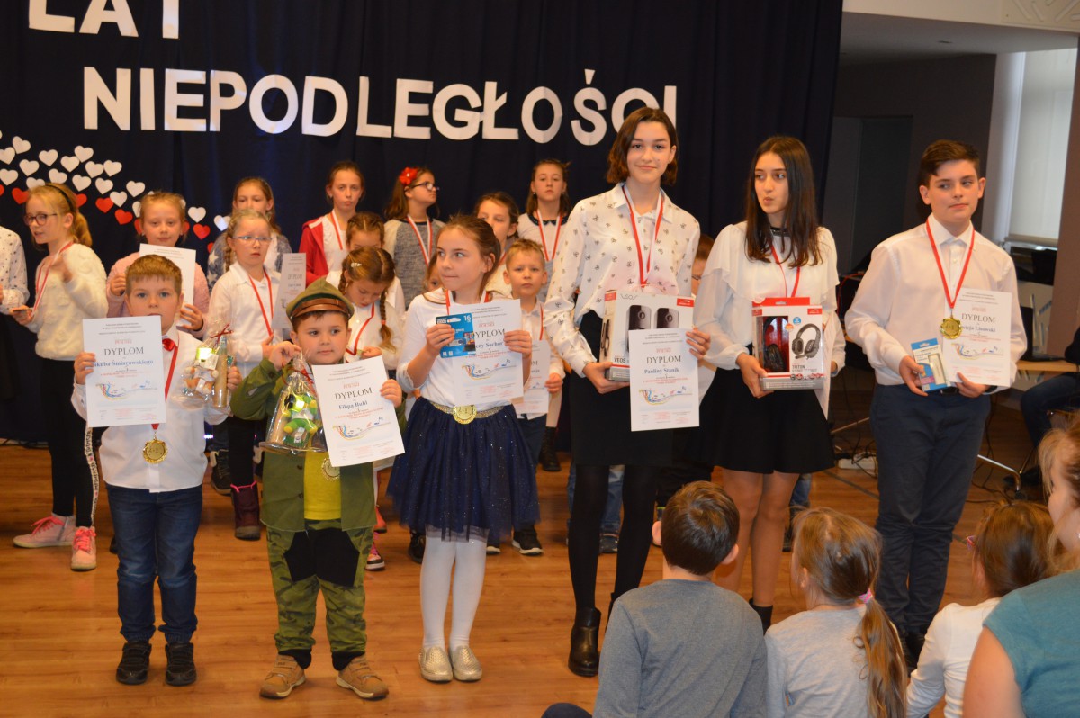 Kolejnym wydarzeniem był Konkurs Piosenki Patriotycznej, w którym oprócz uczniów naszej szkoły wzięły udział dzieci w Niepublicznego Katolickiego Przedszkola w Chróścicach. Zgromadzona liczna publiczność wysłuchała najpopularniejszych piosenek z okresu II wojny światowej. Występy zakończyły się wspólnym zaśpiewaniem piosenki „Co to jest niepodległość”. Jury w składzie: Dyrektor szkoły Pani Renata Dąbrowska, s. Agnieszka Kapij oraz Pani Anna Skrzipietz przyznało 20 złotych medali, 15 srebrnych oraz 6 nagród rzeczowych, które otrzymali: Filip Buhl i Kuba Śmiarowski z chróścickiej ;Ochronki oraz Milena Sochor, Maciej Lisowski, Paulina Stanik, Wiktoria Opała, którzy reprezentowali naszą szkołę.