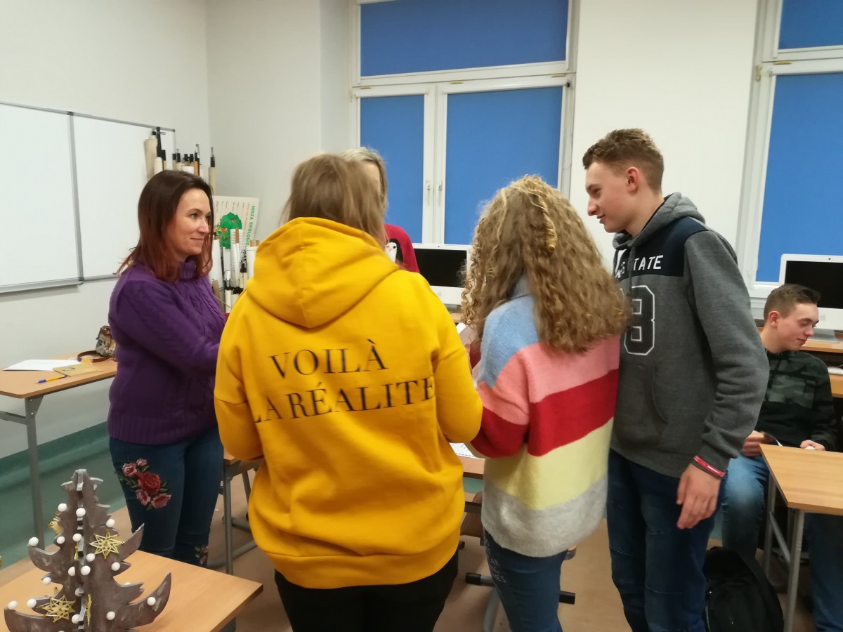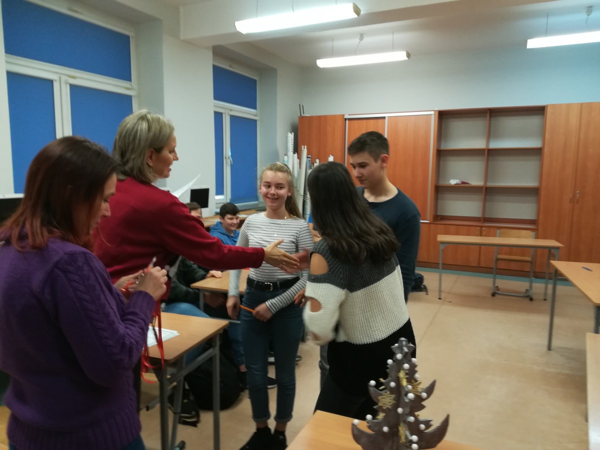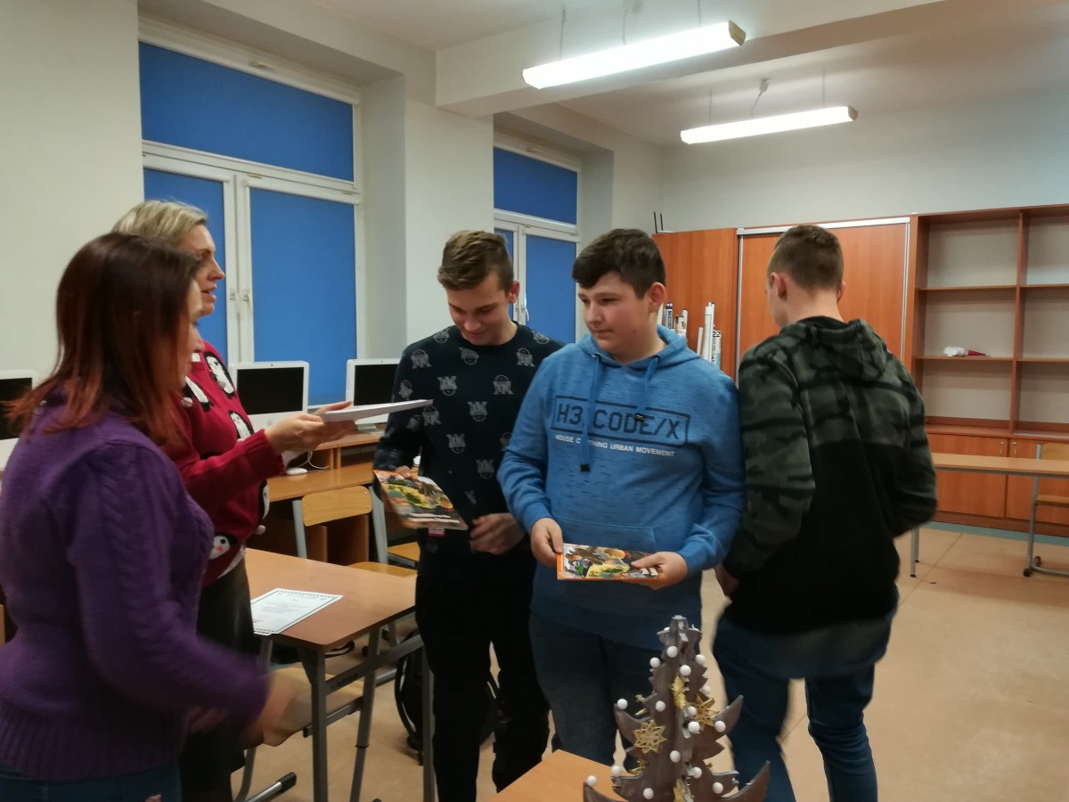 Jury w składzie: Daria Giewanowicz, Katarzyna Czechowska oraz Justyna Kasprzyk-Ressel wnikliwie oceniało rywalizację zespołów. Laureatem konkursu został zespół klasy 3 PG – w składzie: Martyna Sochor, Aleksandra Andruszko, Łukasz Malek. Zwycięska drużyna w nagrodę otrzymała nagrody książkowe. Pozostałe drużyny otrzymały dyplomy i świąteczne gadżety. Konkurs przeprowadziła Daria Giewanowicz w języku polskim a w języku angielskim – Katarzyna Czechowska.