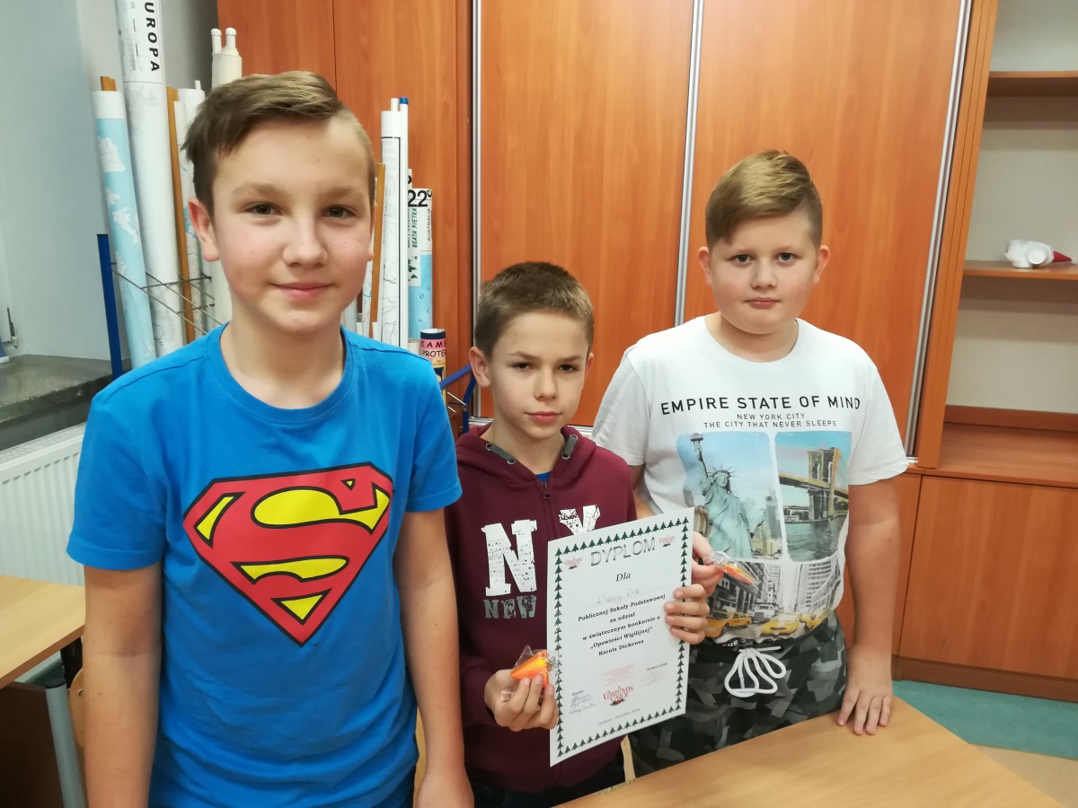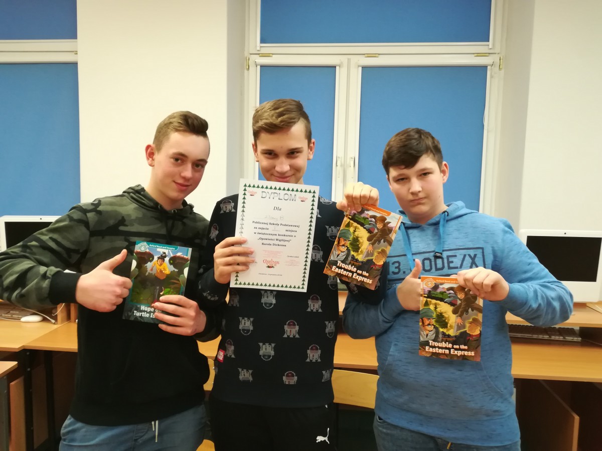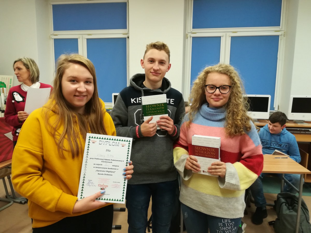 19.12.2018 z okazji zbliżających się świąt Bożego Narodzenia został zorganizowany konkurs ze znajomości lektury „Opowieść wigilijna” – Charlesa Dickensa oraz tradycji i obyczajów bożonarodzeniowych. W konkursie wzięli udział przedstawiciele klas szóstych, siódmych, ósmych Szkoły Podstawowej oraz uczniowie 3 klasy gimnazjum. Uczniowie musieli wykazać się szczegółową znajomością treści lektury zarówno w języku polskim jak i w języku angielskim.