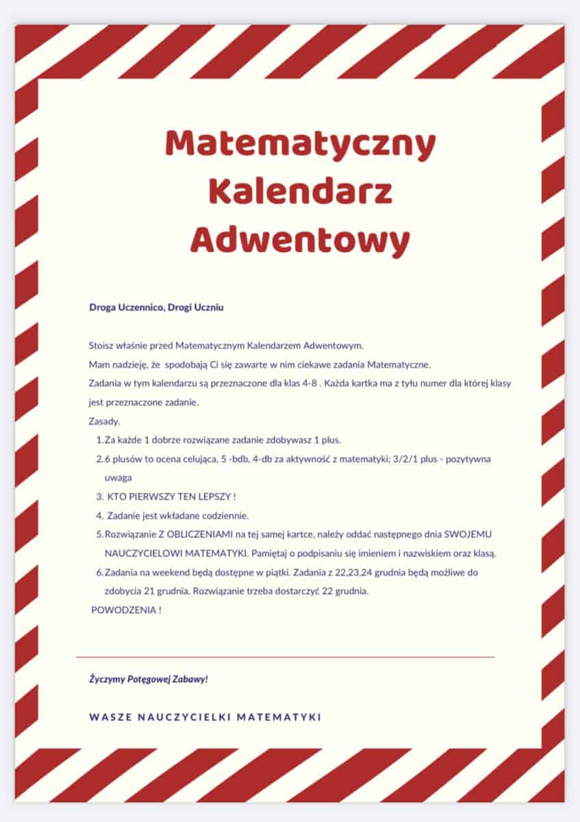 W dniach od 1 do 17 grudnia 2021 uczniowie klas 4-8 mogli, swoje wyczekiwanie na upragnione Święta Bożego Narodzenia, odliczać z Matematycznym Kalendarzem Adwentowym.