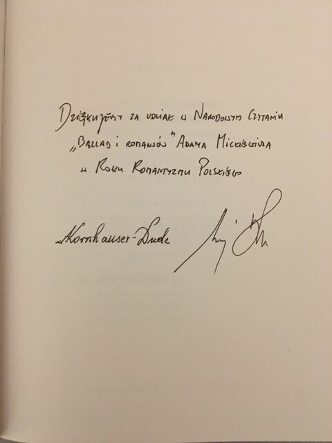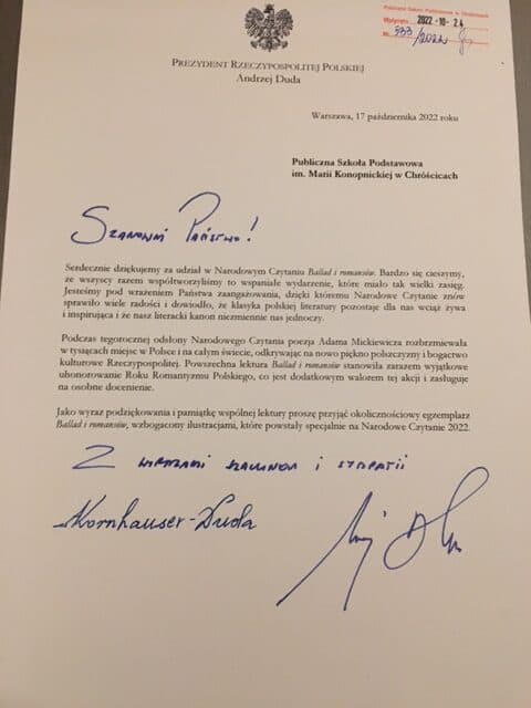 Z wielką przyjemnością informujemy, iż nasza szkoła otrzymała podziękowanie od pary prezydenckiej za udział w Narodowym Czytaniu oraz pamiątkową lekturę „Ballad i romansów” Adama Mickiewicza, która jest dostępna w naszej bibliotece.