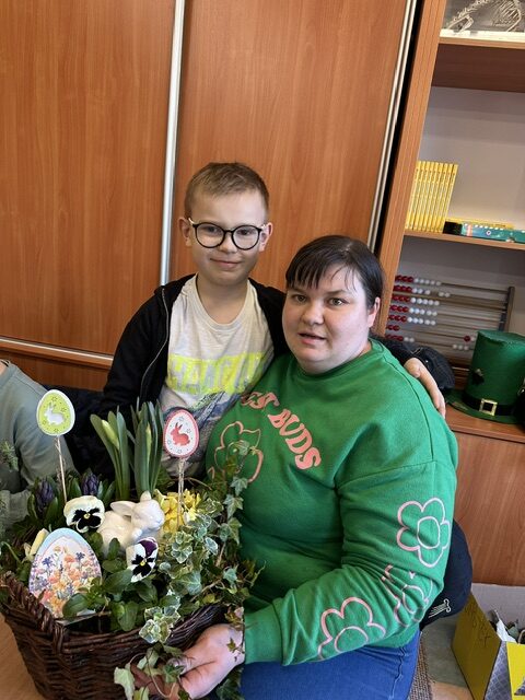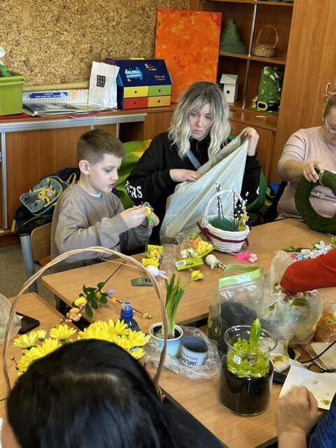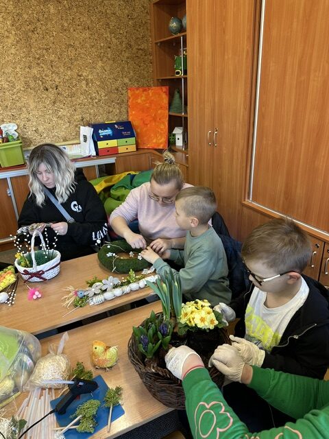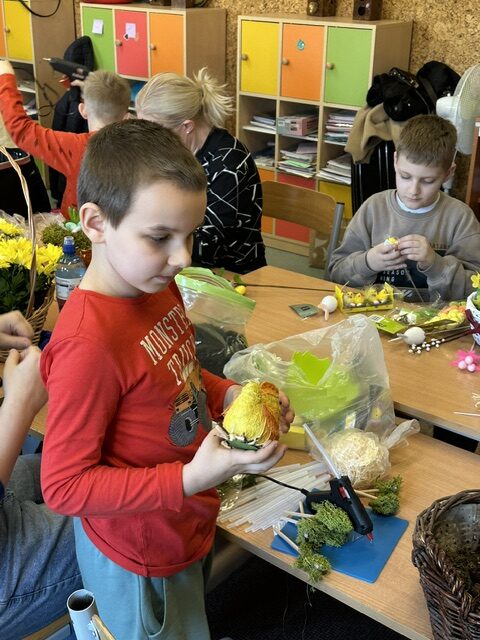 Sala wypełniła się radosną atmosferą, rozmowami i śmiechem. Na stołach pojawiły się kolorowe ozdoby, bazie, pisanki, wstążki oraz naturalne elementy, które inspirowały do tworzenia pięknych kompozycji. Dzieci z ogromnym zaangażowaniem pracowały razem ze swoim rodzicem, rozwijając swoją wyobraźnię i zdolności manualne.