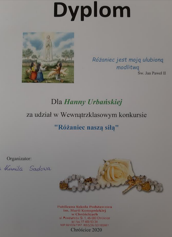Pod takim hasłem 7.10.2020 odbył się w klasie I- klasowy konkurs na najciekawszy różaniec. W konkursie wzięło udział 18 pierwszoklasistów, którzy przy wsparciu swoich rodziców wykonali piękne różańce. Wszystkie dzieci zostały nagrodzone dyplomem i nagrodą. Rodzicom dziękujemy za zaangażowanie i wspieranie swoich pociech.