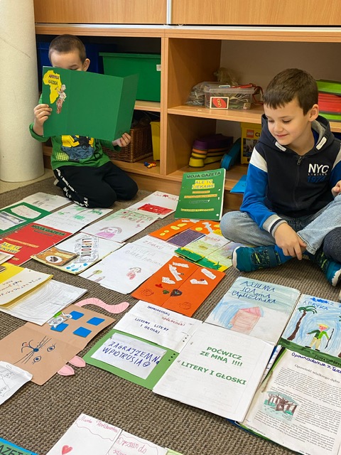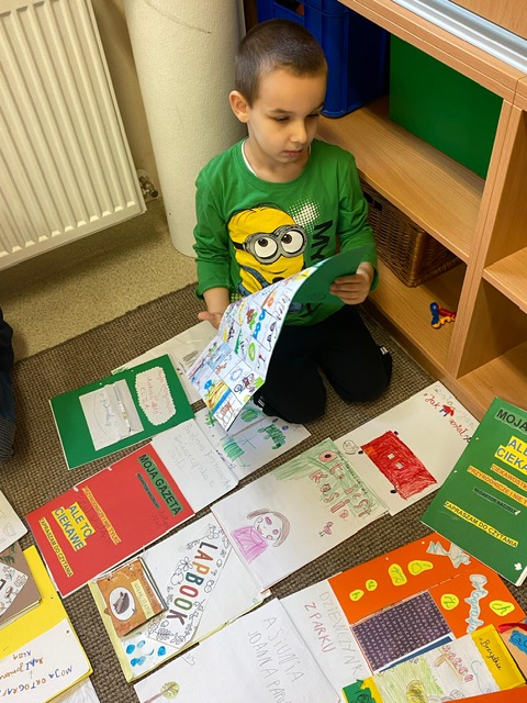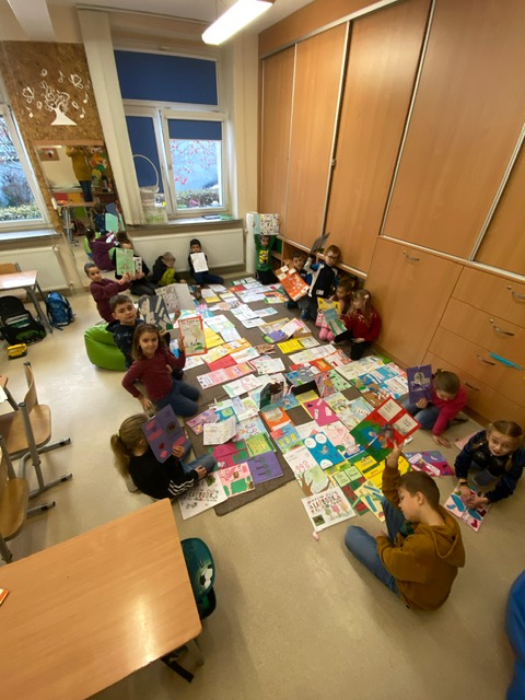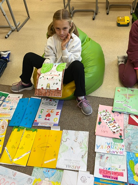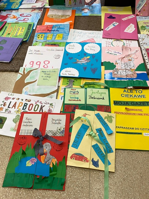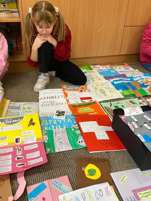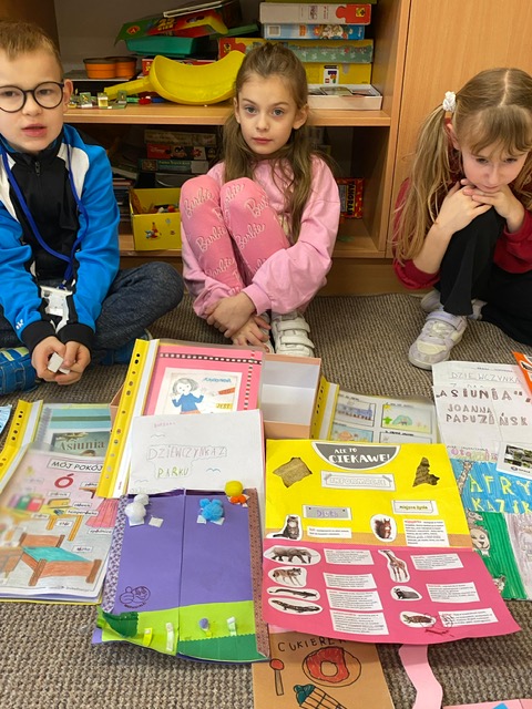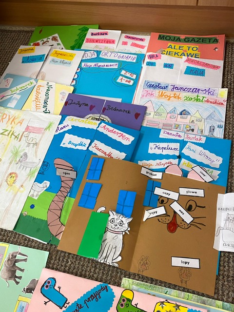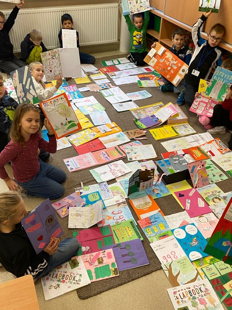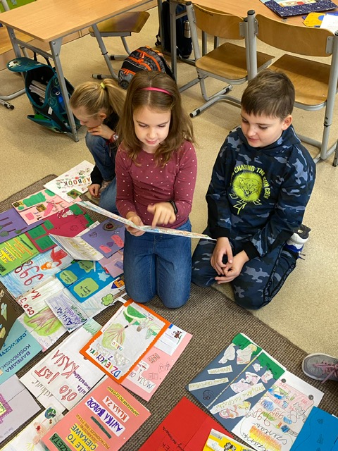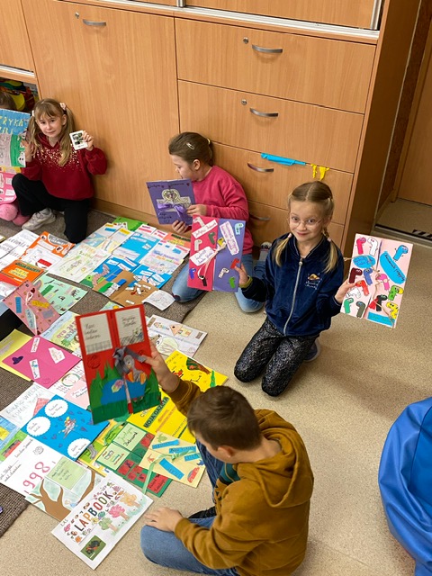 Na zdjęciach uczniowie klasy 2 a wraz ze swoimi dziełami, tworzonymi podczas słuchania przeze mnie czytanych książek. Dzieci słuchając czytanego opowiadania rysują, a dzięki temu rozwijają swoją wyobraźnię oraz motorykę małą. Po latach będą mogli wyciągnąć swój lapbook i przypomnieć sobie o czym była słuchana książka. Czytam swoim uczniom codziennie, a dzieci słuchają i rysują, dzięki temu powstają przepiękne dzieła sztuki. Każdy przez czas mojego czytania w dowolnym miejscu i dowolnej pozycji w klasie rysuje to co sobie podczas słuchania wyobraża. Jestem pewna, że „żywe”lekcje kiedyś zaowocują.