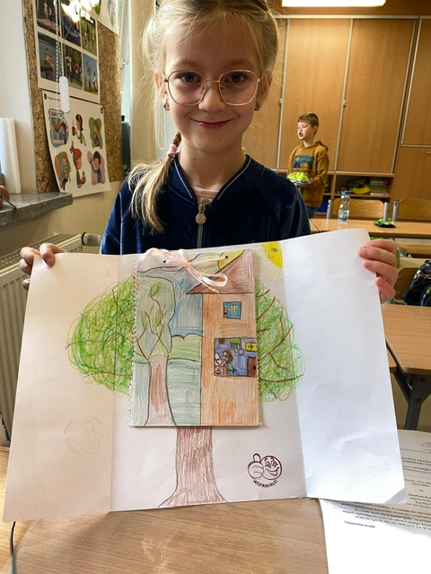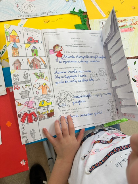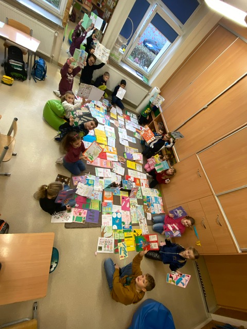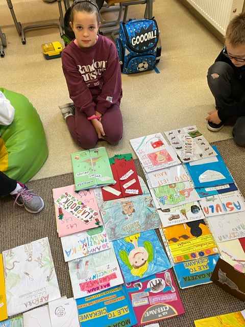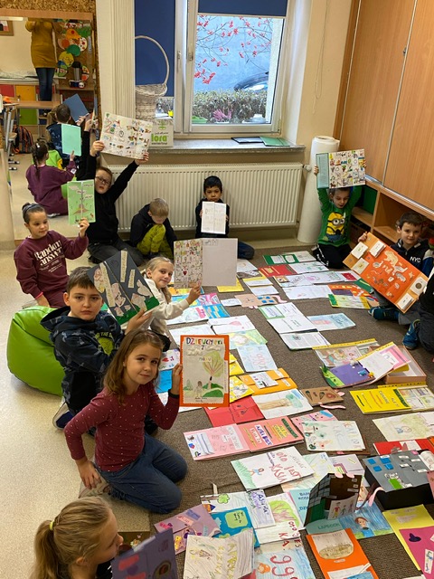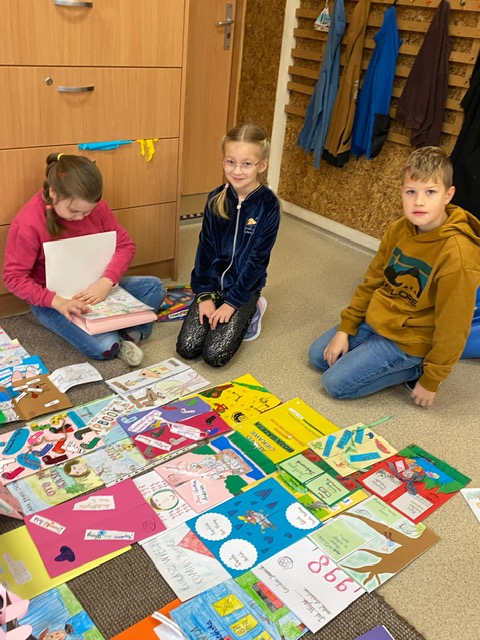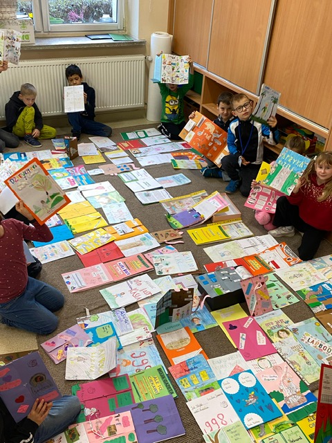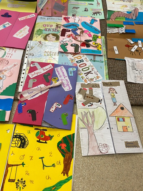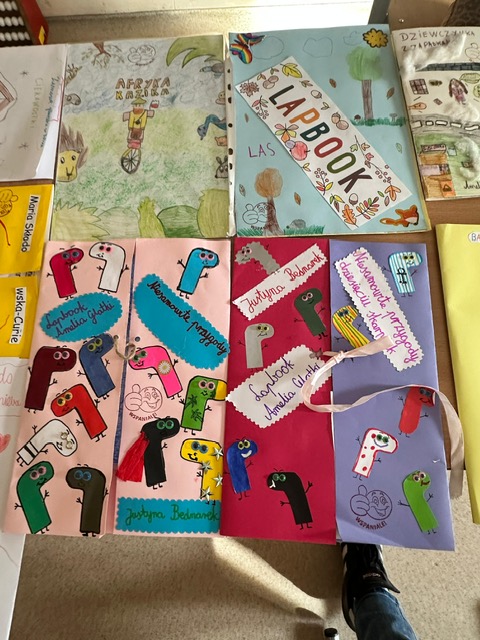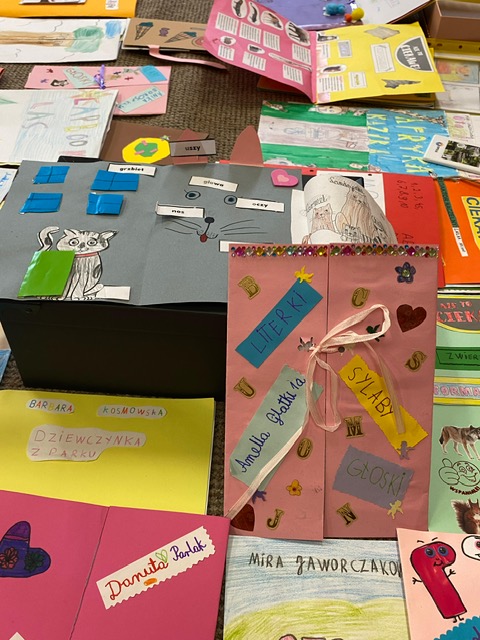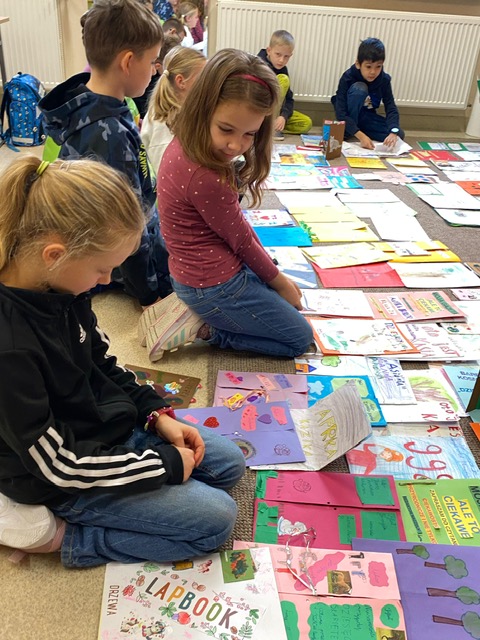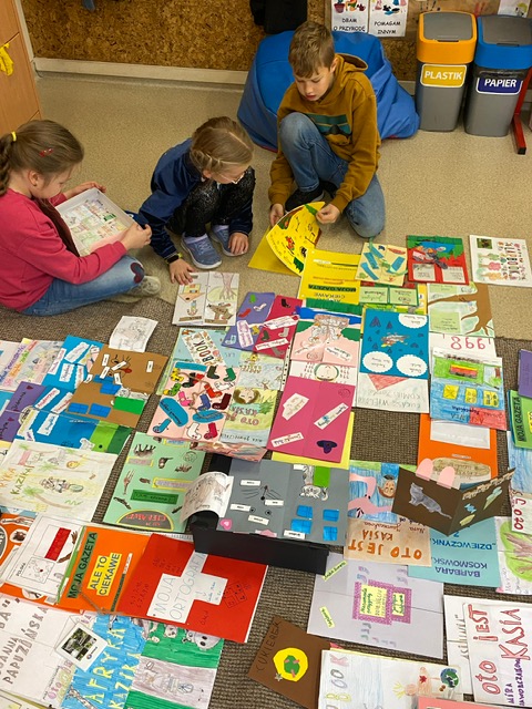 Na zdjęciach uczniowie klasy 2 a wraz ze swoimi dziełami, tworzonymi podczas słuchania przeze mnie czytanych książek. Dzieci słuchając czytanego opowiadania rysują, a dzięki temu rozwijają swoją wyobraźnię oraz motorykę małą. Po latach będą mogli wyciągnąć swój lapbook i przypomnieć sobie o czym była słuchana książka. Czytam swoim uczniom codziennie, a dzieci słuchają i rysują, dzięki temu powstają przepiękne dzieła sztuki. Każdy przez czas mojego czytania w dowolnym miejscu i dowolnej pozycji w klasie rysuje to co sobie podczas słuchania wyobraża. Jestem pewna, że „żywe”lekcje kiedyś zaowocują.
