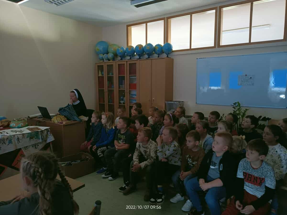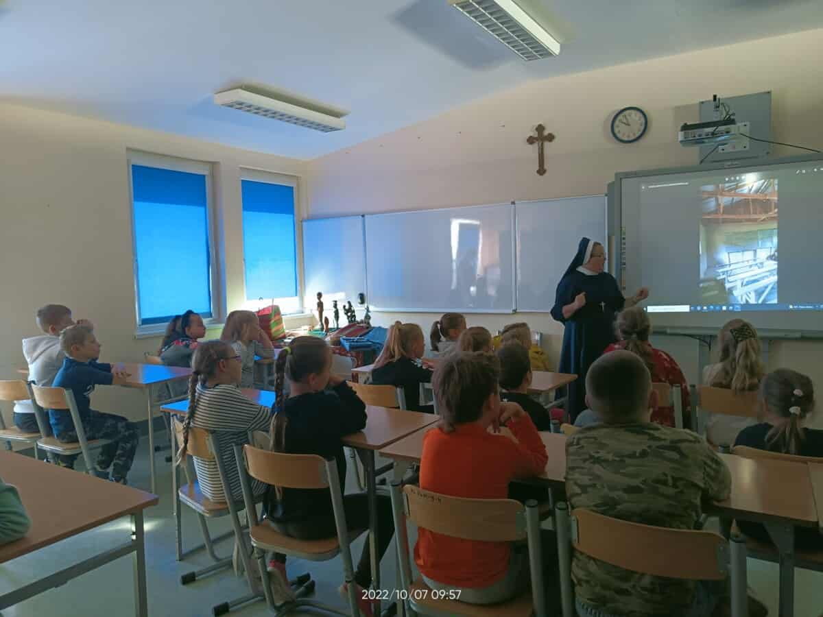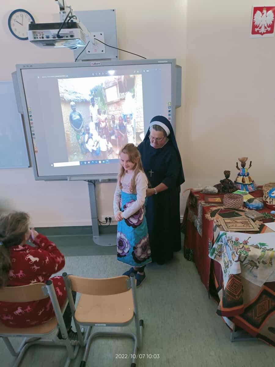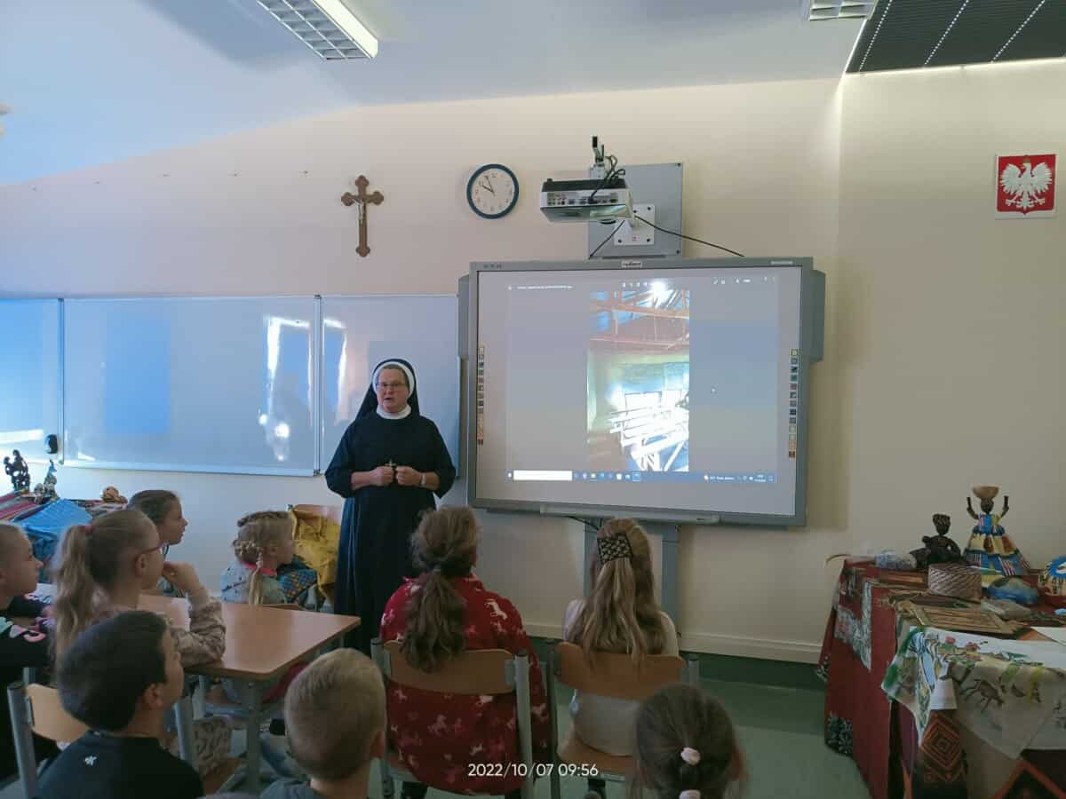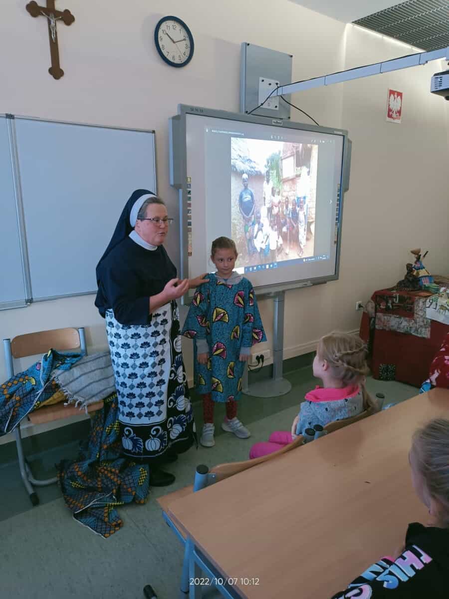W piątek, 7 października br., mieliśmy radość gościć siostrę Gizelę Tatoj, która w przeszłości była katechetką w naszej szkole i bardzo wiele robiła na rzecz misji w Kamerunie, angażując w to dzieło dzieci, młodzież i dorosłych. S. Gizela przyjechała do nas, aby podzielić się z nami swoimi wspomnieniami z pobytu na afrykańskiej ziemi. Siostra bardzo ciekawie opowiadała o Kamerunie, o warunkach, w jakich żyją i uczą się nasi rówieśnicy. Podczas spotkania mogliśmy obejrzeć wiele zdjęć, dotknąć przedmioty codziennego użytku wykonane przez tamtejszą ludność, przymierzyć ubrania, a także zaśpiewać krótką piosenkę, której nauczyła nas s. Gizela. Na zakończenie p. Dyrektor wyraziła siostrze Gizeli wdzięczność za dar tego spotkania, a niektórzy uczniowie i nauczyciele zrobili sobie z Siostrą pamiątkowe zdjęcie.