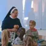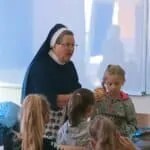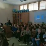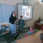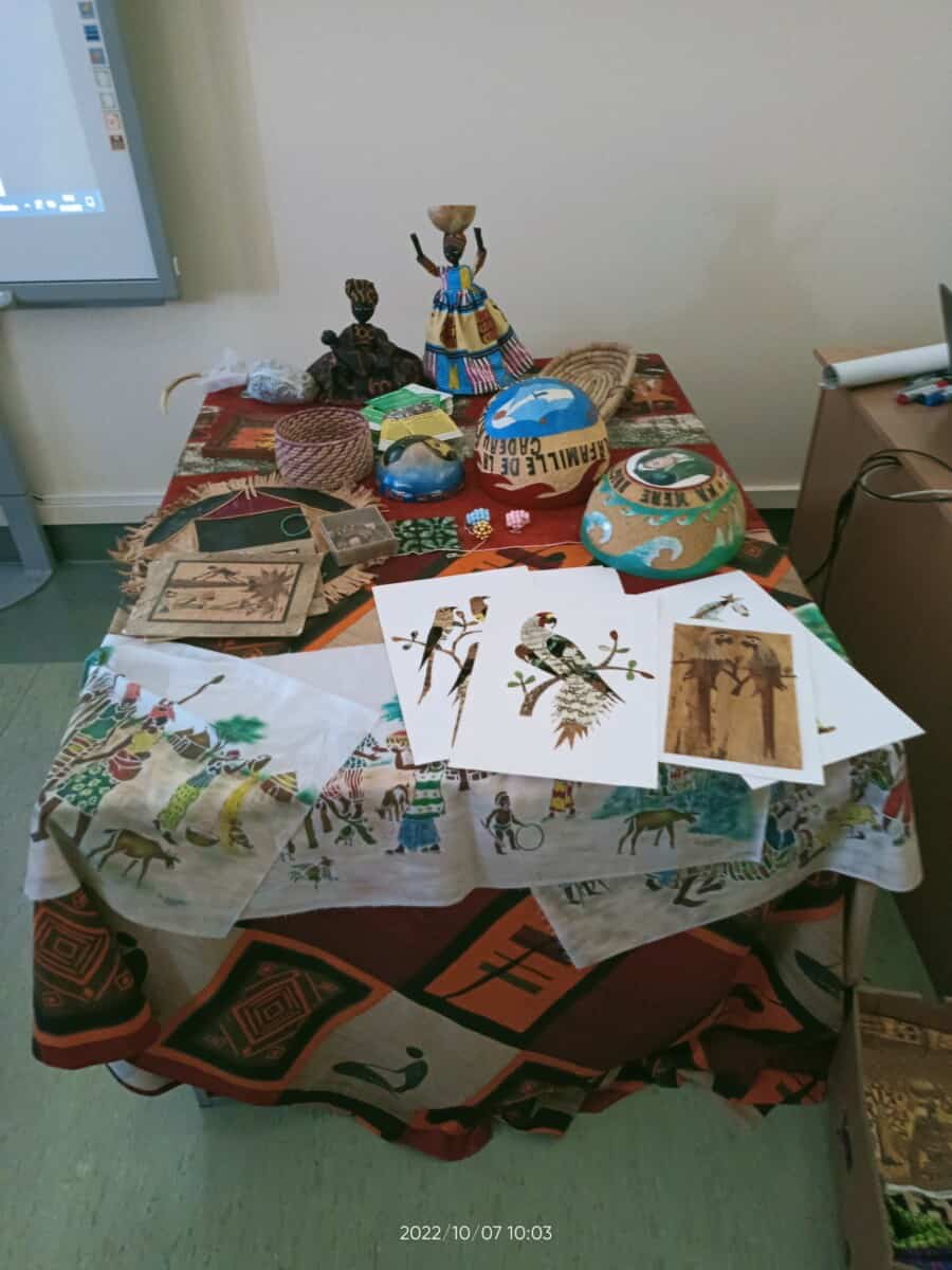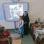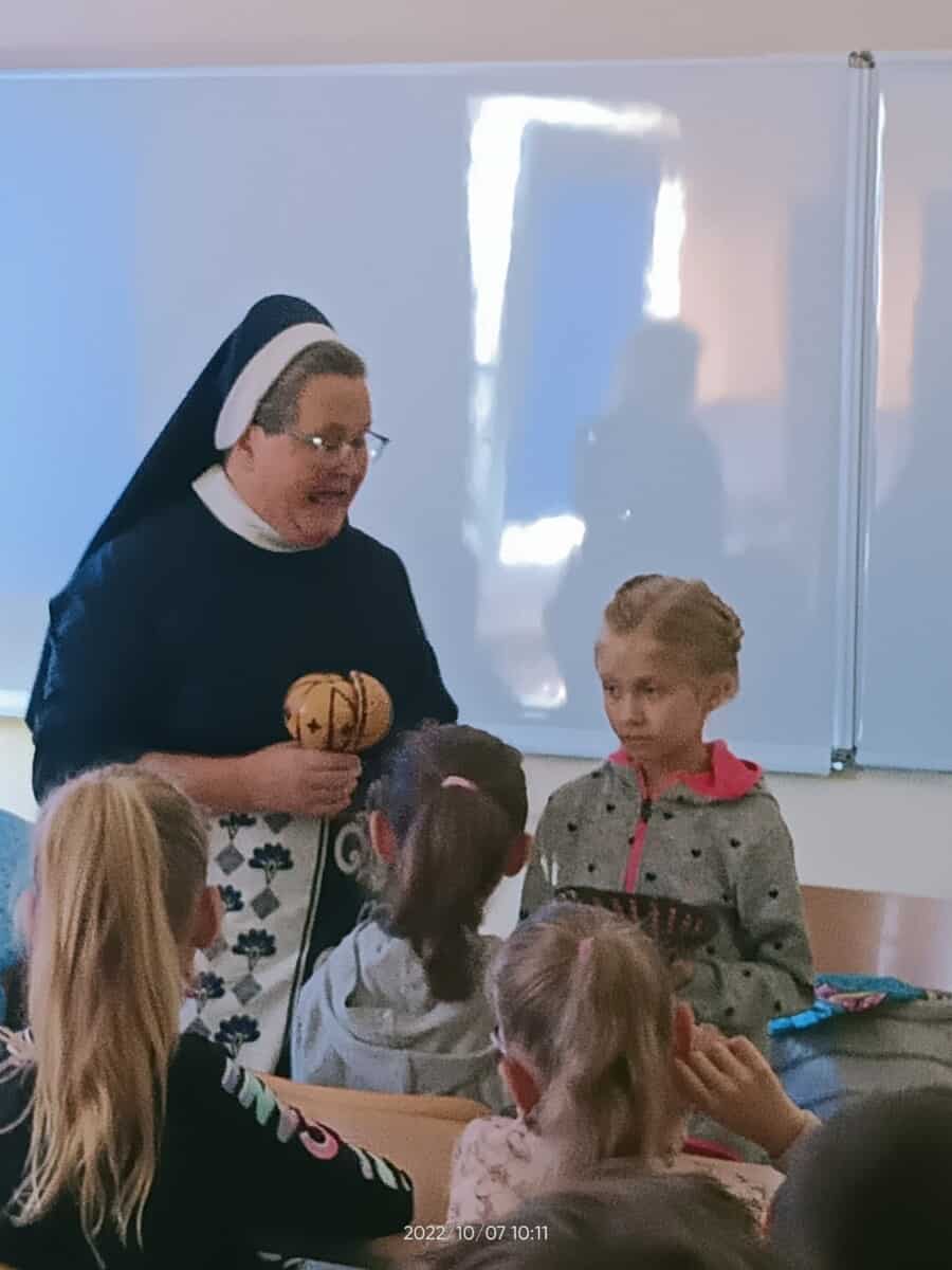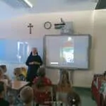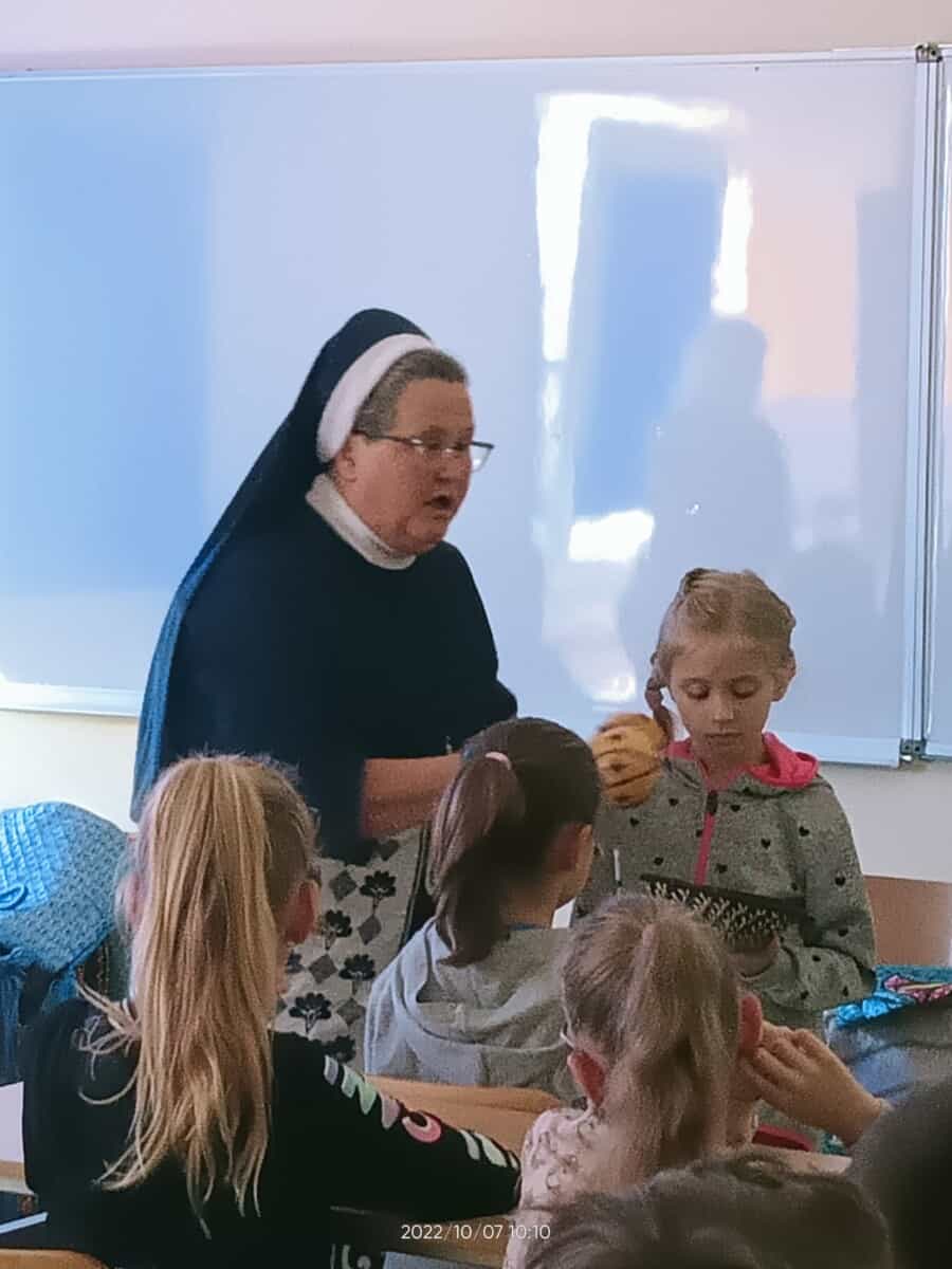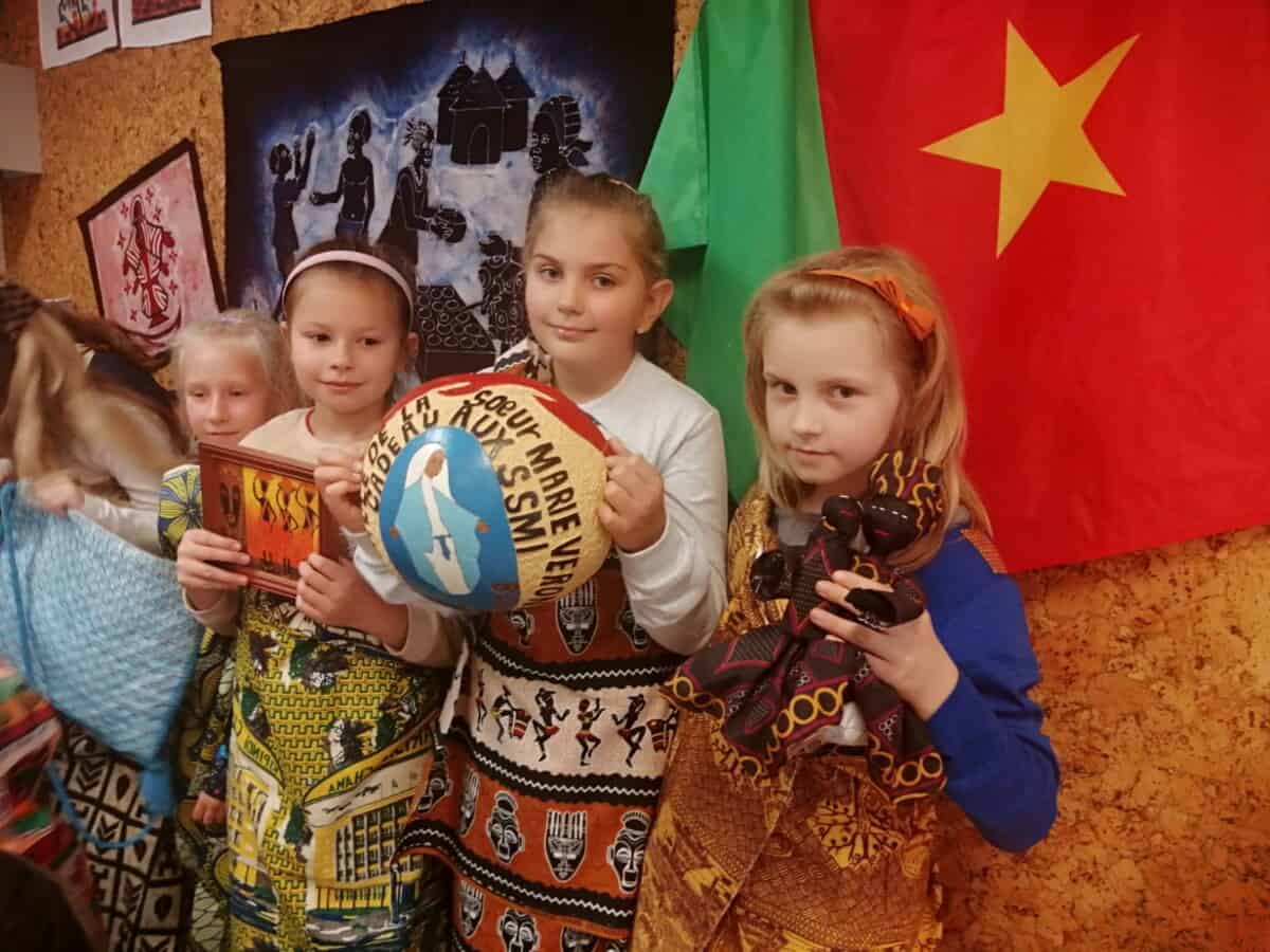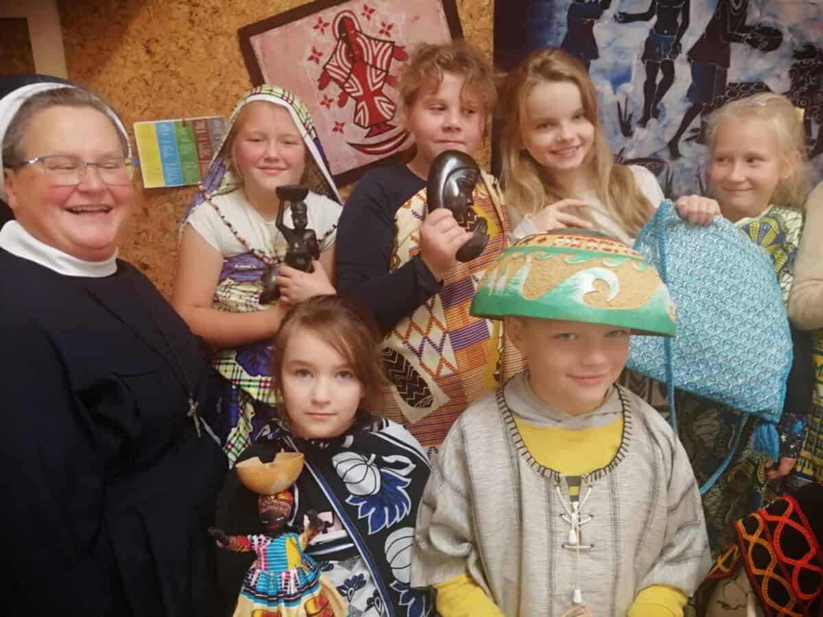 W piątek, 7 października br., mieliśmy radość gościć siostrę Gizelę Tatoj, która w przeszłości była katechetką w naszej szkole i bardzo wiele robiła na rzecz misji w Kamerunie, angażując w to dzieło dzieci, młodzież i dorosłych. S. Gizela przyjechała do nas, aby podzielić się z nami swoimi wspomnieniami z pobytu na afrykańskiej ziemi. Siostra bardzo ciekawie opowiadała o Kamerunie, o warunkach, w jakich żyją i uczą się nasi rówieśnicy. Podczas spotkania mogliśmy obejrzeć wiele zdjęć, dotknąć przedmioty codziennego użytku wykonane przez tamtejszą ludność, przymierzyć ubrania, a także zaśpiewać krótką piosenkę, której nauczyła nas s. Gizela. Na zakończenie p. Dyrektor wyraziła siostrze Gizeli wdzięczność za dar tego spotkania, a niektórzy uczniowie i nauczyciele zrobili sobie z Siostrą pamiątkowe zdjęcie.
