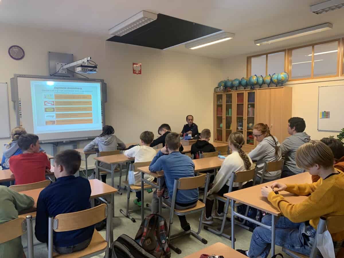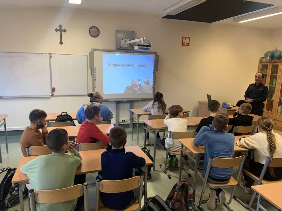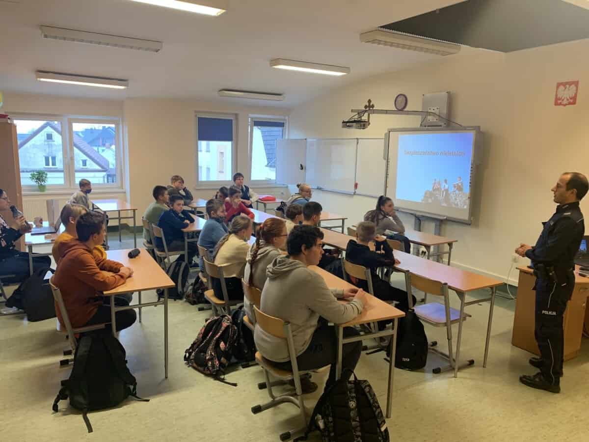26 listopada uczniowie Klasy 7a i 7b uczestniczyli w spotkaniu z sierżantem sztabowym Mateuszem Kardasem-policjantem z Komisariatu Policji w Dobrzeniu Wielkim.