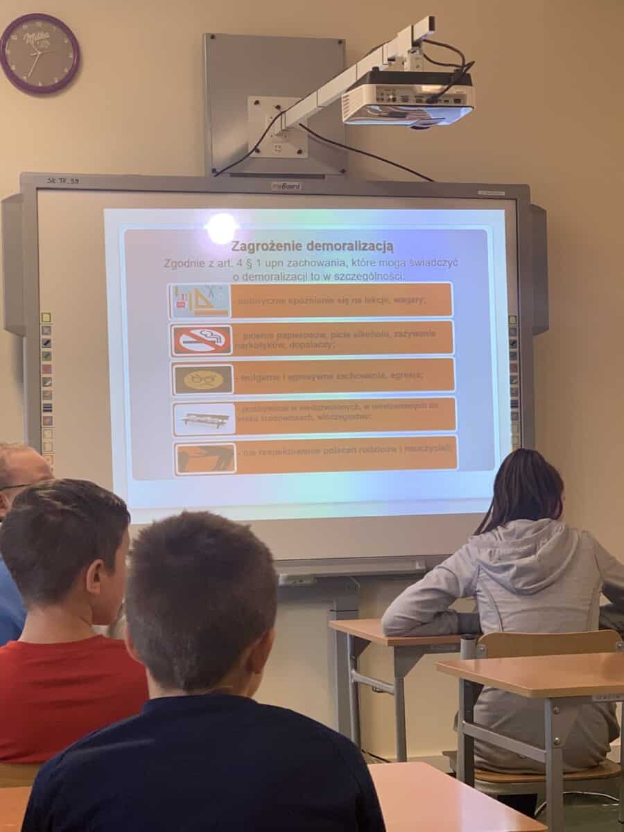 Tematem pogadanki była odpowiedzialność prawna nieletnich, agresja i przemoc wobec rówieśników i pracowników szkoły oraz zasady zachowania się obowiązujące w szkole i poza nią. Pan Kardas poruszył także temat tzw. cyberprzemocy i skutków jakie może nieść za sobą niewłaściwe korzystanie z Internetu. Na spotkaniu uczniowie dowiedzieli się, jakie mają prawa i obowiązki w świetle prawa, kto i kiedy ponosi odpowiedzialność prawną oraz jakie postawy powinni przyjmować uczniowie, gdy są namawiani do czynu zabronionego przez prawo. Prowadzący pogadankę uświadomił uczniom, że mają prawo czuć się bezpiecznie w domu, w szkole i na ulicy. Na co dzień mogą liczyć na pomoc ludzi i organizacji, które są do tego powołane, oraz korzystać z odpowiednich aplikacji gdzie mogą zgadzać różne zagrożenia w ich okolicy.