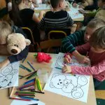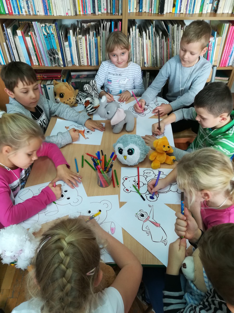 Działo się podczas tego spotkania wiele. Uczniowie śpiewali piosenki tj. „Jadą, jadą misie” czy też utwór rozpoczynający bajkę „Miś Uszatek”. Dowiedzieli się o historii, początkach pluszowego misia oraz o życiu prawdziwych niedźwiedzi. Odgadywali zagadki, kolorowali misie.