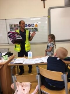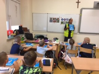 W dniu 28.05 odbyło się spotkanie uczniów klas I-III z policjantem. Spotkanie odbyło się w formie pogadanki i wiązało się z coroczną akcją Bezpieczne Wakacje. Pan policjant poinformował jak bezpiecznie zachować się nad wodą oraz w górach, czego unikać podczas burzy, jak zachować się gdy dzwoni do nas nieznajomy numer, czy puka ktoś nieznajomy do drzwi. Również zostały przypomniane zasady ruchu drogowego. Zwieńczeniem spotkania były jeszcze dodatkowe pytania zadawane przez zainteresowanych uczniów, na które funkcjonariusz chętnie odpowiadał.