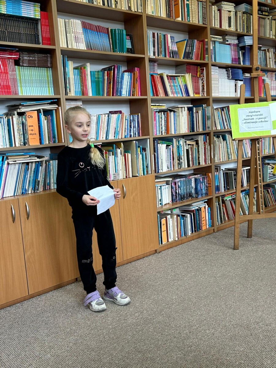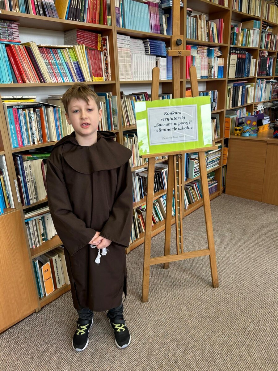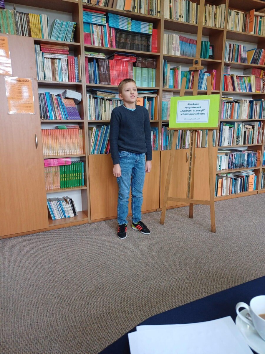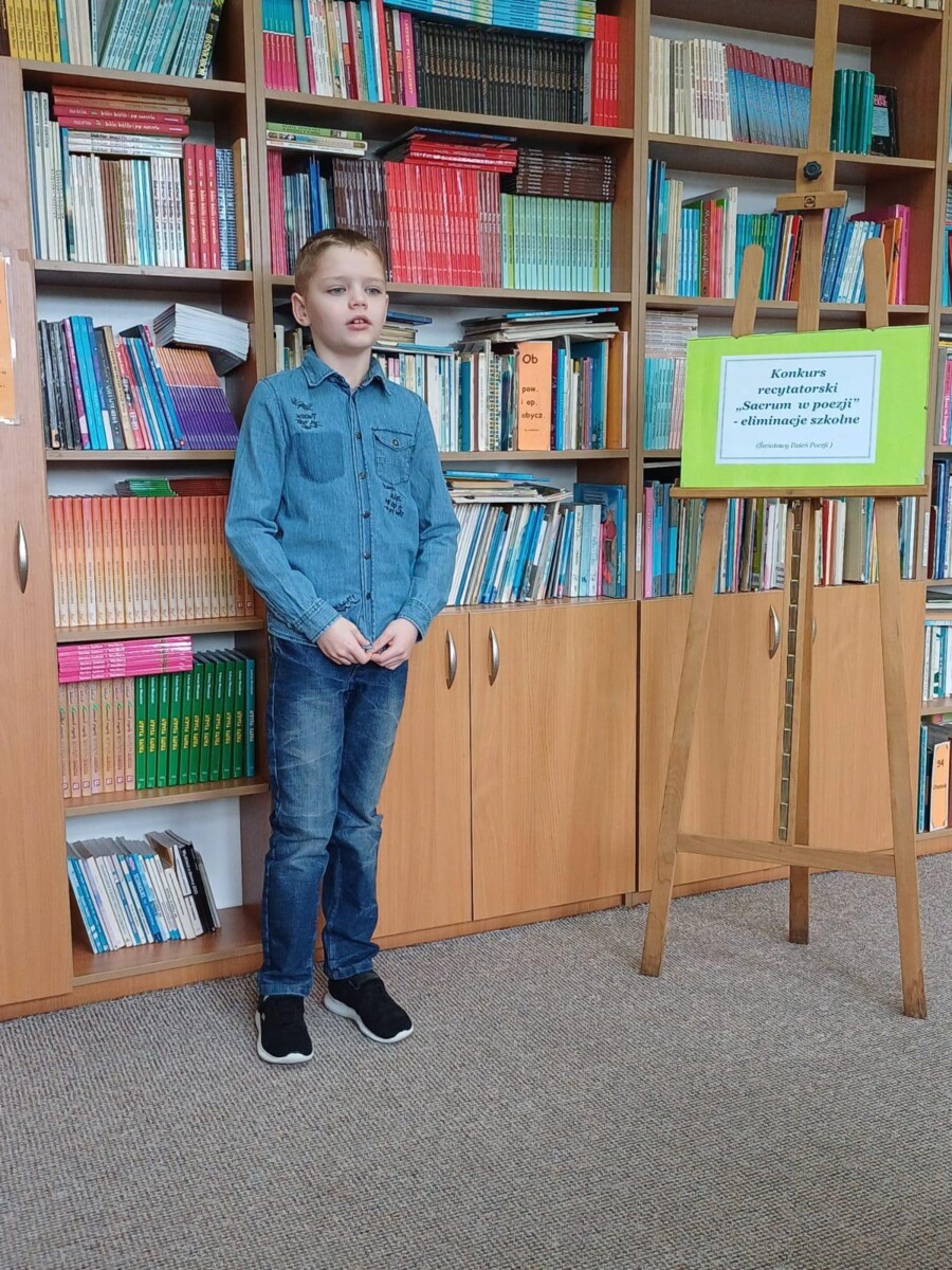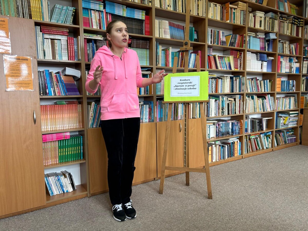 W ramach obchodów Światowego Dnia Poezji (21 marca) w naszej szkolnej bibliotece odbył się konkurs recytatorski poezji religijnej. Uczniowie recytowali wiersze znanych poetów min : ks. Jana Twardowskiego, Stanisława Bełzy, Jana Pawła II. Nie zabrakło także recytacji pieśni religijnych. Jury nie miało łatwego wyboru. Do konkursu przystąpiło 22 uczniów. Recytowano na poziomie klas 1-3, 4-6, 7-8 szkoły podstawowej. Na poziomie