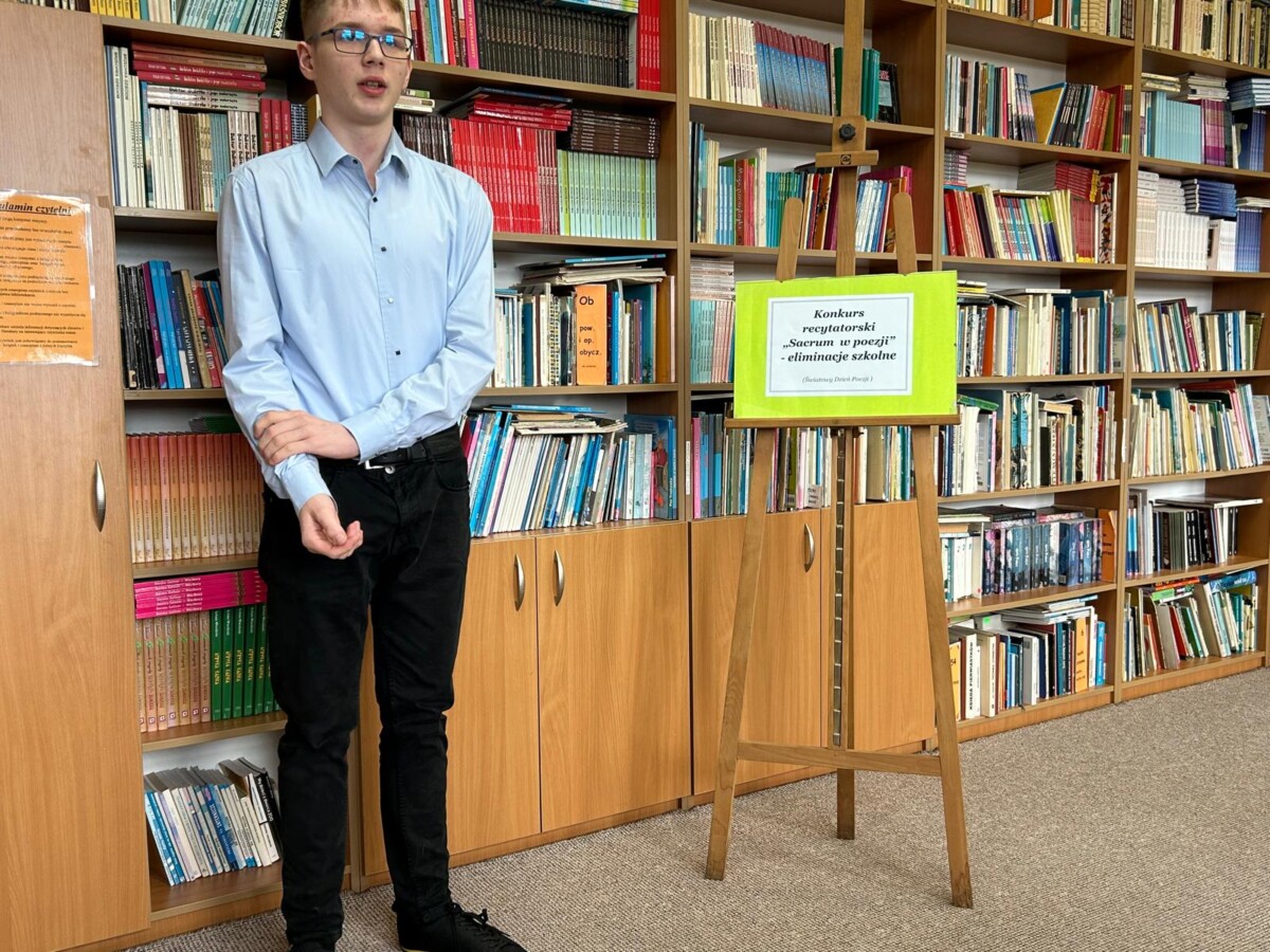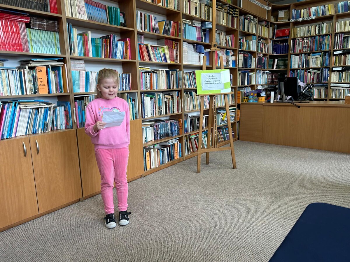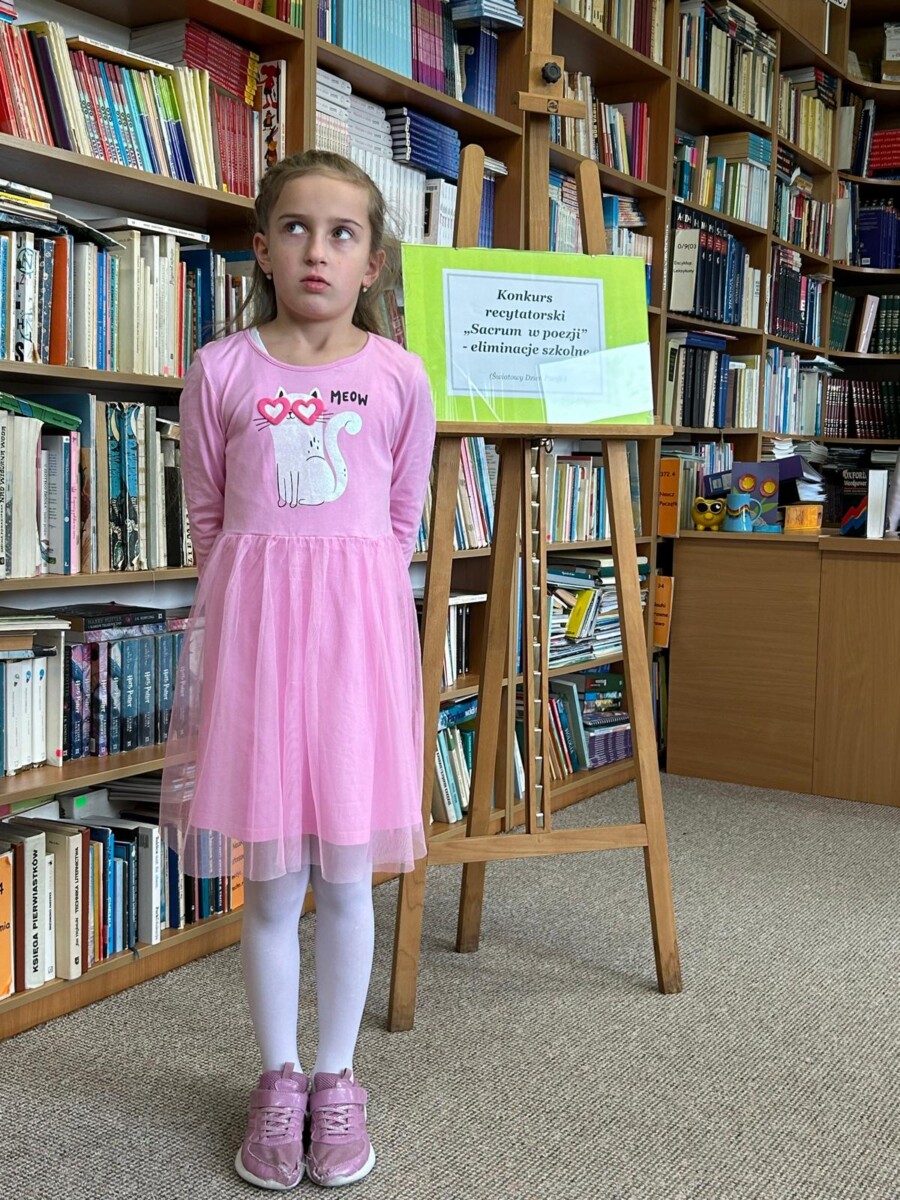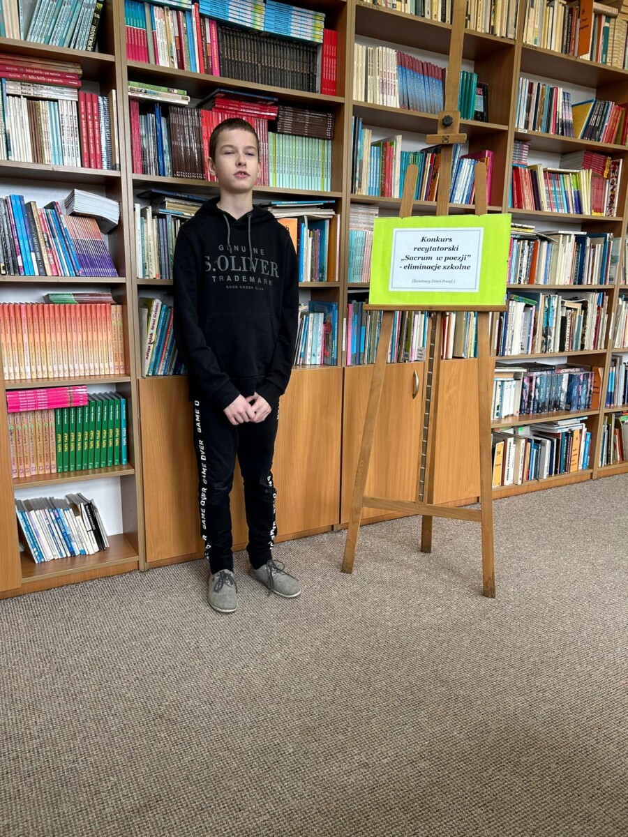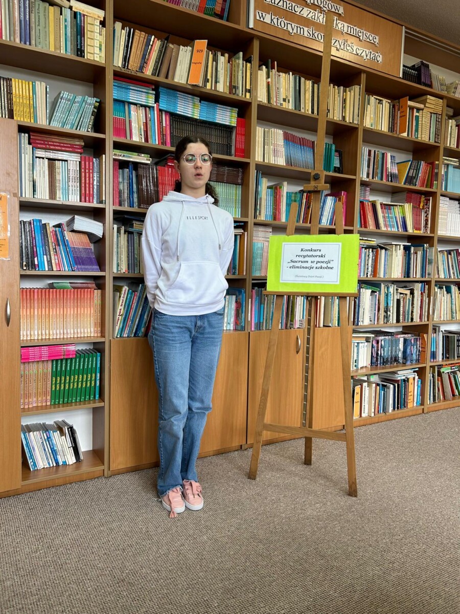 W ramach obchodów Światowego Dnia Poezji (21 marca) w naszej szkolnej bibliotece odbył się konkurs recytatorski poezji religijnej. Uczniowie recytowali wiersze znanych poetów min : ks. Jana Twardowskiego, Stanisława Bełzy, Jana Pawła II. Nie zabrakło także recytacji pieśni religijnych. Jury nie miało łatwego wyboru. Do konkursu przystąpiło 22 uczniów. Recytowano na poziomie klas 1-3, 4-6, 7-8 szkoły podstawowej. Na poziomie