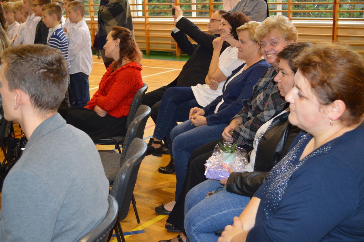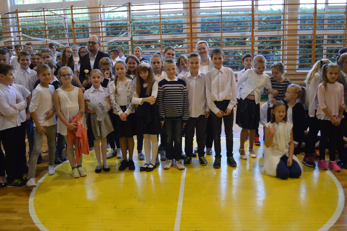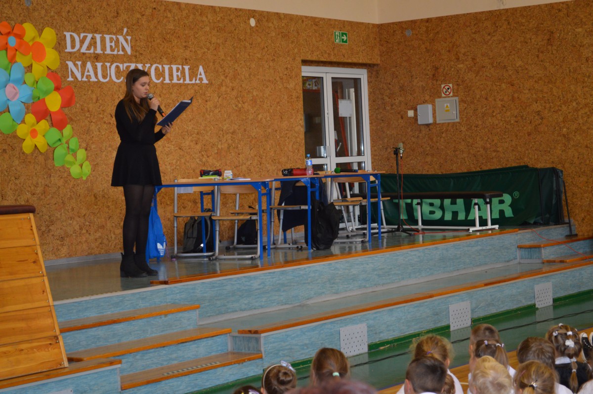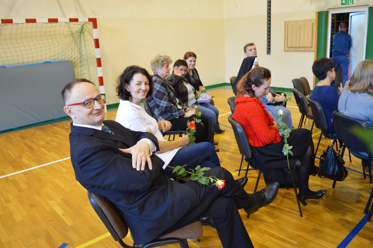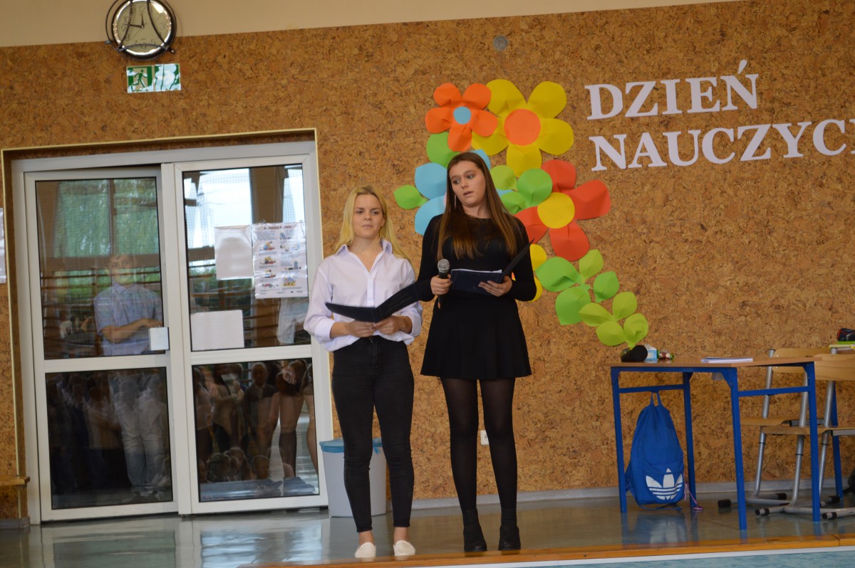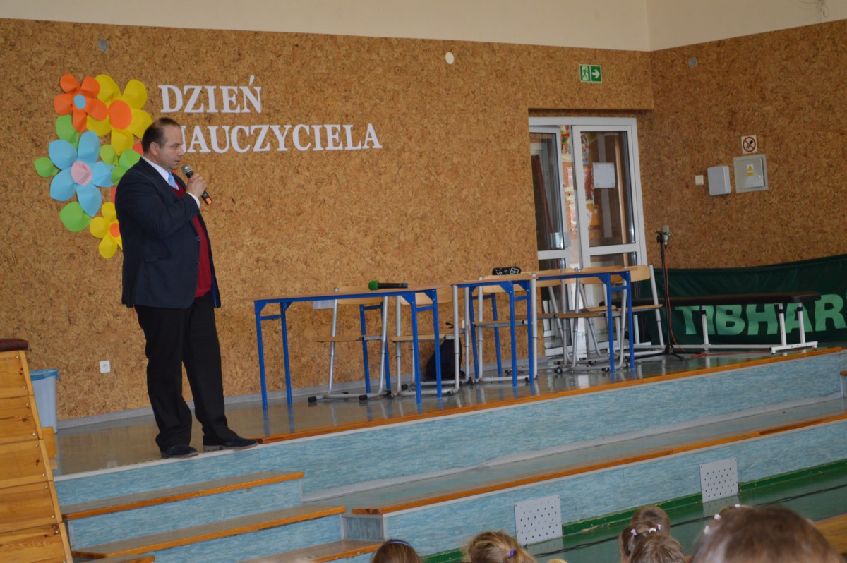 W piątek  13 października obchodziliśmy Dzień Nauczyciela. Podczas uroczystego apelu, który przygotował Samorząd Uczniowski przy współpracy z uczniami klasy 3 gimnazjum padło wiele wspaniałych życzeń ujętych słowem i piosenką. Swoje  przemówienie, pan dyrektor Mirosław Gutka skierował do wszystkich pracowników naszej szkoły, życząc wszystkiego co najlepsze oraz satysfakcji z wykonywanej pracy. W części artystycznej na scenie uczniowie zaprezentowali w humorystyczny sposób realia szkolnego życia. Nie zabrakło też kwiatów, którymi zostali obdarowani nauczyciele, ciepłych słów i własnoręcznie wykonanych laurek.