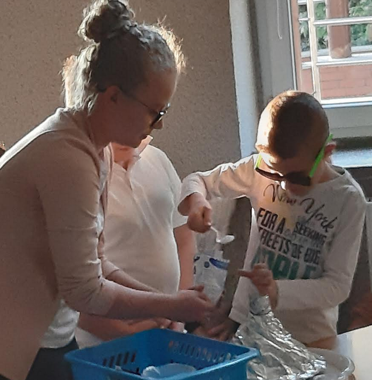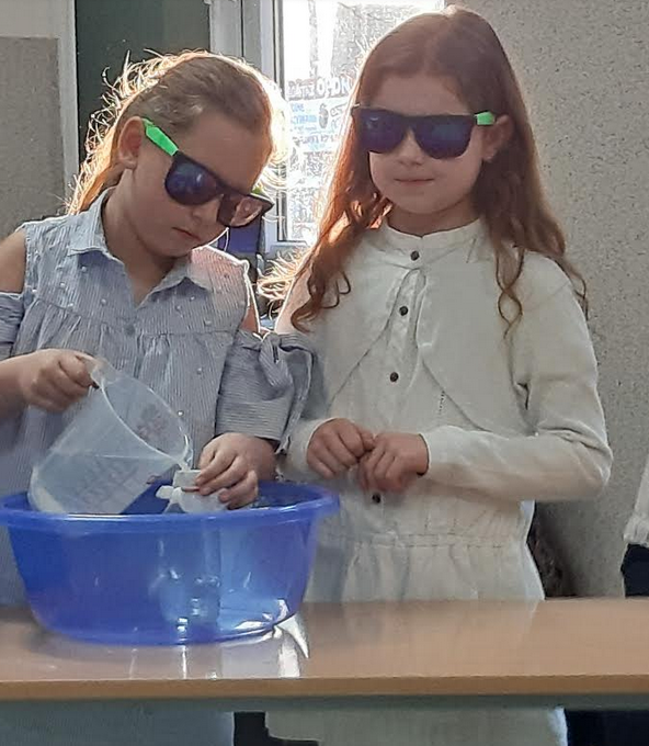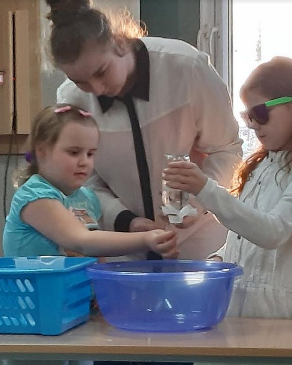 – w doświadczenia chemiczne z udziałem uczniów kl. 2 PSP i 3 gimnazjum zaangażowano również 6- latków . Dzieci poprzez bezpośrednie działanie mogły zdobyć odpowiedź na pytanie