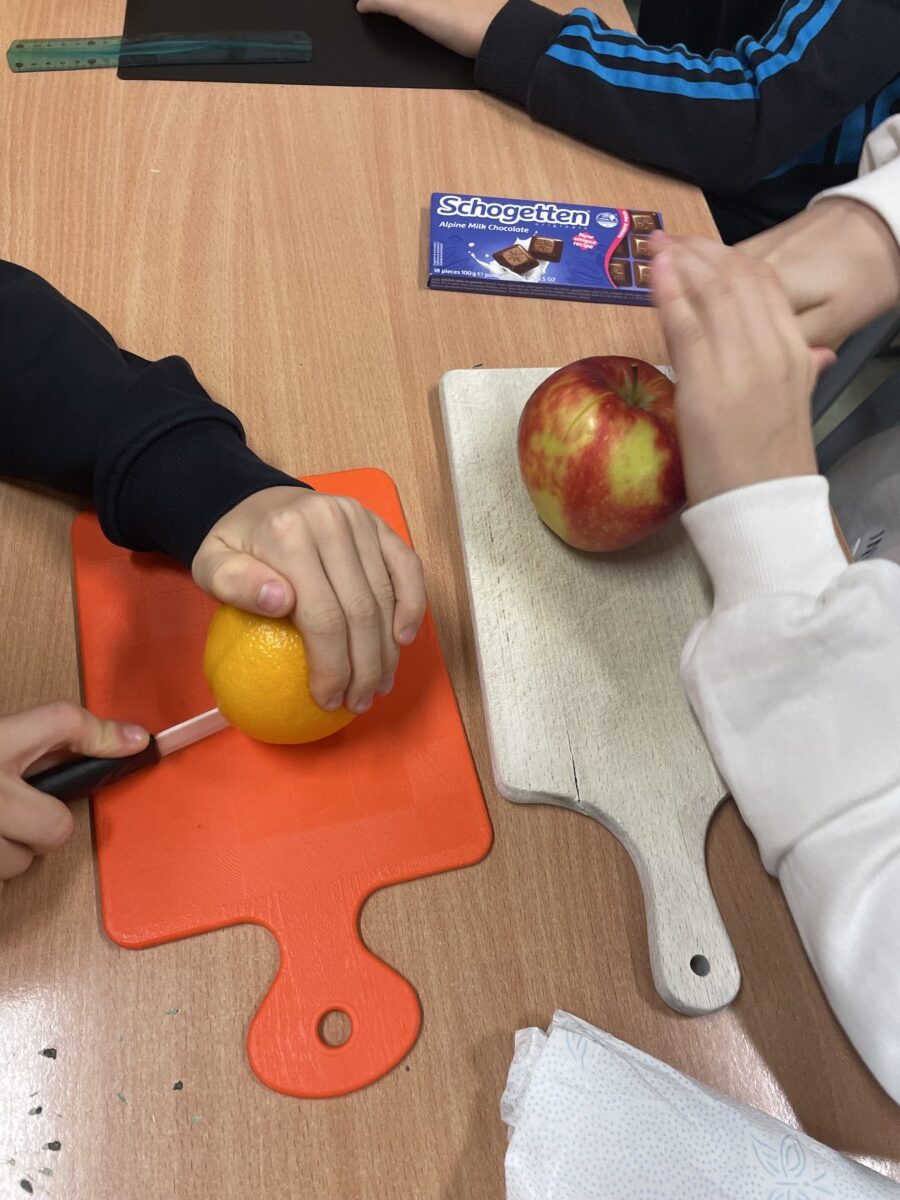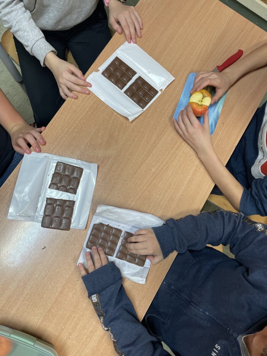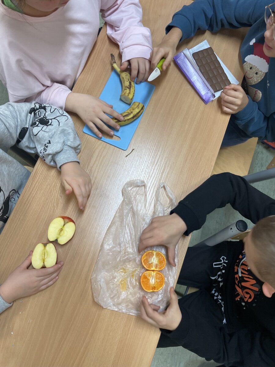 Lekcje matematyki nie muszą ograniczać się do podręczników i tablicy. Przykładem tego była wyjątkowa lekcja w klasie 5, podczas której uczniowie odkrywali tajniki ułamków zwykłych, liczb mieszanych, ilorazów oraz skracania i rozszerzania ułamków, wykorzystując do tego… owoce i słodycze. Była to matematyczna uczta pełna praktyki, zabawy i smaku! Uczniowie zostali wcześniej poinformowani, że na zajęciach będą potrzebne produkty, które można podzielić, takie jak owoce (jabłka, pomarańcze, banany) oraz słodycze (batoniki, czekolada). Dzięki temu każdy mógł się zaangażować w tworzenie nie tylko przykładów matematycznych, ale także swoistej degustacji. Uczniowie podzielili się na małe grupy i przystąpili do krojenia owoców i słodyczy na równe części i zapisać ułamek odpowiadający każdej części. Dzięki czekoladzie uczniowie zrozumieli, że ułamek można przedstawić jako wynik dzielenia. Na przykład podzielili tabliczkę czekolady złożoną z 12 kostek na grupę 4 osób, a później na 3. Na zakończenie uczniowie zapisali w zeszytach notatkę.