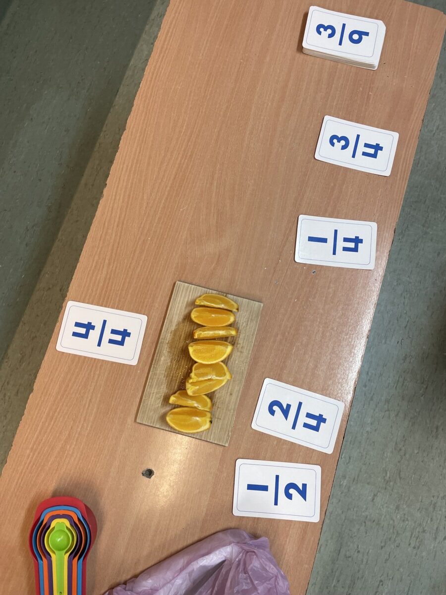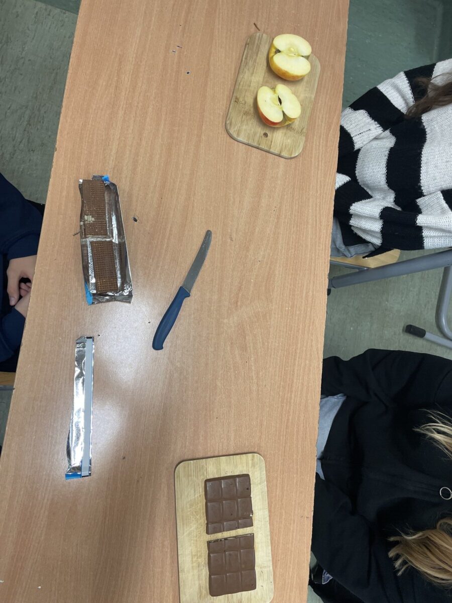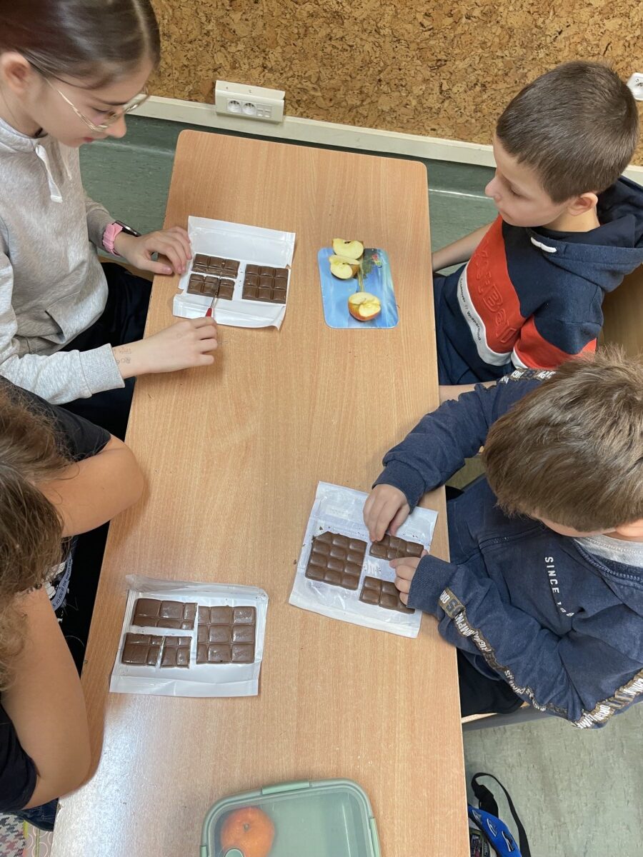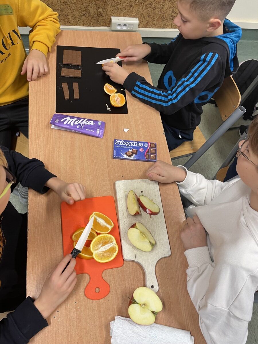 Lekcje matematyki nie muszą ograniczać się do podręczników i tablicy. Przykładem tego była wyjątkowa lekcja w klasie 5, podczas której uczniowie odkrywali tajniki ułamków zwykłych, liczb mieszanych, ilorazów oraz skracania i rozszerzania ułamków, wykorzystując do tego… owoce i słodycze. Była to matematyczna uczta pełna praktyki, zabawy i smaku! Uczniowie zostali wcześniej poinformowani, że na zajęciach będą potrzebne produkty, które można podzielić, takie jak owoce (jabłka, pomarańcze, banany) oraz słodycze (batoniki, czekolada). Dzięki temu każdy mógł się zaangażować w tworzenie nie tylko przykładów matematycznych, ale także swoistej degustacji. Uczniowie podzielili się na małe grupy i przystąpili do krojenia owoców i słodyczy na równe części i zapisać ułamek odpowiadający każdej części. Dzięki czekoladzie uczniowie zrozumieli, że ułamek można przedstawić jako wynik dzielenia. Na przykład podzielili tabliczkę czekolady złożoną z 12 kostek na grupę 4 osób, a później na 3. Na zakończenie uczniowie zapisali w zeszytach notatkę.