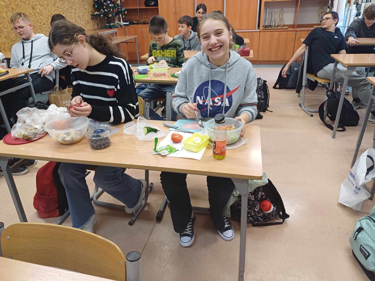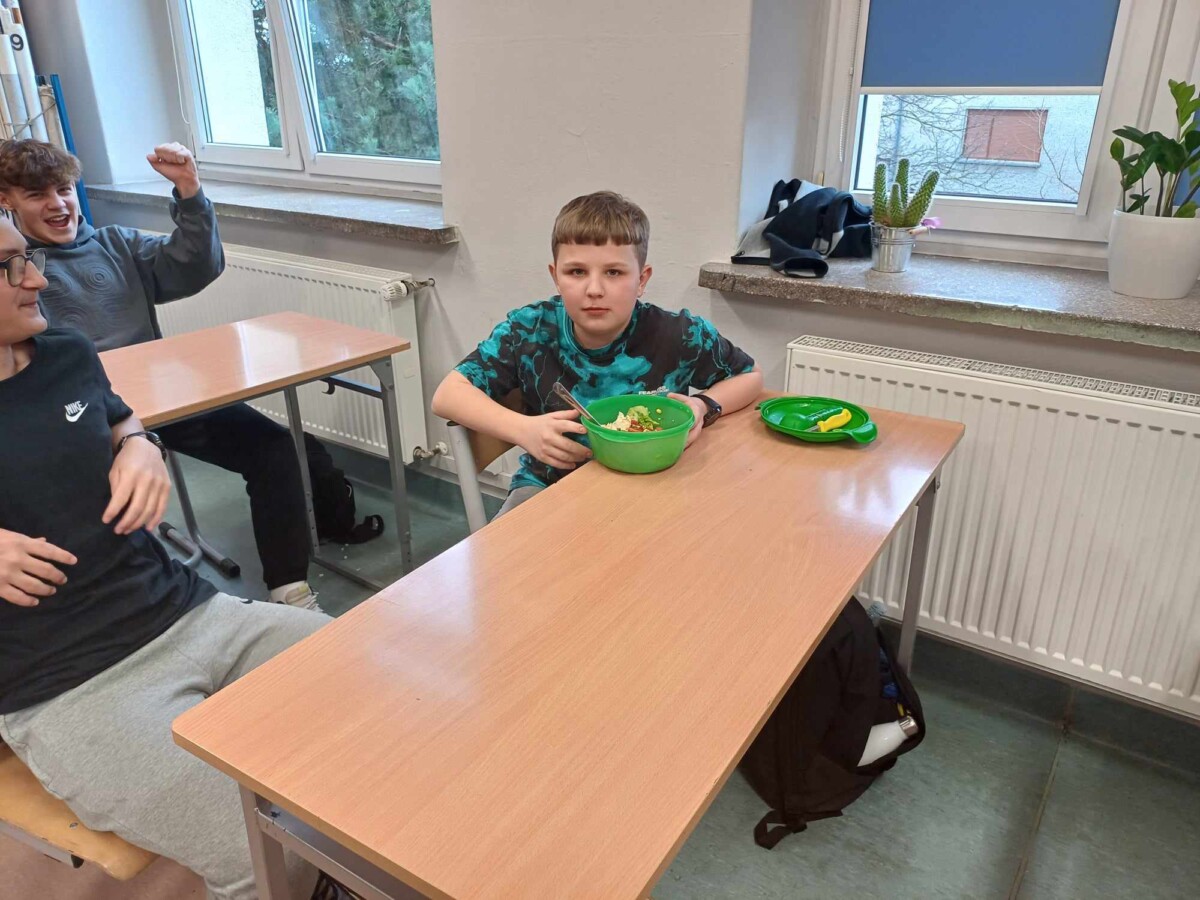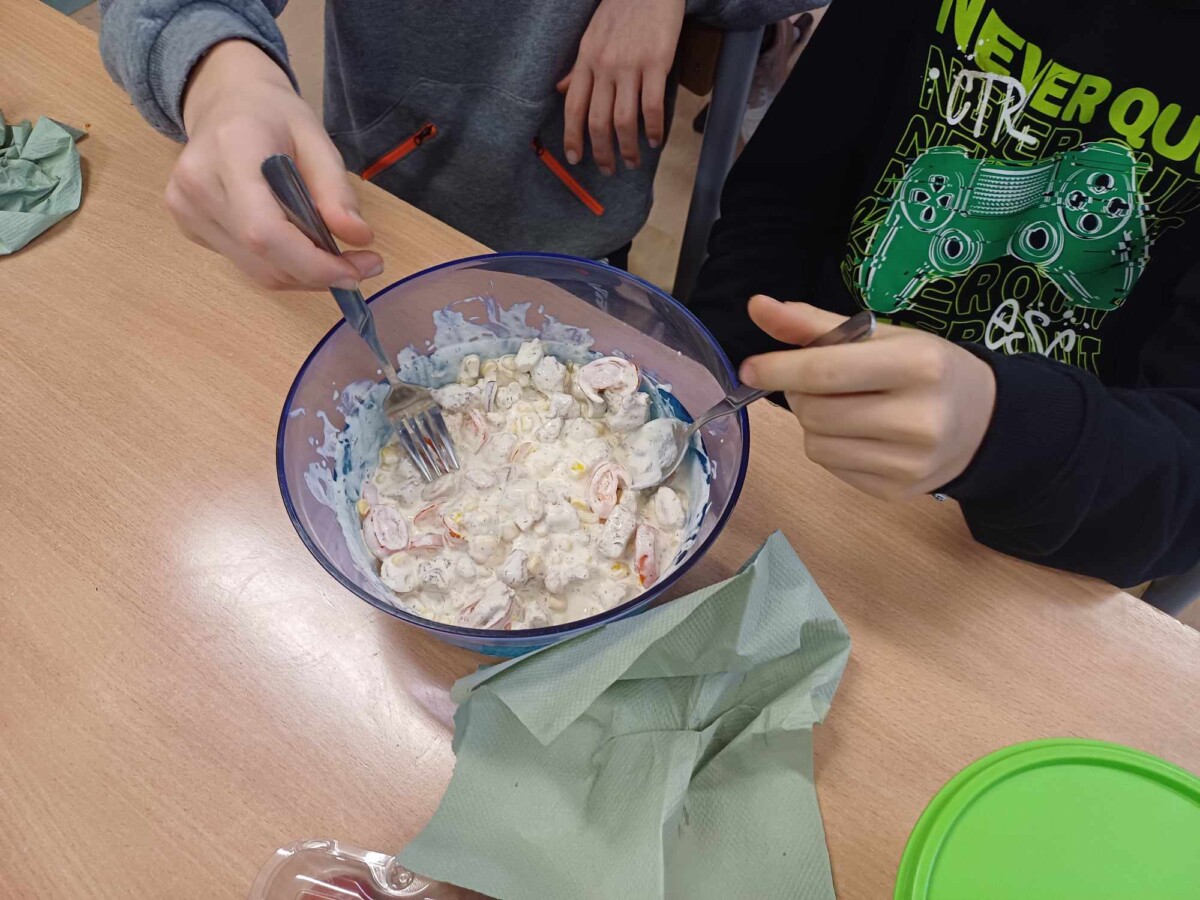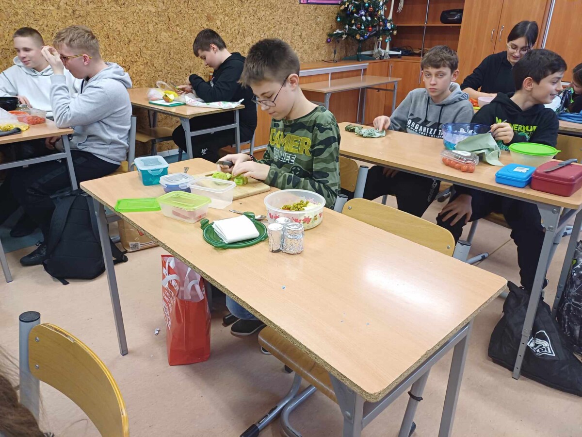 O tym jak ważna w życiu codziennym jest zbilansowana dieta dowiedzieli się uczniowie klasy VII podczas zajęć z wychowawcą. Istotnym aspektem był wpływ tego co jemy i jego oddziaływanie na nasze samopoczucie. Zdrowa dieta wpływa na poprawny rozwój oraz zmniejsza ryzyko chorób przewlekłych. Ponadto zwiększa odporność naszego organizmu, poprawia aparycję, a także pozytywnie wpływa na samopoczucie, usprawnia umysł i pomaga w walce ze stresem. Dlatego też uczniowie na podsumowanie zajęć robili surówkę lub sałatkę według własnego przepisu – im mniej kaloryczna tym lepsza, więc np. zamiast majonezu dodawali jogurt. Zajęcia miały być zachętą do systematycznego sięgania po zdrowe produkty.