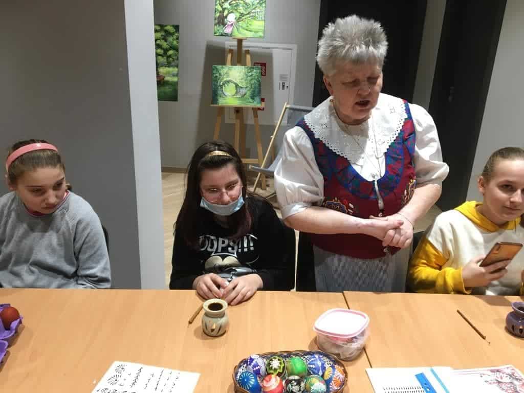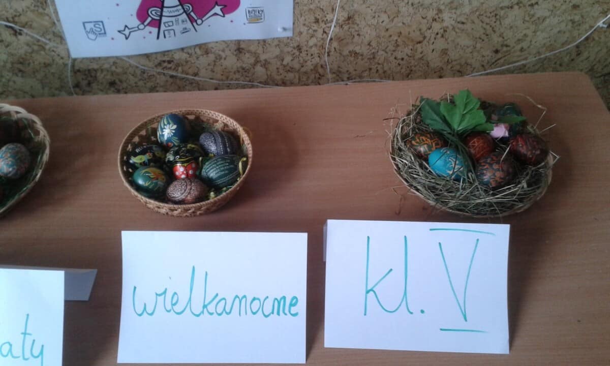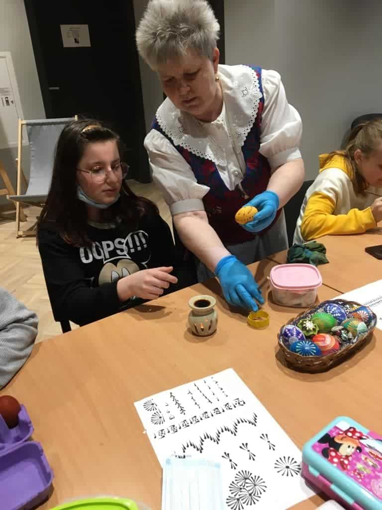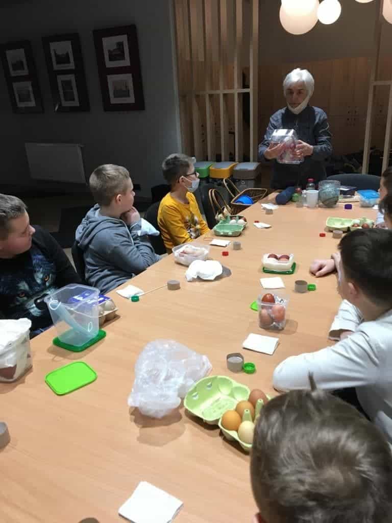 W dniu 23.02.22r. uczniowie klasy V wybrali się na wycieczkę rowerową z wizytą do Gminnego Ośrodka Kultury w Dobrzeniu Wielkim. Każde z dzieci miało przy sobie 4 ugotowane na twardo jajka.  Pytanie główne które się nasuwało to – Co będziemy robić? Okazało się, że jajko potrzebne były do warsztatów zdobienia jaj. Uczniowie zostali podzieleni na dwie grupy, jedni poznawali jak powstaje jajko zdobione woskiem w wielu kolorach, a także jakie wzory można do tego wykorzystać, natomiast druga zajęła się skrobaniem jaj. Dzieci pracowały w skupieniu uważnie słuchając wskazówek pań prowadzących – pani Anny Kośny oraz Haliny Jakubowskiej. Celem wyjazdu było poznanie tradycji i obrzędów wielkanocnych, a także  rozwijanie uzdolnień plastycznych dzieci oraz wzbudzanie kreatywnego myślenia oraz kształtowanie wrażliwości estetycznej uczniów.  Zwieńczeniem było zorganizowanie wystawy z pracami uczniów na szkolnym korytarzu, gdzie każdy mógł podziwiać ich prace.  Uczniowie dumnie prezentowali swoje dzieła. Warsztaty były zorganizowane w ramach współpracy z Muzeum Wsi Opolskiej. Uczniowie zapewniali, że poznane techniki zdobienia jaj wykorzystają także w domu przy dekorowaniu świątecznych pisanek.