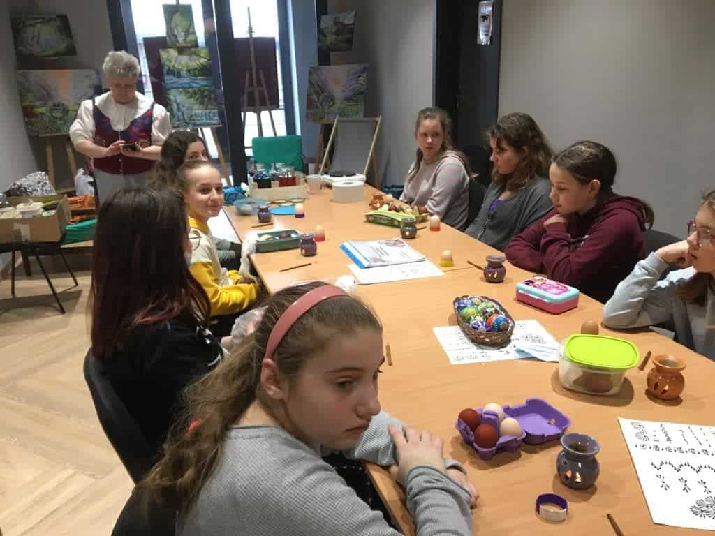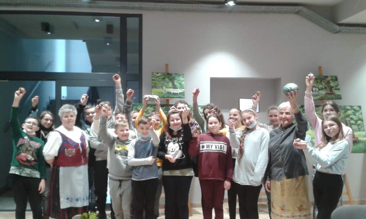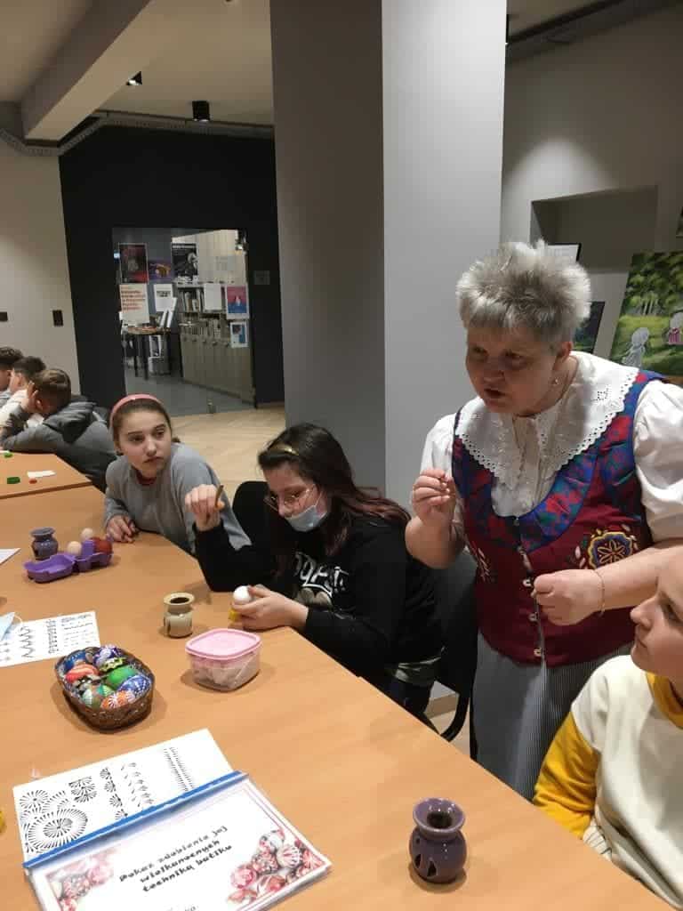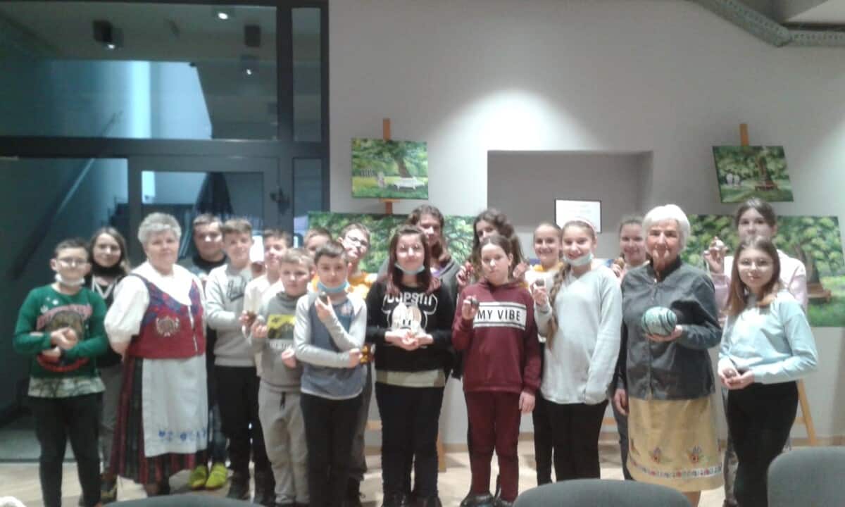 W dniu 23.02.22r. uczniowie klasy V wybrali się na wycieczkę rowerową z wizytą do Gminnego Ośrodka Kultury w Dobrzeniu Wielkim. Każde z dzieci miało przy sobie 4 ugotowane na twardo jajka.  Pytanie główne które się nasuwało to – Co będziemy robić? Okazało się, że jajko potrzebne były do warsztatów zdobienia jaj. Uczniowie zostali podzieleni na dwie grupy, jedni poznawali jak powstaje jajko zdobione woskiem w wielu kolorach, a także jakie wzory można do tego wykorzystać, natomiast druga zajęła się skrobaniem jaj. Dzieci pracowały w skupieniu uważnie słuchając wskazówek pań prowadzących – pani Anny Kośny oraz Haliny Jakubowskiej. Celem wyjazdu było poznanie tradycji i obrzędów wielkanocnych, a także  rozwijanie uzdolnień plastycznych dzieci oraz wzbudzanie kreatywnego myślenia oraz kształtowanie wrażliwości estetycznej uczniów.  Zwieńczeniem było zorganizowanie wystawy z pracami uczniów na szkolnym korytarzu, gdzie każdy mógł podziwiać ich prace.  Uczniowie dumnie prezentowali swoje dzieła. Warsztaty były zorganizowane w ramach współpracy z Muzeum Wsi Opolskiej. Uczniowie zapewniali, że poznane techniki zdobienia jaj wykorzystają także w domu przy dekorowaniu świątecznych pisanek.