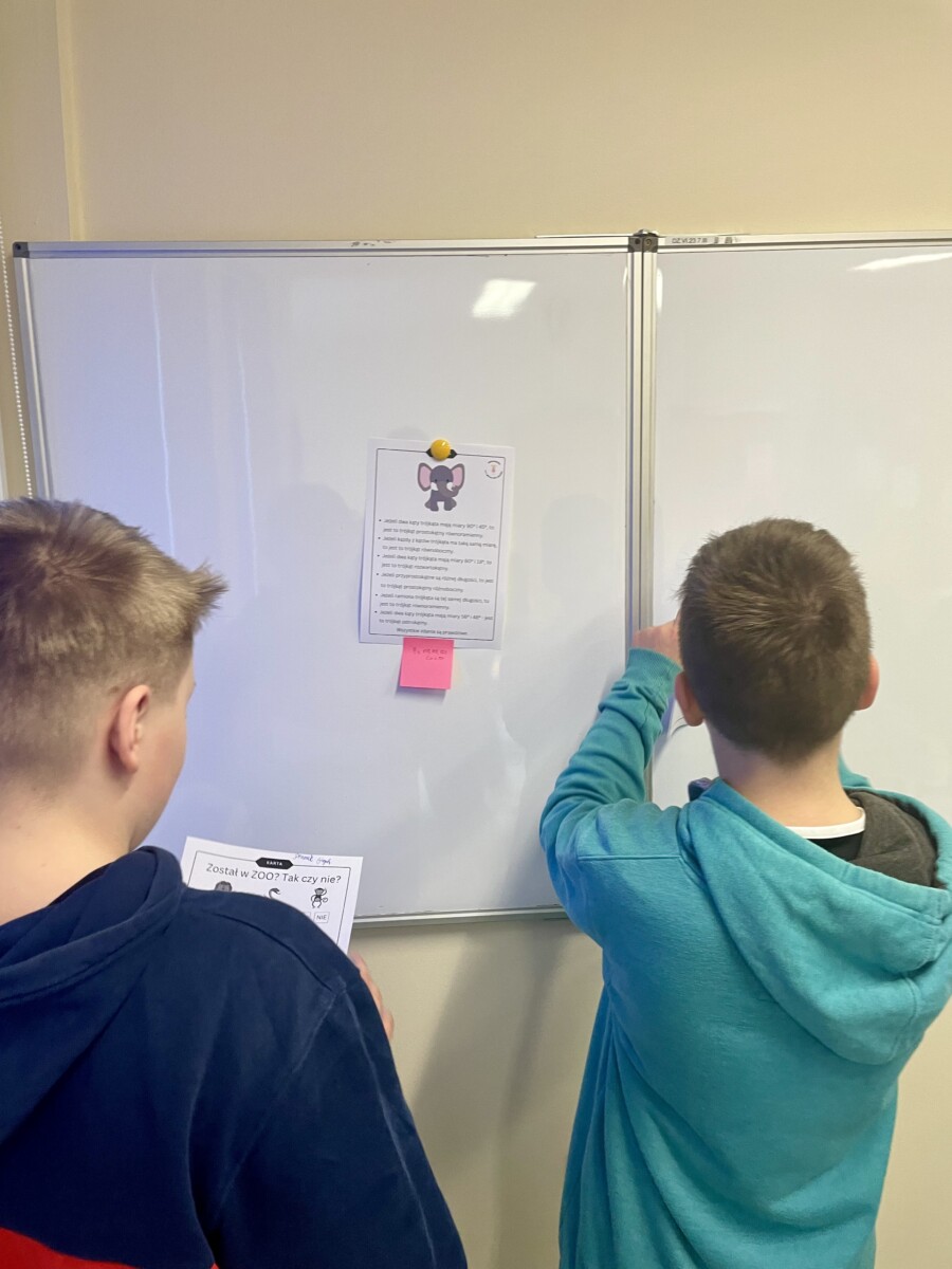 Na ostatniej lekcji matematyki uczniowie klasy 5 w ramach podsumowania i przygotowania do sprawdzianu z działu „Figury na płaszczyźnie” z wielkim zaangażowaniem, podjęli próbę rozwiązania zagadki „Kto uciekł z ZOO ?” Oto krótka relacja z tego dnia