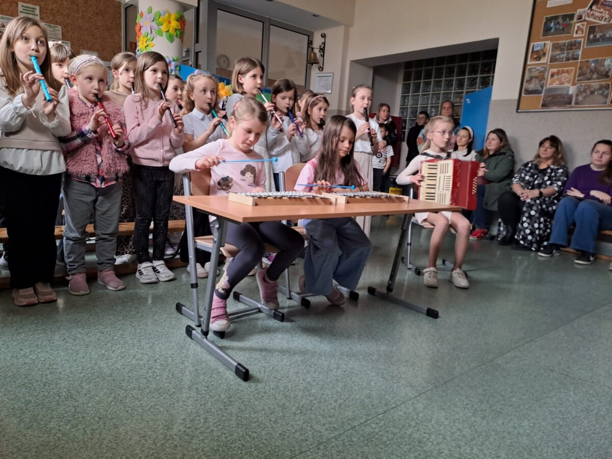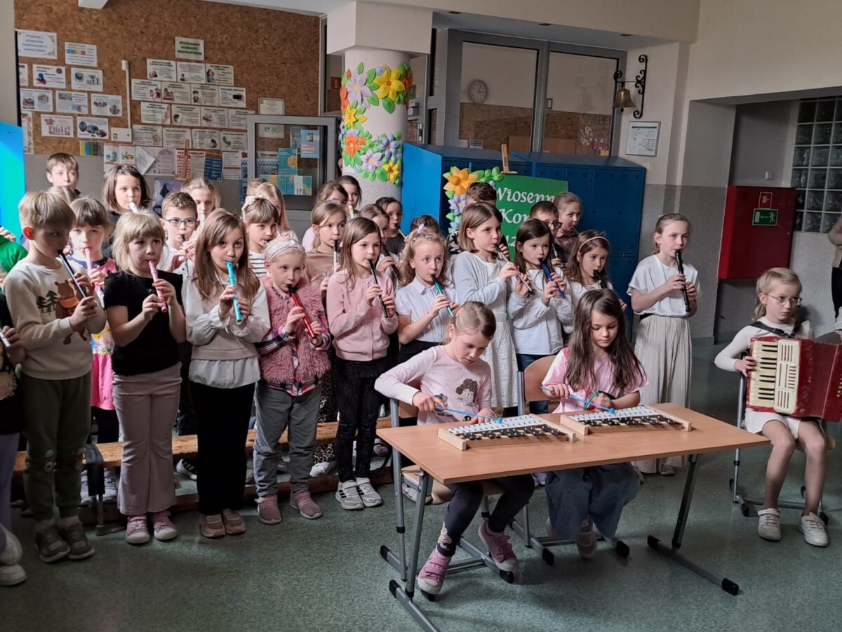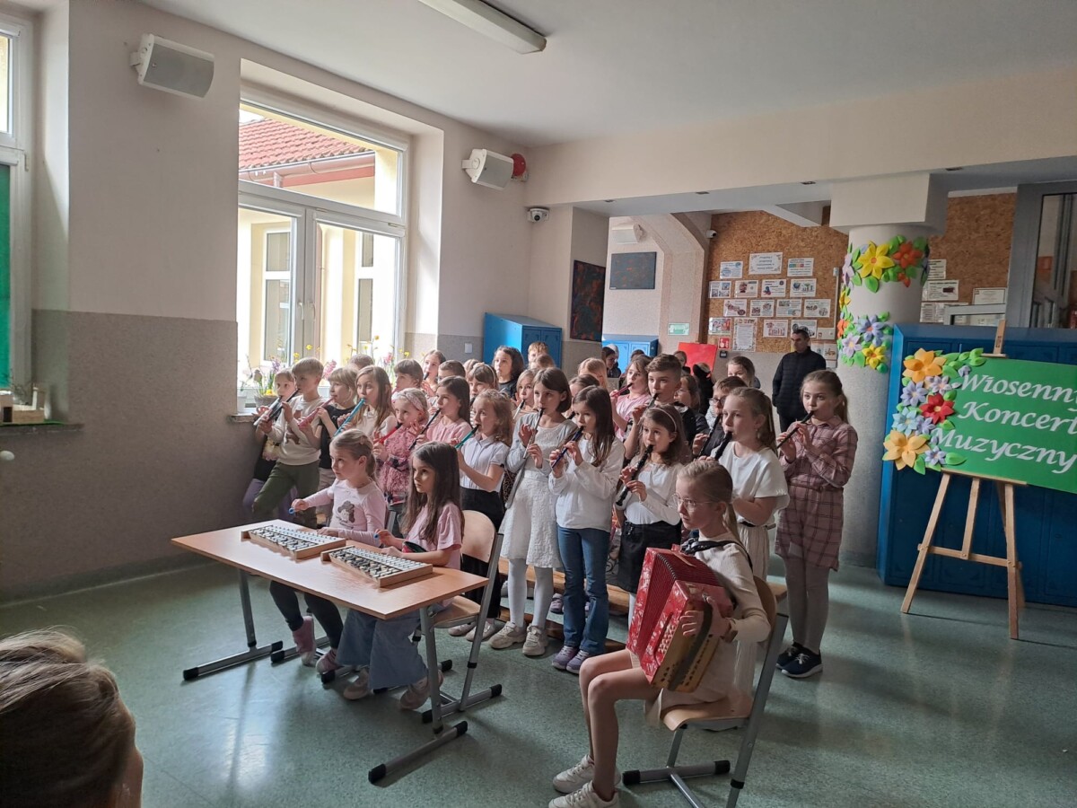 26 marca w naszej szkole odbył się Wiosenny Koncert Muzyczny. Swoje umiejętności gry na instrumentach muzycznych zaprezentowali uczniowie z klas I –III. Swoją przygodę z muzyką dzieci rozpoczęły we wrześniu w ramach zajęć świetlicowych. Co tydzień poznawały nowe utwory, które ćwiczyły w domu. Przez pół roku, dzieci opanowały grę nie tylko na flażoletach, fletach, ale również na dzwonkach chromatycznych i akordeonie. Na dzisiejszy koncert licznie przybyli Pani Dyrektor, nauczyciele, rodzice, a nawet dziadkowie. Na to muzyczne wydarzenie zostało przygotowanych 9 utworów. Dzieci z wielkim entuzjazmem i radością je zaprezentowały, włożyły w to dużo serca i ciężkiej pracy. Za swoje występy zostały nagrodzone gromkimi brawami.