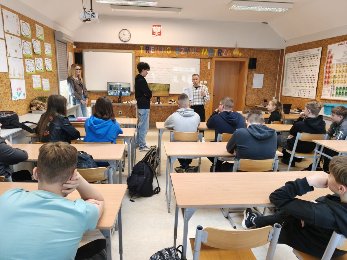 Na zaproszenie Małgorzaty Samson uczniowie klasy 7 mieli okazję wziąć udział w niezwykłych zajęciach doradztwa zawodowego z wykorzystaniem gogli VR, zorganizowanych w ramach projektu EduBus przy Wojewódzki Urząd Pracy w Opolu. Była to nowoczesna i angażująca forma poznawania świata zawodów.