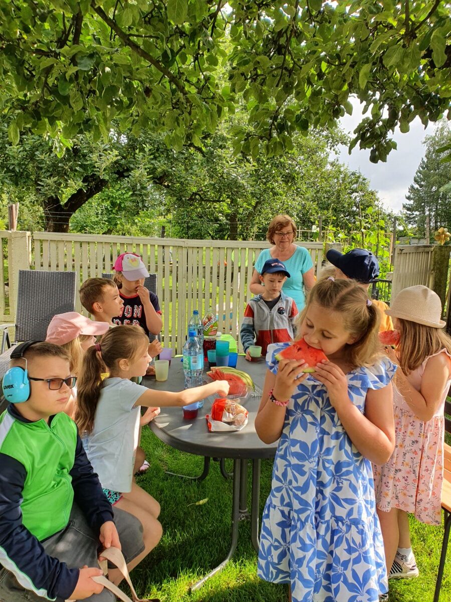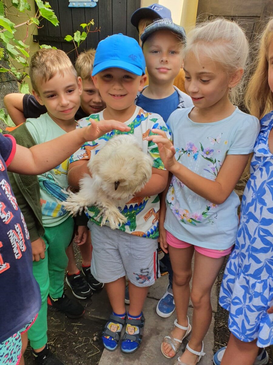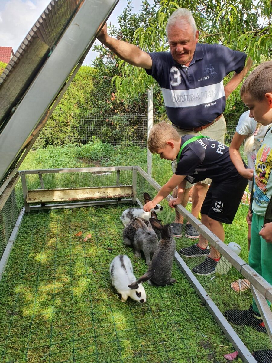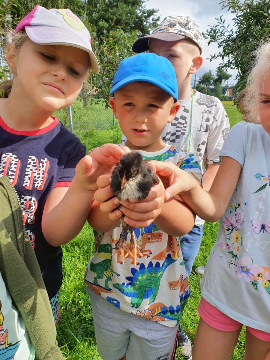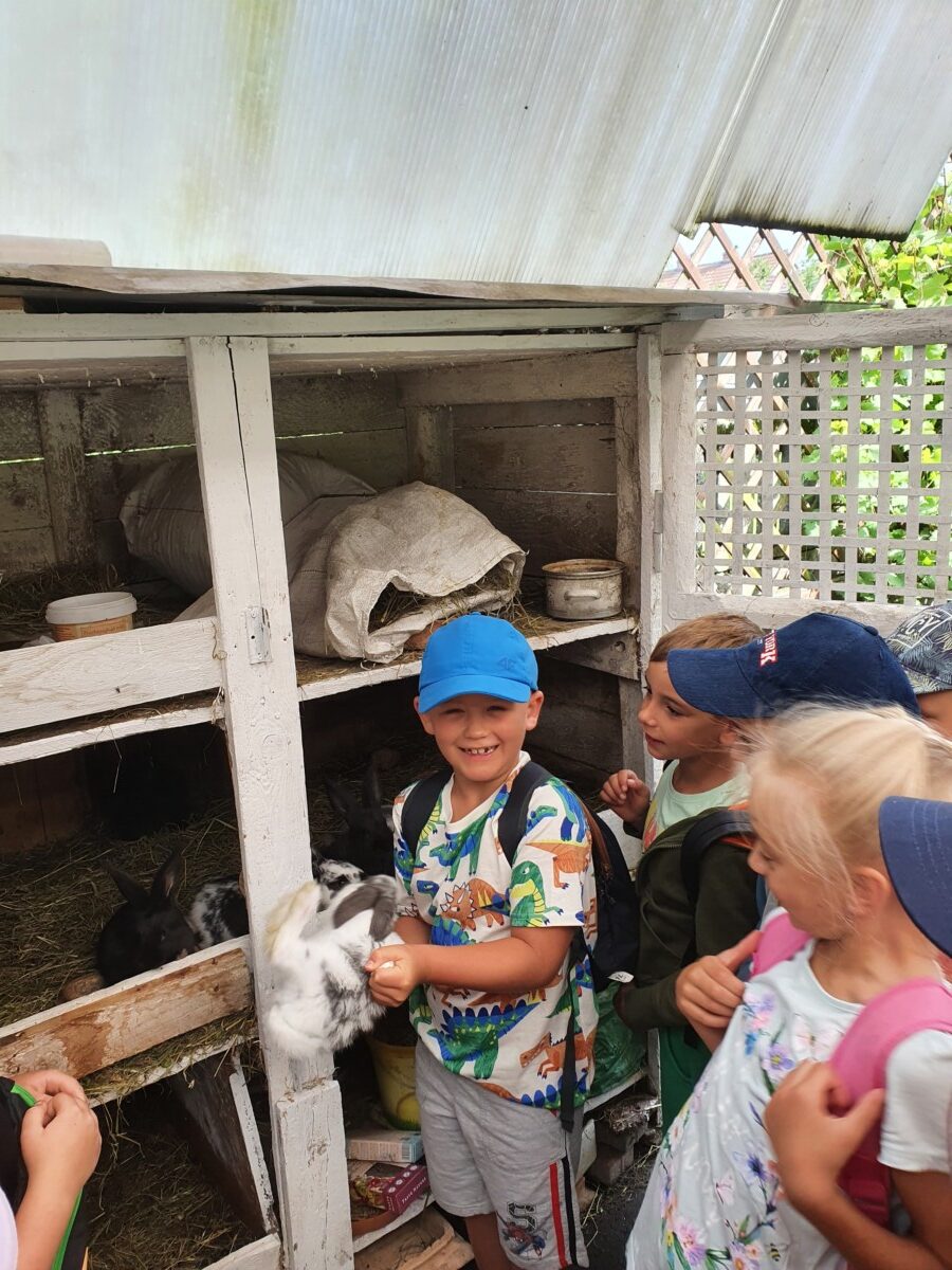 20 czerwca klasa 1b po raz ostatni w tym roku, wybrała się na wycieczkę do gospodarstwa wiejskiego państwa Ledwolorz. Uczeń kl.1b Aleksander Ledwolorz bardzo kocha zwierzęta. Obserwuje ich zachowania, codziennie je karmi i sprawdza, czy są zdrowe. Jego gospodarstwo to : króliki, kury, pies, kaczki, świnki morskie oraz papugi. Wizyta w tak uroczym miejscu była dla dzieci radosnym przeżyciem. Dziękujemy babci i dziadkowi Aleksandra za bardzo życzliwe przyjęcie i smaczny poczęstunek. Aleksander już zaprosił swoich kolegów na kolejne spotkanie z jego zwierzątkami . Marzeniem Aleksandra jest mieć osiołka. Życzymy mu spełnienia marzeń. Do zobaczenia za rok.