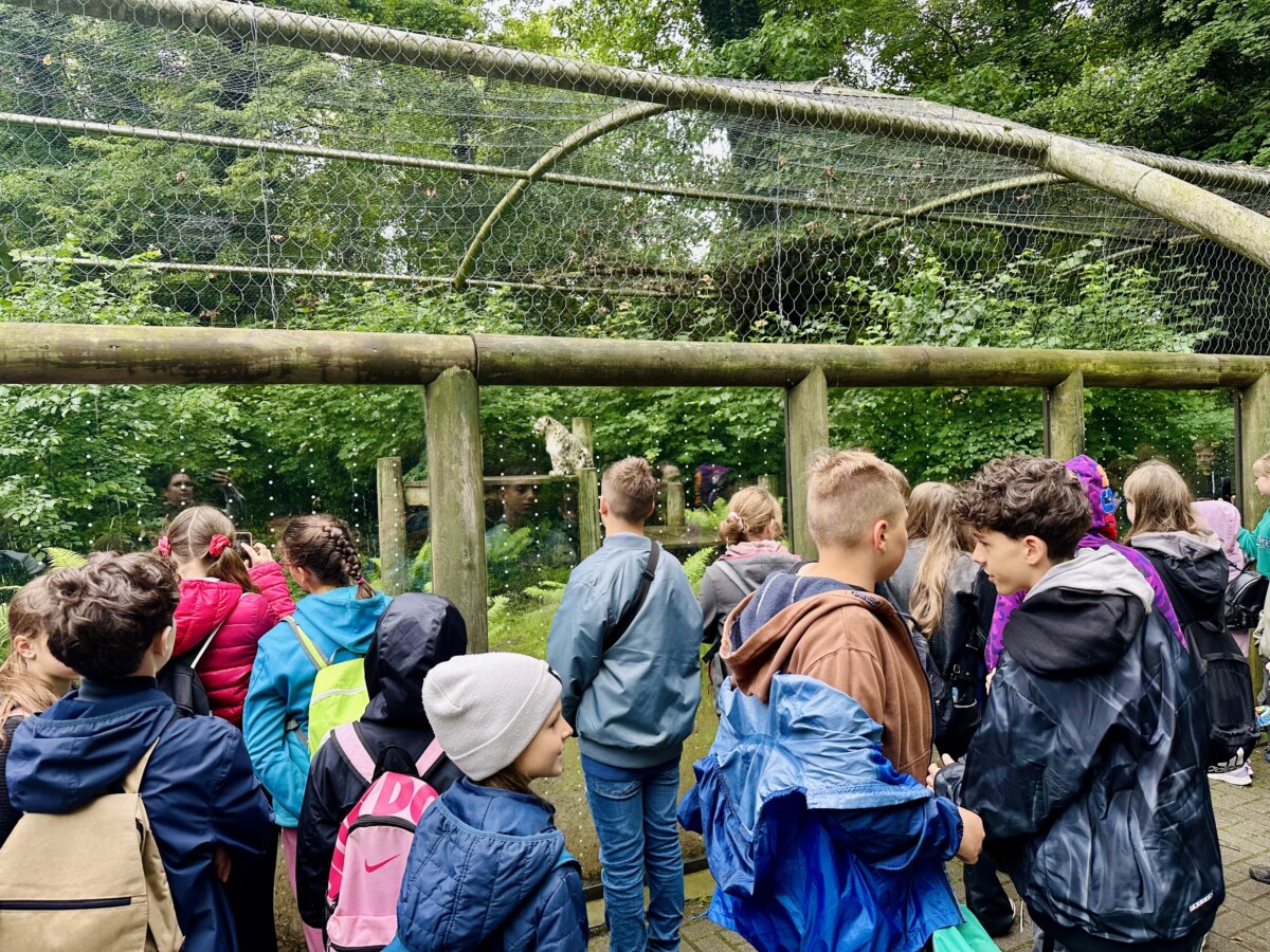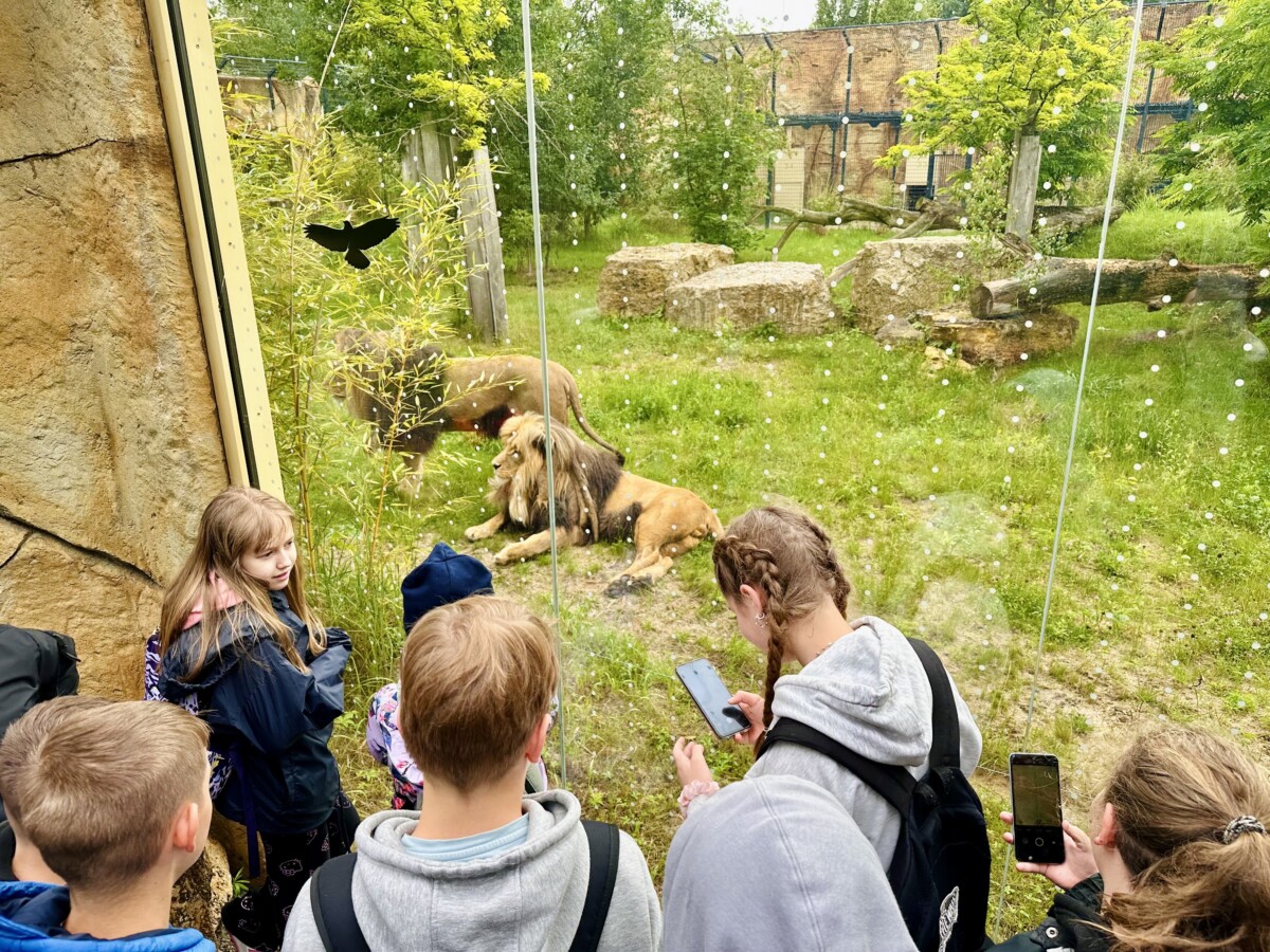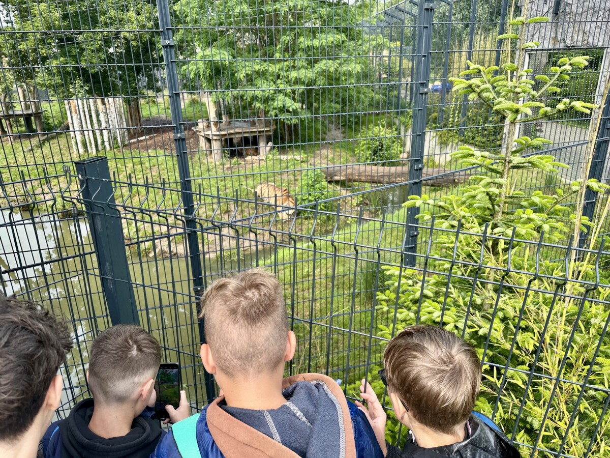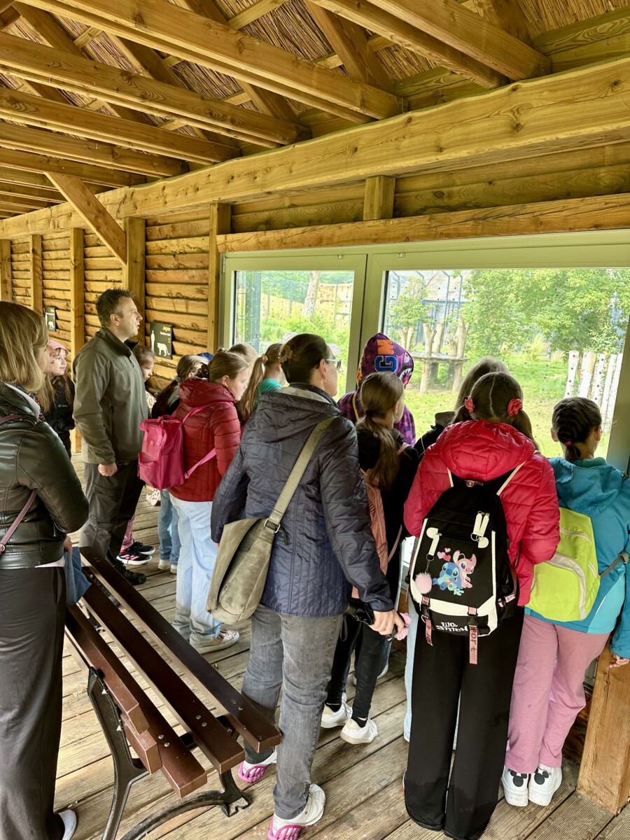 Zwiedzanie rozpoczęło się od spotkania z panem Marcinem – pracownikiem zoo, który w ciekawy sposób opowiedział o codziennym życiu w ogrodzie zoologicznym. Uczniowie dowiedzieli się, czym zajmuje się zoo, jak wygląda praca opiekuna zwierząt oraz co trzeba zrobić, by nim zostać. Pan Marcin podzielił się wieloma ciekawostkami – zdradził m.in., że opiekuje się dużymi kotami, takimi jak lwy i tygrysy, a także że niektóre zwierzęta otrzymują imię po pracowniku, jeśli urodziły się podczas jego zmiany.
