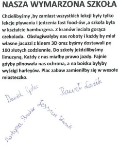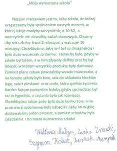 Szkoła to miejsce gdzie dzieci spędzają najwięcej czasu. Okazuje, się że można wyobrazić sobie szkołę , która spełniałaby wszystkie oczekiwania. Tak też zrobili uczniowie klasy IIIa, opisując szkołę swoich marzeń. Zapraszamy do lektury… .