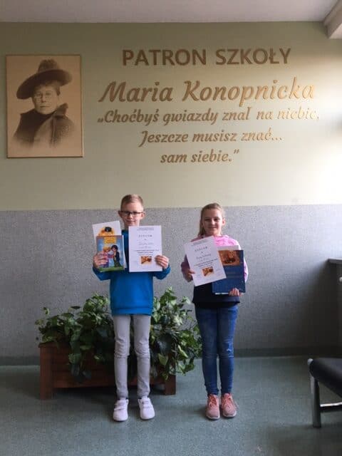 Hania Urbańska (klasa 3) – laureatka I miejsca i Dawid Glatki (klasa 3) – laureat II miejsca będą reprezentować nasza szkołę w międzyszkolnym konkursie recytatorskim, który odbędzie się już jutro.
