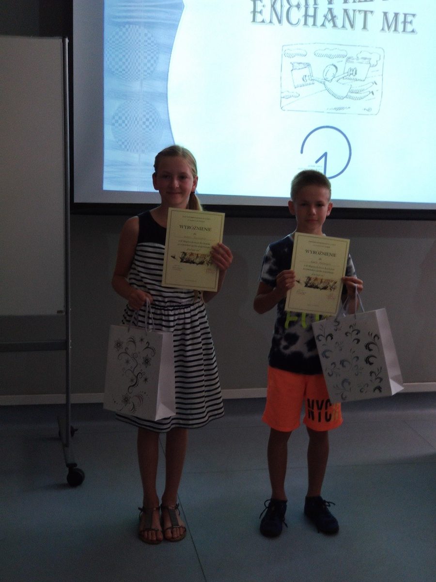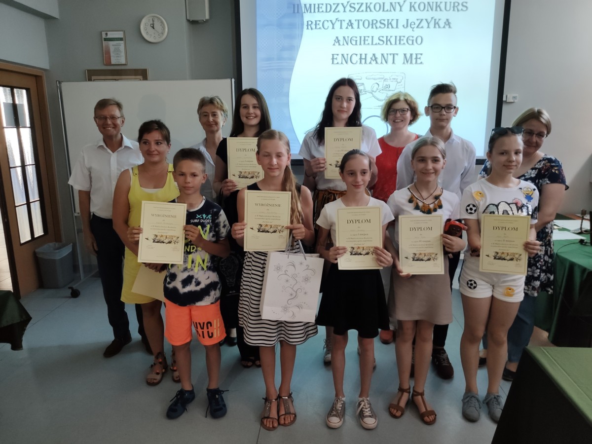 W dniu 12.06.2019 uczniowie naszej szkoły Wiktoria Kopczewska i Robert Malcharczyk wzięli udział w Międzyszkolnym konkursie recytatorskim języka angielskiego „Enchant me” skierowanym do uczniów opolskich szkół podstawowych i gimnazjów. Wykazali się znakomitą znajomością języka angielskiego oraz wyśmienitą pamięcią i umiejętnościami recytatorskimi. Dla komisji konkursowej składającej się z zaproszonych ekspertów w dziedzinie języka angielskiego wyłonienie zwycięzców nie było łatwym zadaniem. Nasi uczniowie zostali nagrodzeni wyróżnieniem.