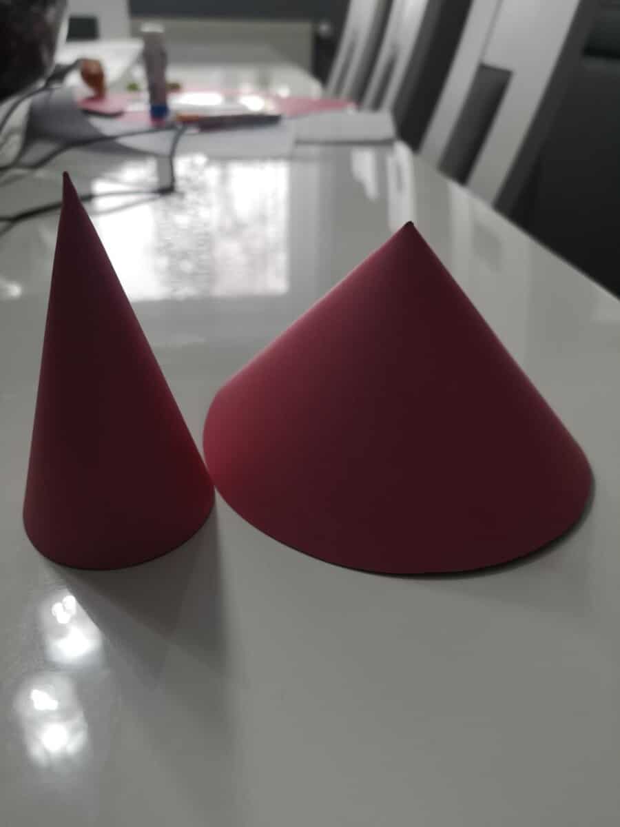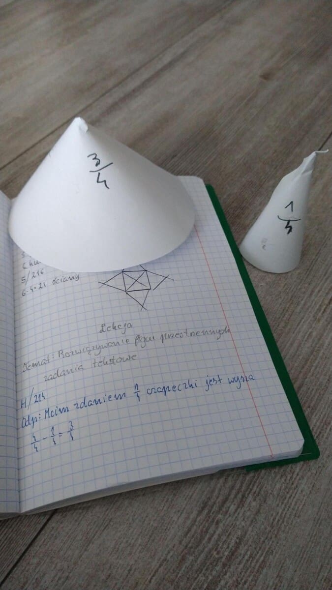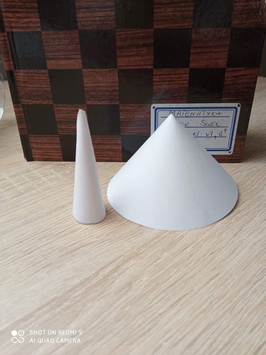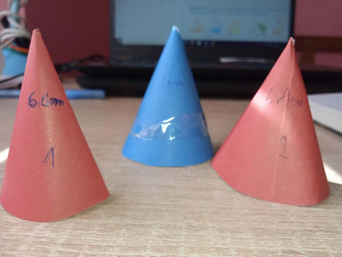 Klasa 6b w ramach zadania domowego, odkrywała różne formy stożka – w tym zadaniu jako czapeczki urodzinowej oraz z wycinków różnych części koła. Oto niektóre zdjęcie z ich matematycznego doświadczenia . Można zauważyć, że podstawą stożka jest koło a jego ściana boczna to “Pac-Man” –  komputerowa gra zręcznościowa stworzona przez przedsiębiorstwo Namco, wydana po raz pierwszy w 1980 roku !