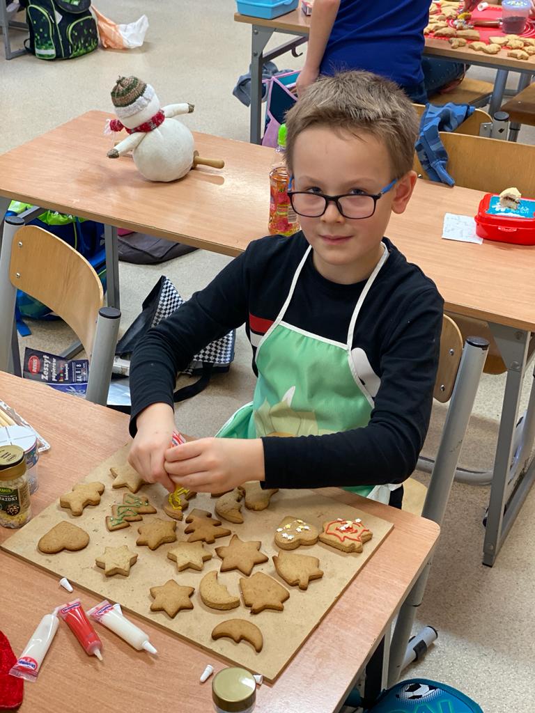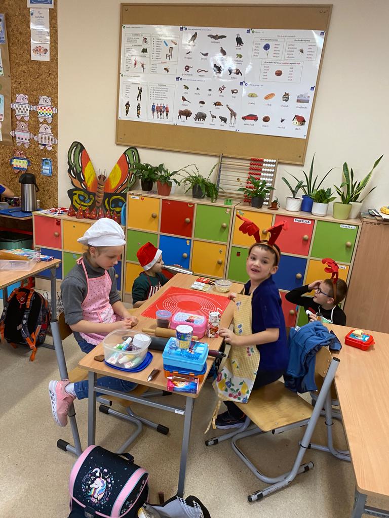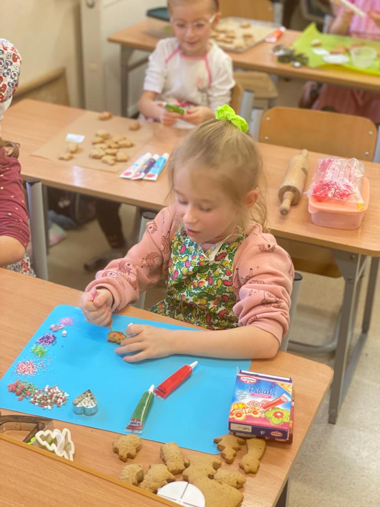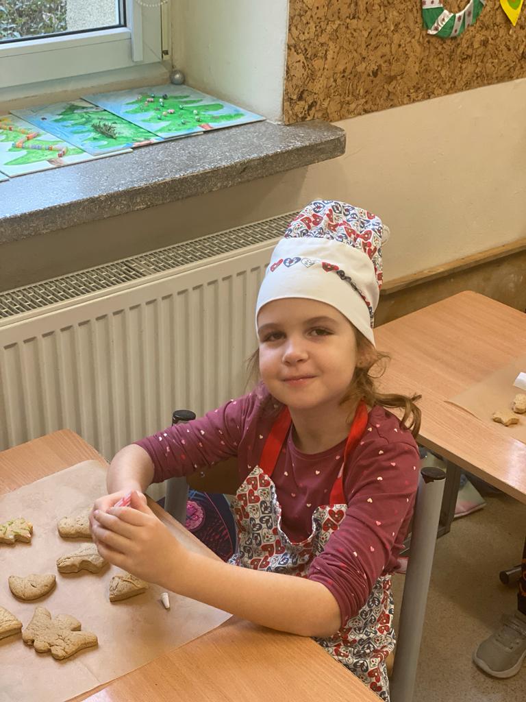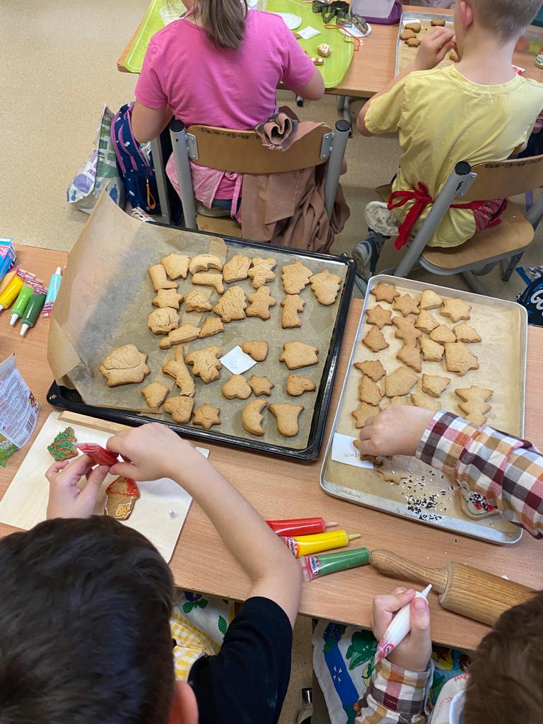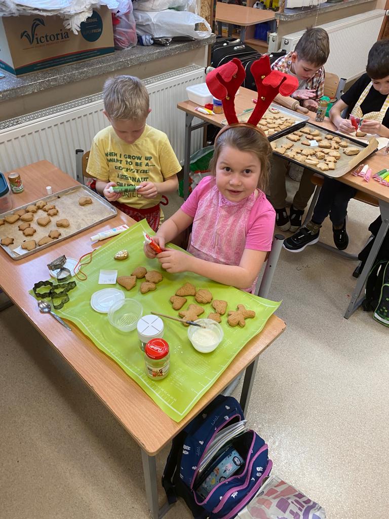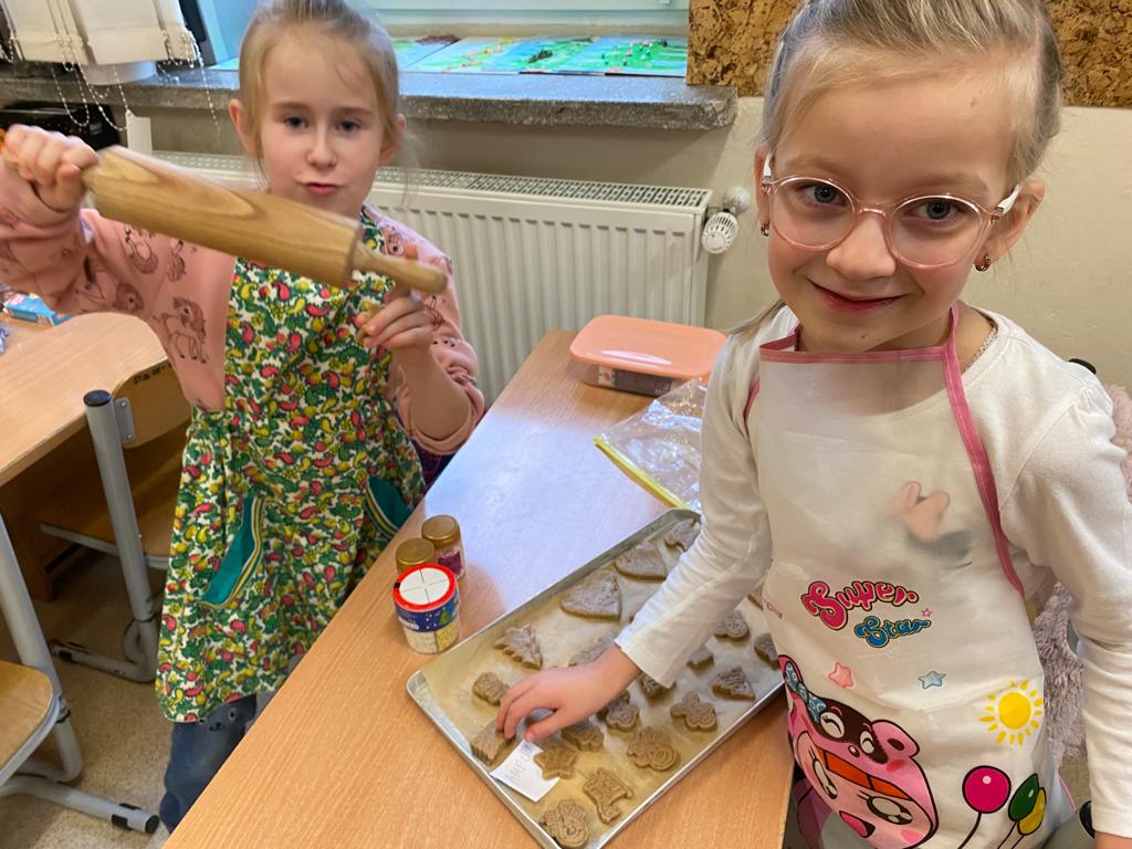 Boże Narodzenie nieodłącznie kojarzy się z zapachem pierników, doprawianych cynamonem, gałką muszkatołową czy imbirem, a wypiekanie ich to niemal rodzinne święto, na które cieszyły się w szczególności dzieci z klasy 1a. Piernik to nic innego jak ciasto wypiekane z mąki pszennej i żytniej, do której uczniowie klasy 1a dodali rozpuszczony, gorący miód, masło i jajka. Z rozwałkowanego ciasta o głębokim, brązowym kolorze uczniowie wykrawali różnorodne kształty, które kojarzą się ze Świętami: bałwanki, renifery, gwiazdki i Mikołaje. Przysmak ten to obok karpia, pierogów i kapusty z grzybami prawdziwy symbol polskich Świąt Bożego Narodzenia.
