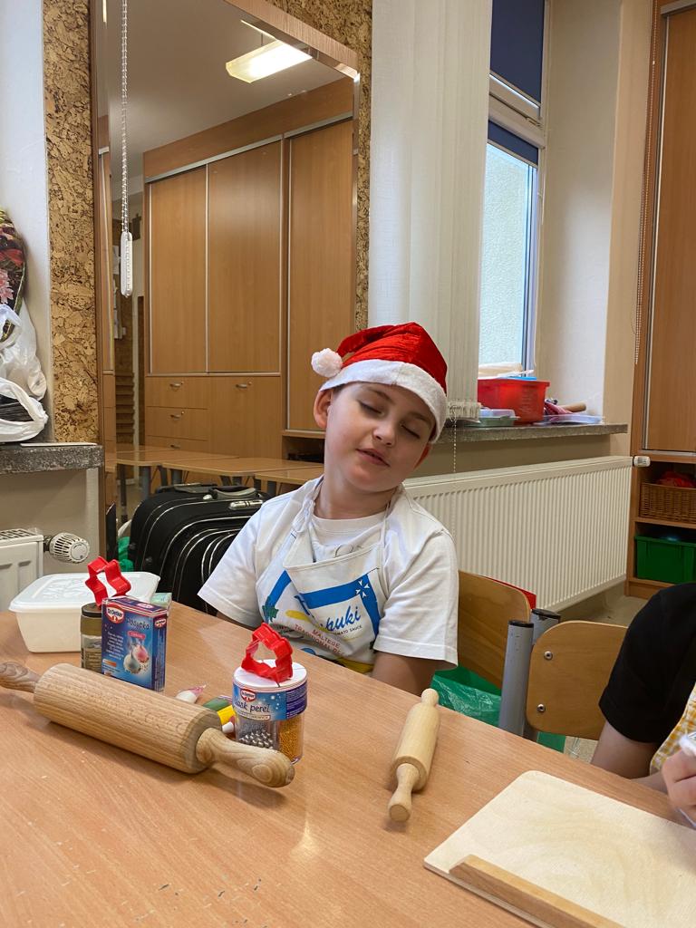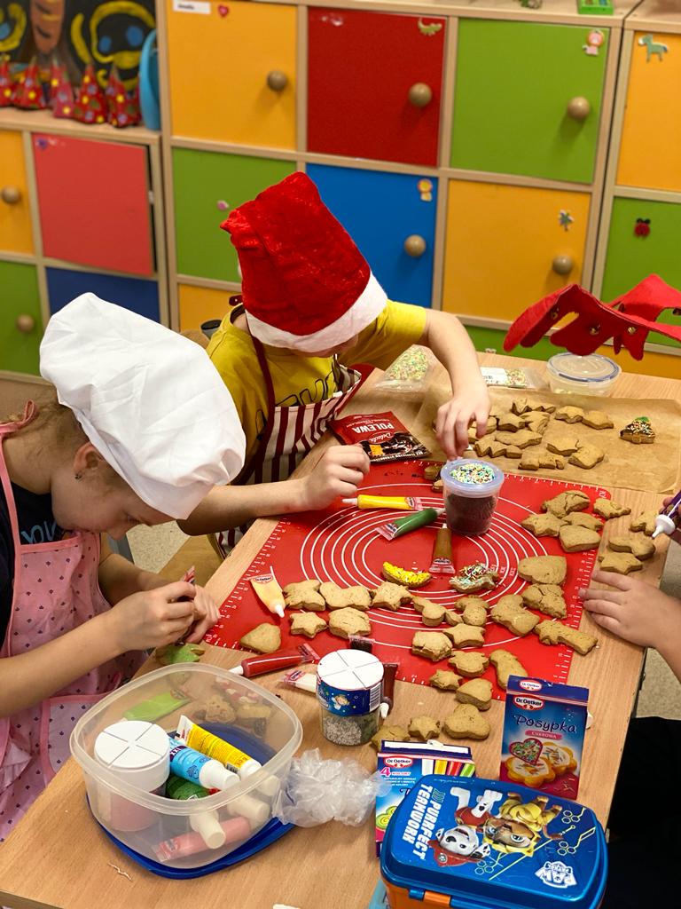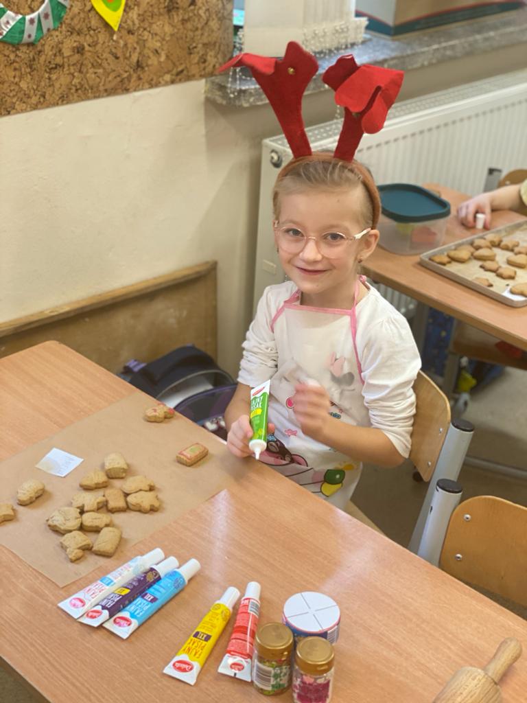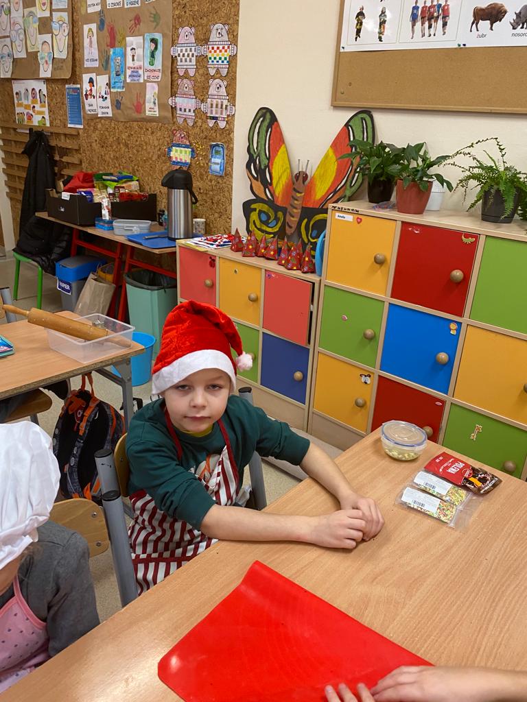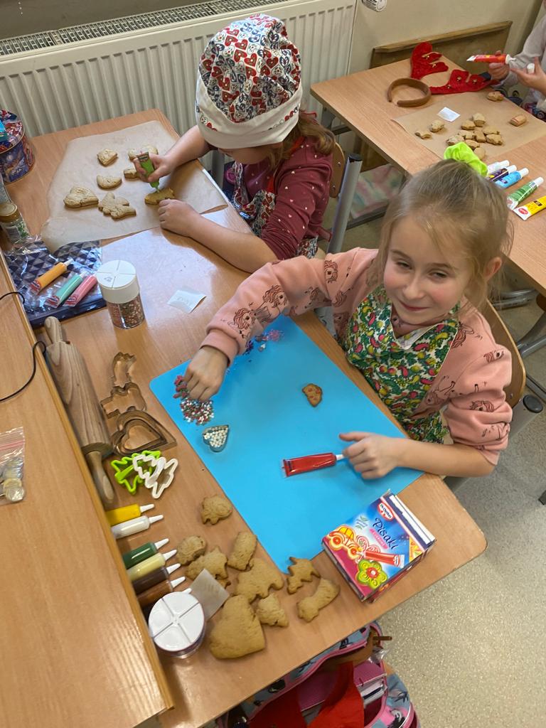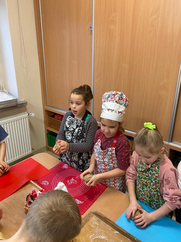 Boże Narodzenie nieodłącznie kojarzy się z zapachem pierników, doprawianych cynamonem, gałką muszkatołową czy imbirem, a wypiekanie ich to niemal rodzinne święto, na które cieszyły się w szczególności dzieci z klasy 1a. Piernik to nic innego jak ciasto wypiekane z mąki pszennej i żytniej, do której uczniowie klasy 1a dodali rozpuszczony, gorący miód, masło i jajka. Z rozwałkowanego ciasta o głębokim, brązowym kolorze uczniowie wykrawali różnorodne kształty, które kojarzą się ze Świętami: bałwanki, renifery, gwiazdki i Mikołaje. Przysmak ten to obok karpia, pierogów i kapusty z grzybami prawdziwy symbol polskich Świąt Bożego Narodzenia.