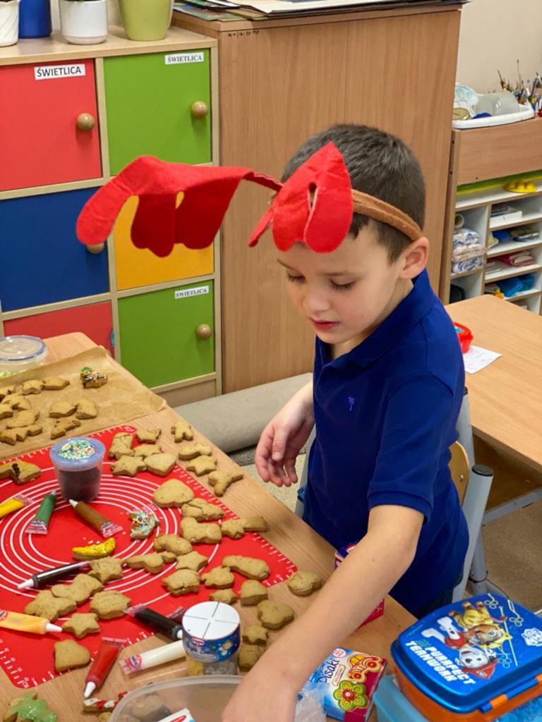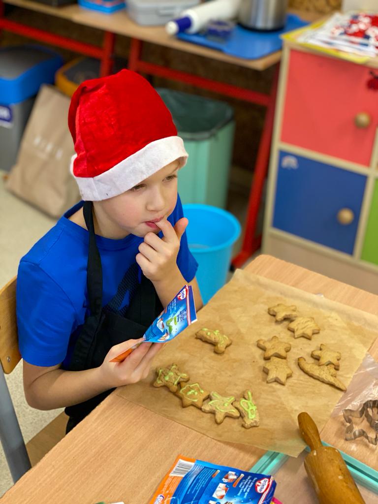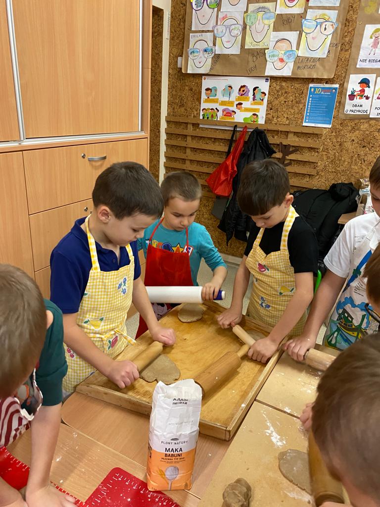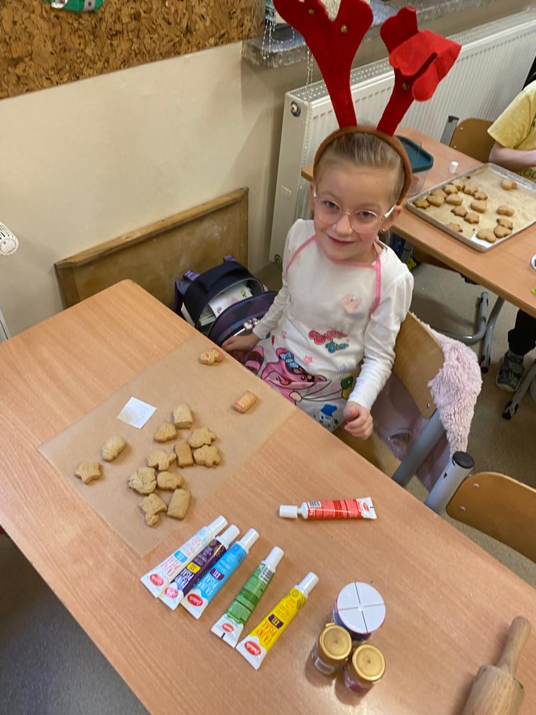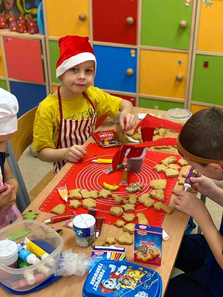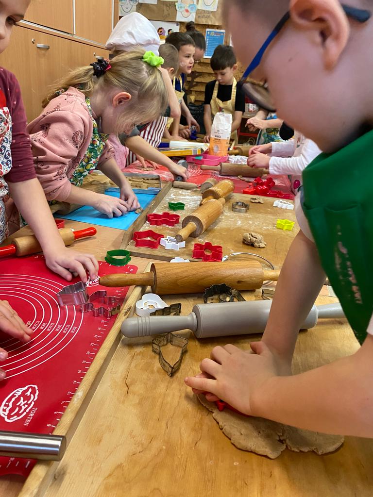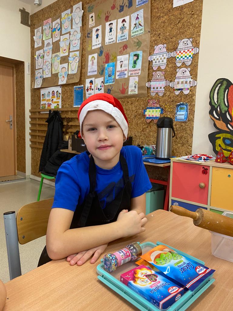 Boże Narodzenie nieodłącznie kojarzy się z zapachem pierników, doprawianych cynamonem, gałką muszkatołową czy imbirem, a wypiekanie ich to niemal rodzinne święto, na które cieszyły się w szczególności dzieci z klasy 1a. Piernik to nic innego jak ciasto wypiekane z mąki pszennej i żytniej, do której uczniowie klasy 1a dodali rozpuszczony, gorący miód, masło i jajka. Z rozwałkowanego ciasta o głębokim, brązowym kolorze uczniowie wykrawali różnorodne kształty, które kojarzą się ze Świętami: bałwanki, renifery, gwiazdki i Mikołaje. Przysmak ten to obok karpia, pierogów i kapusty z grzybami prawdziwy symbol polskich Świąt Bożego Narodzenia.