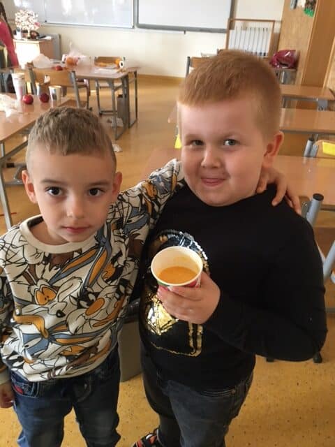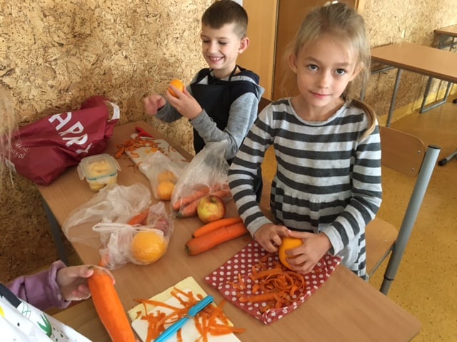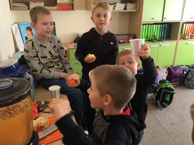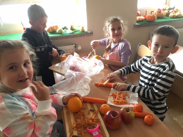 W ramach październikowych obchodów – Światowego Dnia Żywności , uczniowie za zajęciach rozwijających kreatywność uczyli się samodzielnego przygotowania soku z marchewki, pomarańczy i jabłka. Ponieważ na lekcjach poznali już zagadnienie piramidy zdrowego żywienia i aktywności fizycznej, zajęcia okazały się bardzo przydatne, przy okazji uczniowie poznali wartości odżywcze i zdrowotne marchewki, jabłka i pomarańczy.