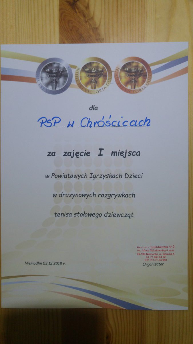 W dniu 3.12.2018r. w Niemodlinie odbył się finał powiatu  drużynowy w   tenisie stołowym.Bezkonkurencyjne były nasze uczennice Karolina Lisowska i Iza Matros.Wszystkie mecze wygrały po 3:0, tym samym wysoko podnosząc poprzeczkę.Wygrały z PSP Łubniany, PSP Osowiec, PSP 1 i PSP 2 Niemodlin.Awansowały do finału wojewódzkiego, który odbędzie się 12 grudnia w Niemodlinie. Opiekę trenerską nad naszą drużyną sprawował Marcin Kondziela.